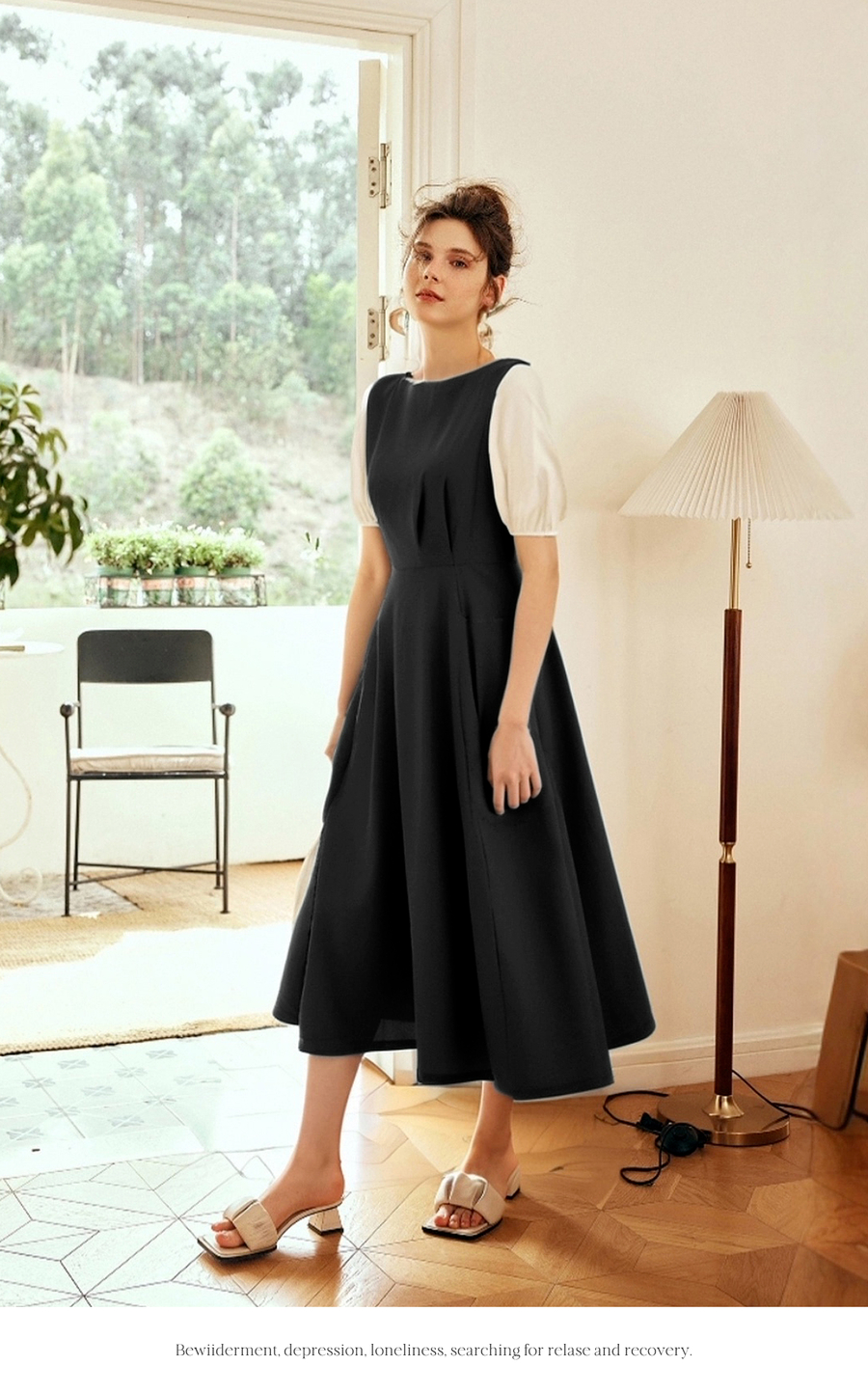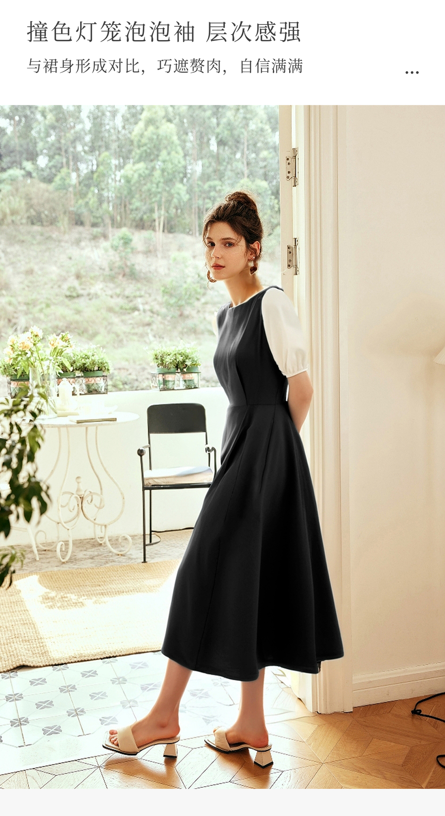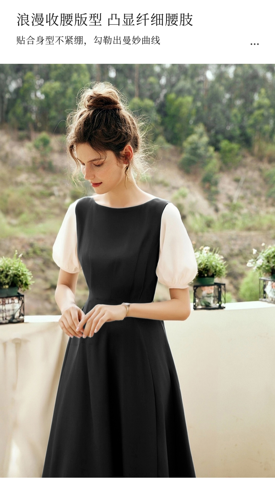 OLrain欧芮儿2025夏季新款黑色撞色袖收腰显瘦法式连衣裙一字领女