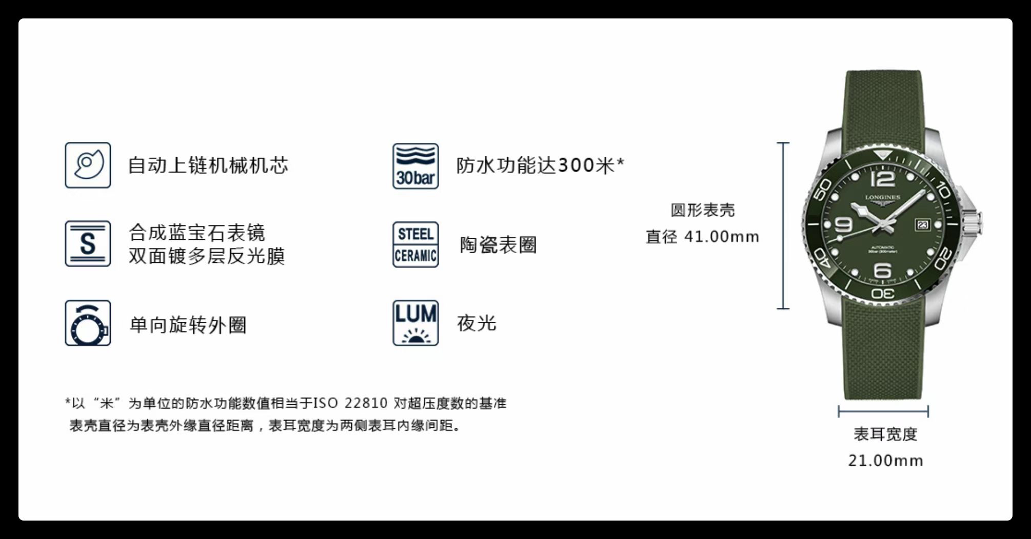 LONGINES 浪琴 康卡斯潜水系列Ø 41/43mm自动机械男士腕表 64小时动力存储 橡胶表带和精钢表带2款可选 全新专柜发货 全国联保