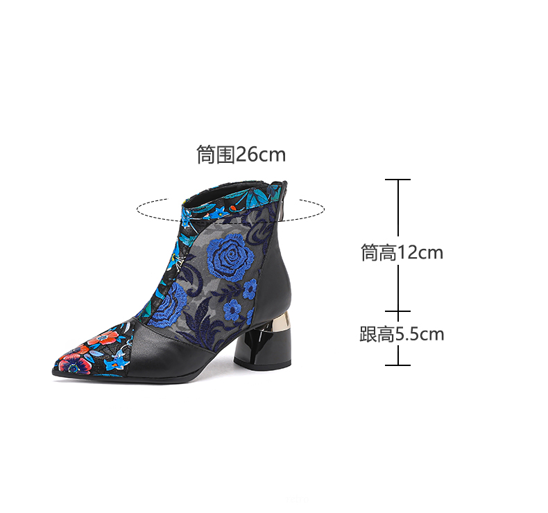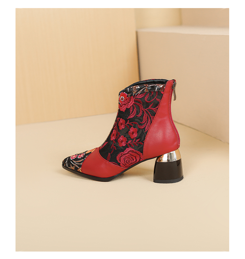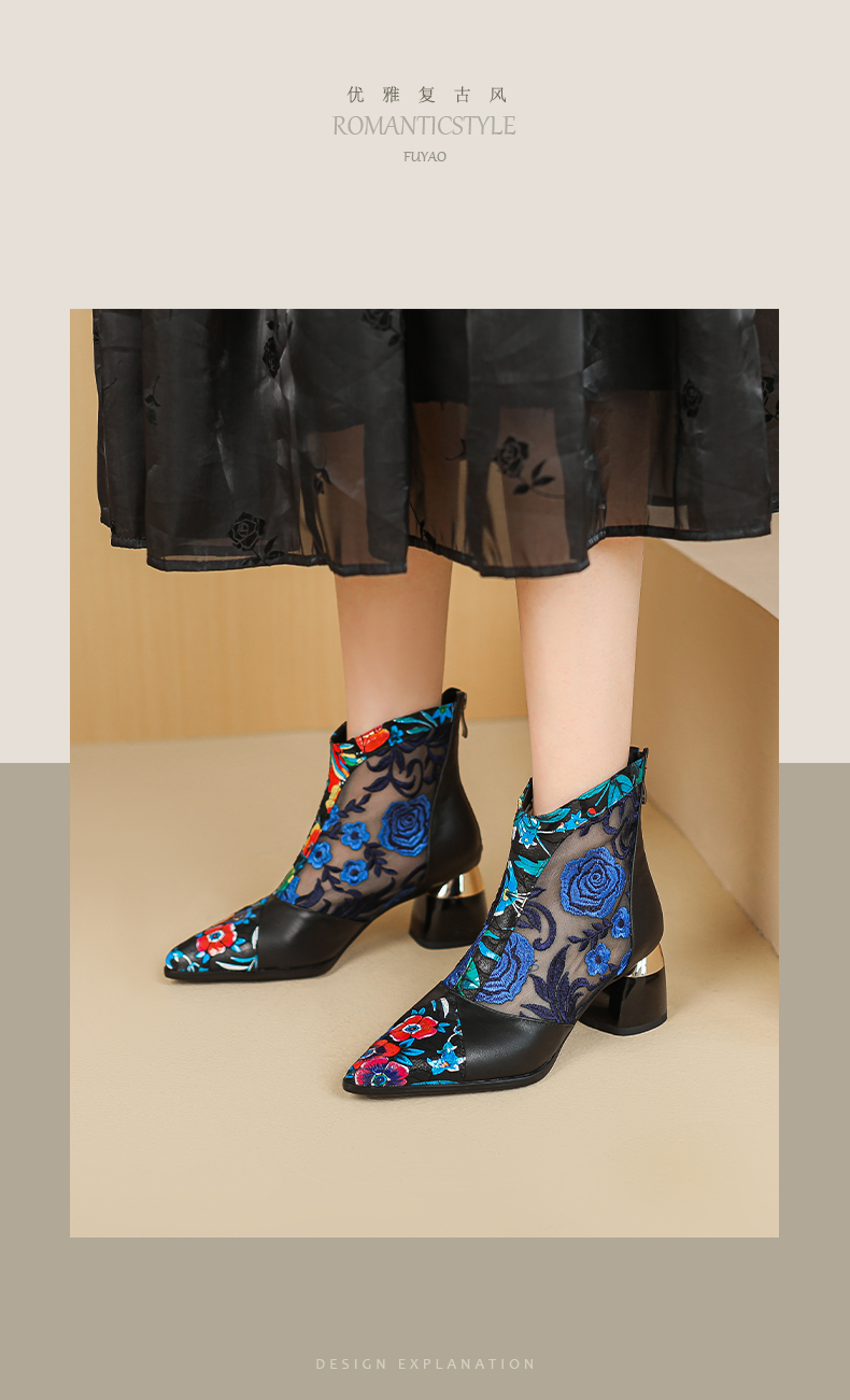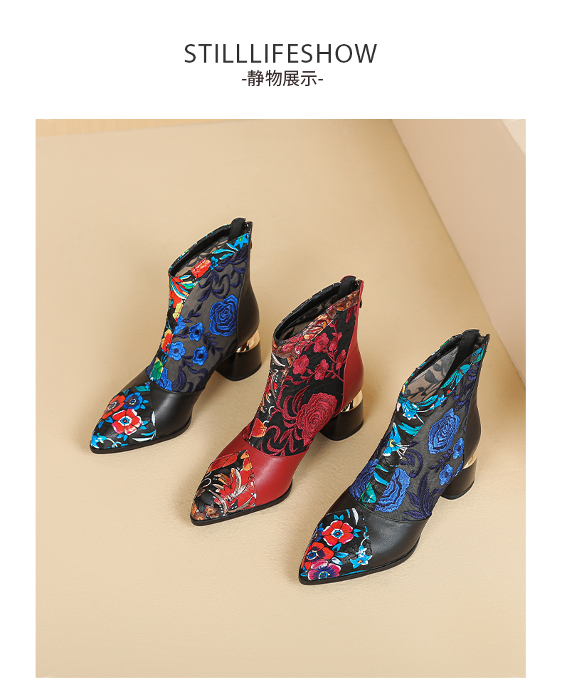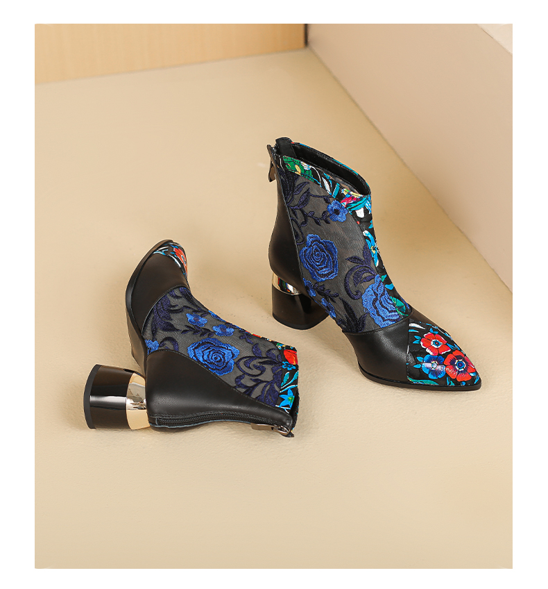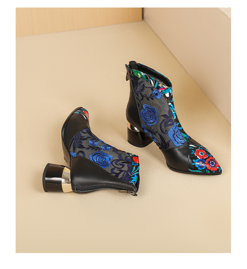 【预售5天】春夏新款,复古民族风刺绣网纱拼接尖头粗跟短靴JJ-224-2