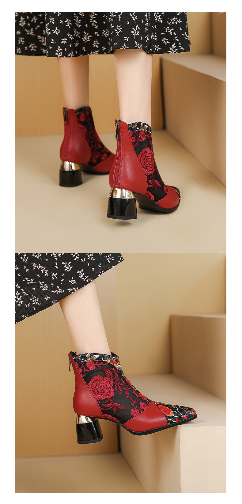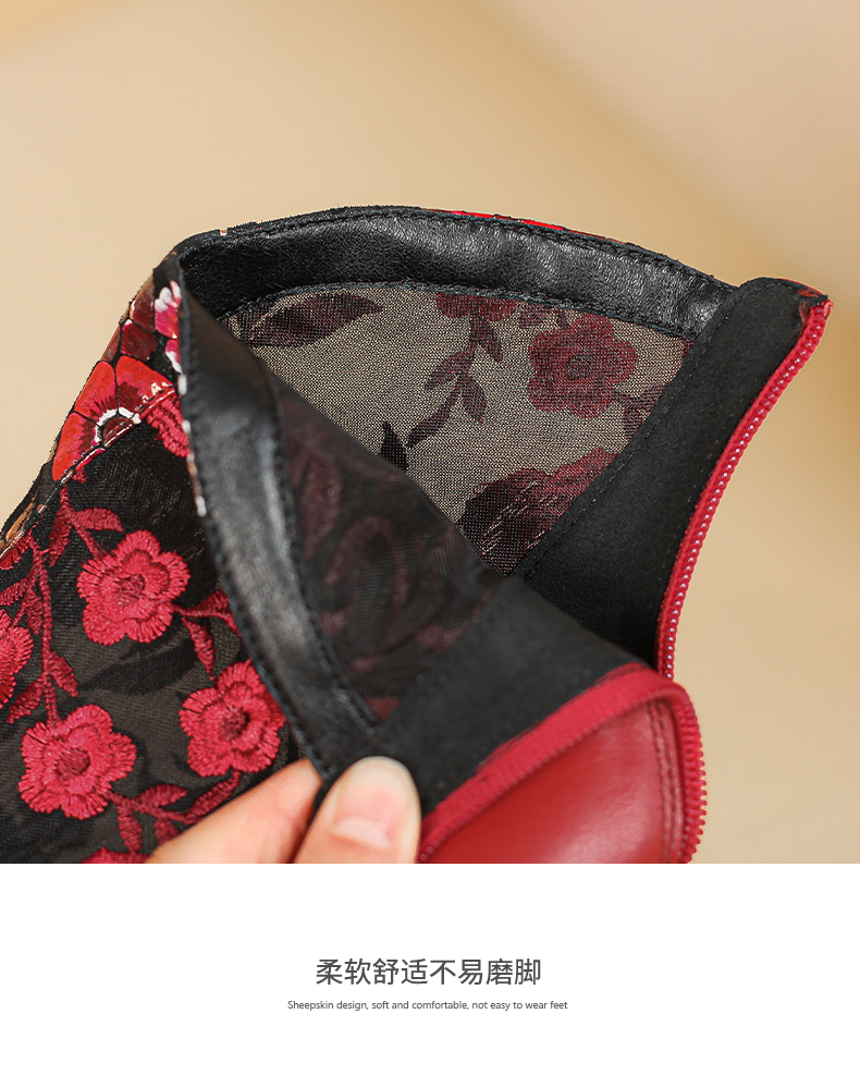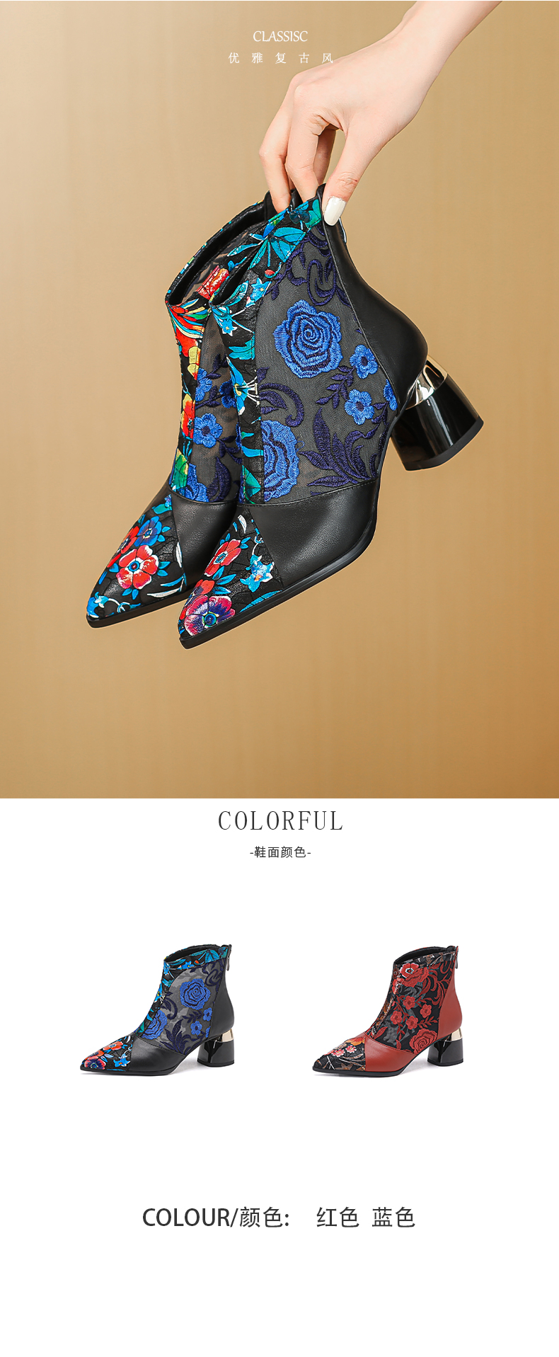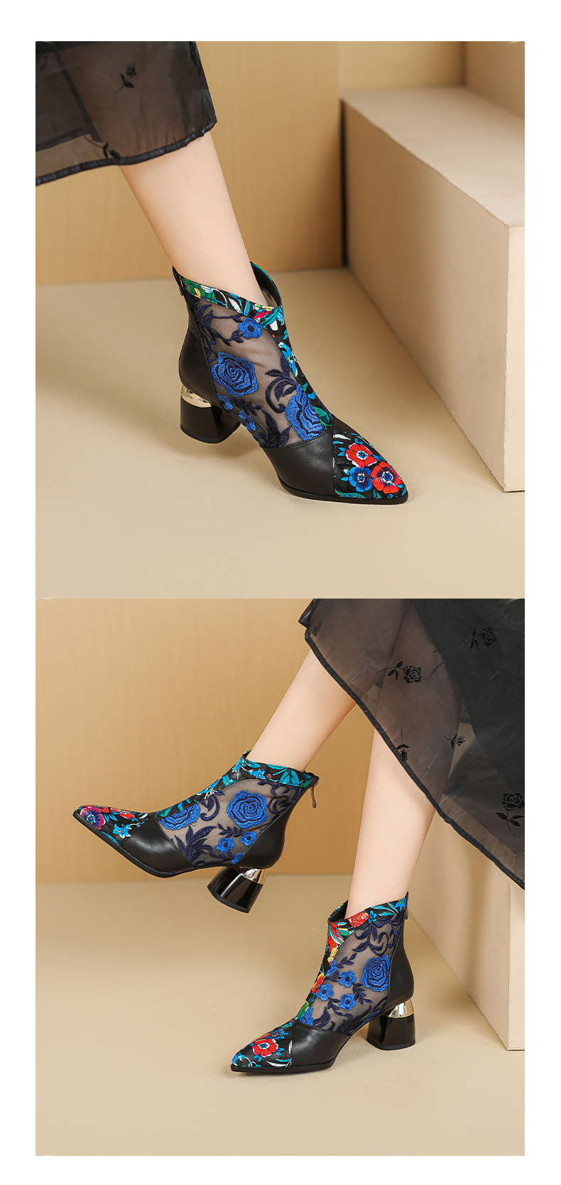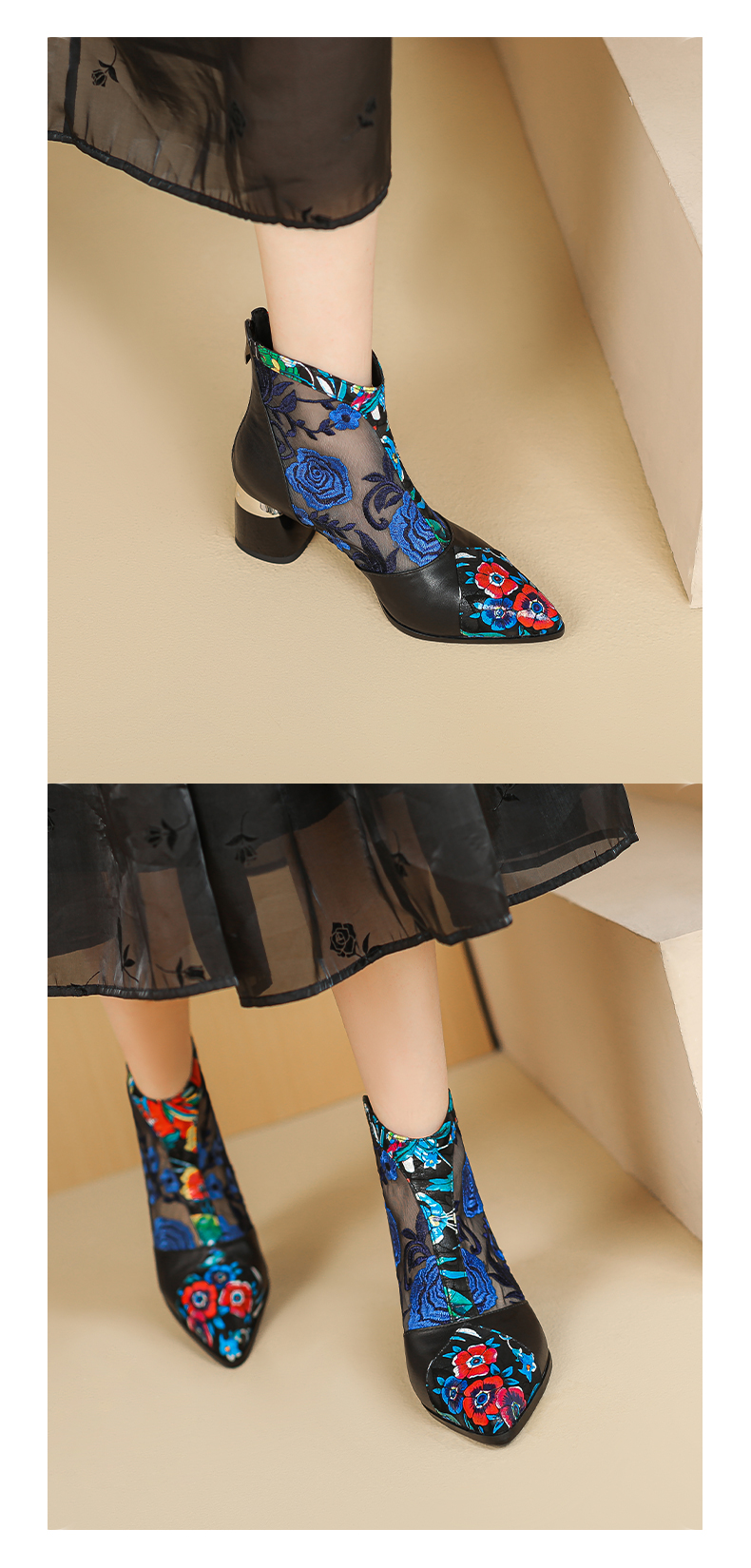 【预售5天】春夏新款,复古民族风刺绣网纱拼接尖头粗跟短靴JJ-224-2