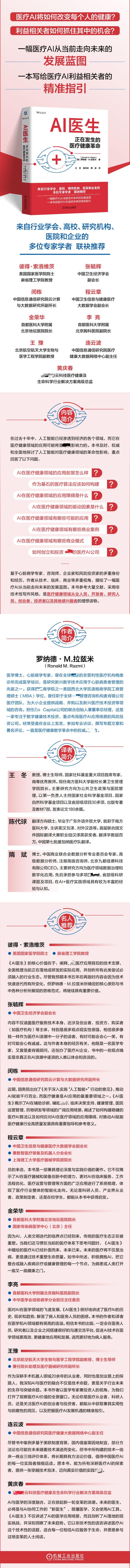 罗纳德·M.拉兹米(Ronald M. Razmi),医学博士,心脏病学专家,曾在全球很好的非营利性医疗机构梅奥诊所完成医学培训,是研究新兴数字技术应用于心脏病患者管理的先驱之一。获得很好商学院之一美国西北大学凯洛格商学院工商管理硕士(MBA)学位,曾任职于全球很好管理咨询机构麦肯锡公司医疗团队,为大小企业提供战略、并购以及新兴医疗技术投资等领域的咨询。担任Zoi Capital公司的联合创始人兼董事总经理,这是一家专注于数字健康技术投资、重点布局医疗AI应用场景的风险投资公司。经常受邀在会议上发言,参加专业访谈,撰写专题文章和署名评论,一直是医疗健康数字革命中的权威发声者。