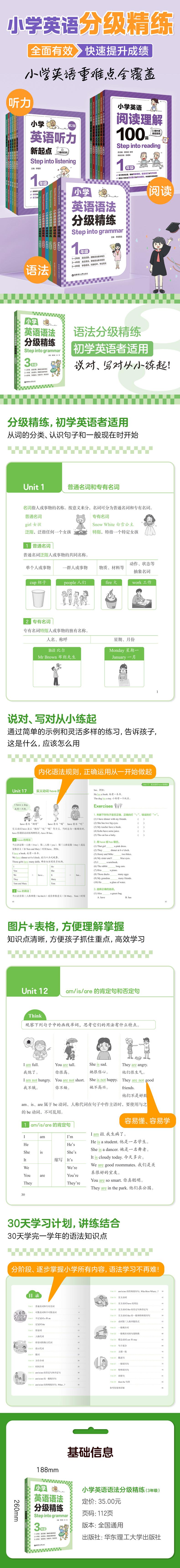 《小学英语语法分级精练》为针对小学1年级——6年级的语法练习,采用讲练结合,以练为主的编排方式,帮助学生练透语法、学透语法。套书根据不同年级的考查要求,将知识点分至各个年级。图书特色在于:1. 适用性强:根据不同年级的考查重点、题型要求设置,难度适中,题型全面;2. 配有图片,图片帮助理解和记忆,低年级部分练习以图片为主;3. 低年级题型灵活,并非真正做题,而是帮助学生理解语法概念;4. 特含标点符号使用规范讲解和练习。