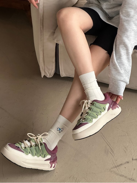 ▹ 夜曲紫 面包鞋的轮廓整体看起来 圆滚滚,标志性设计点就是鞋侧的小萝卜元素以及后跟融化的冰淇淋,