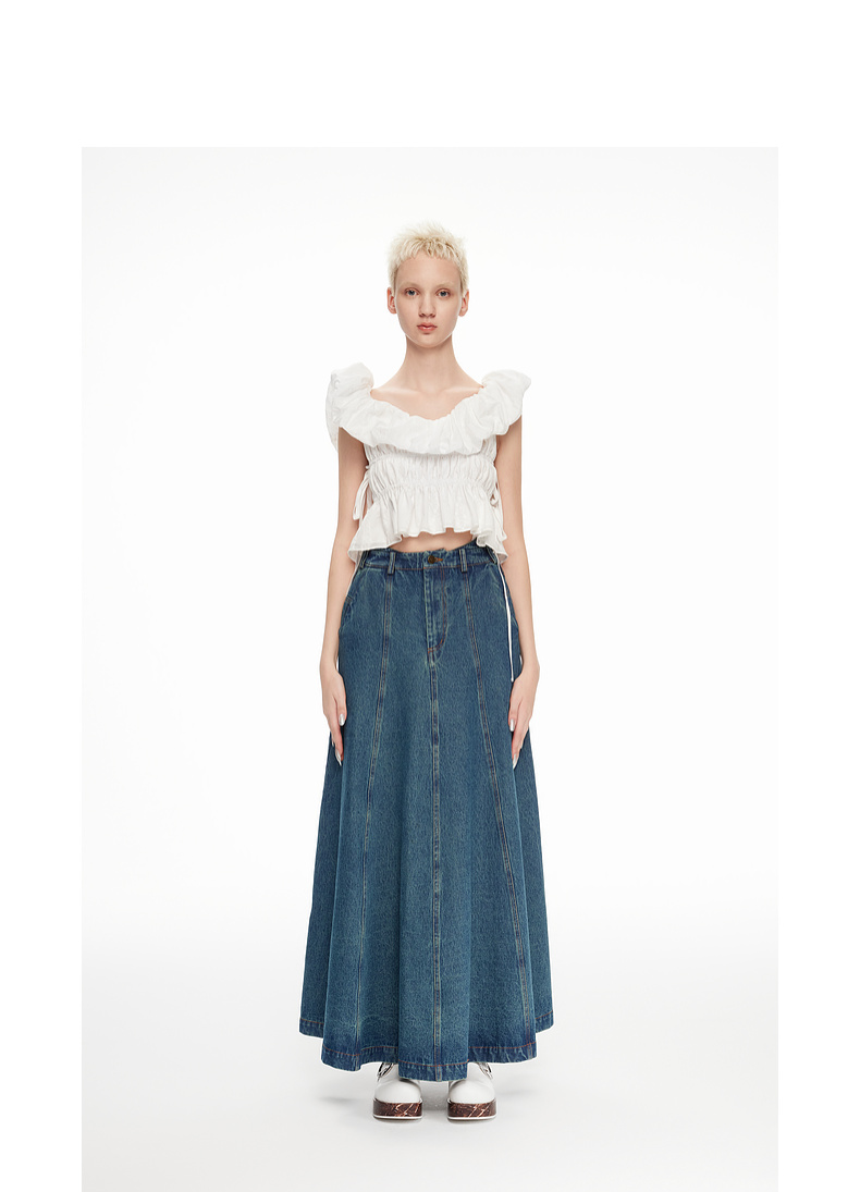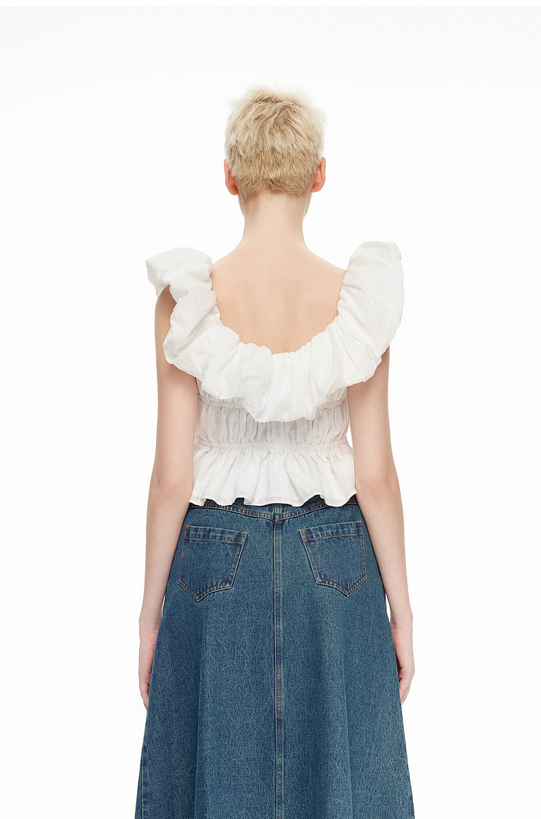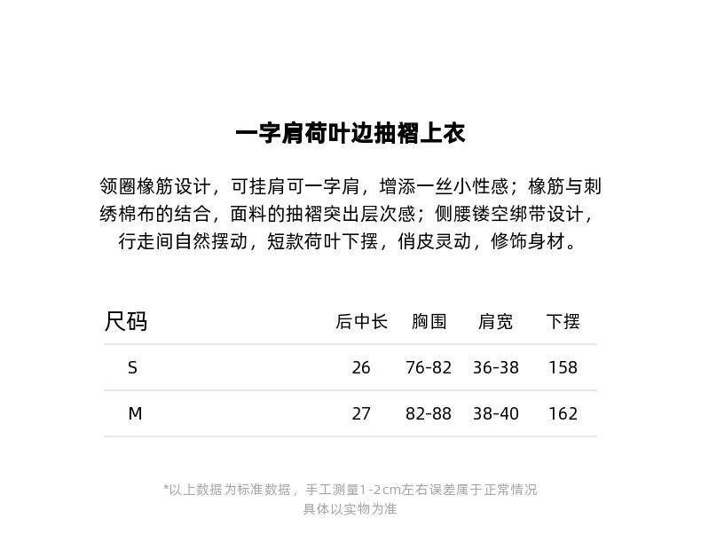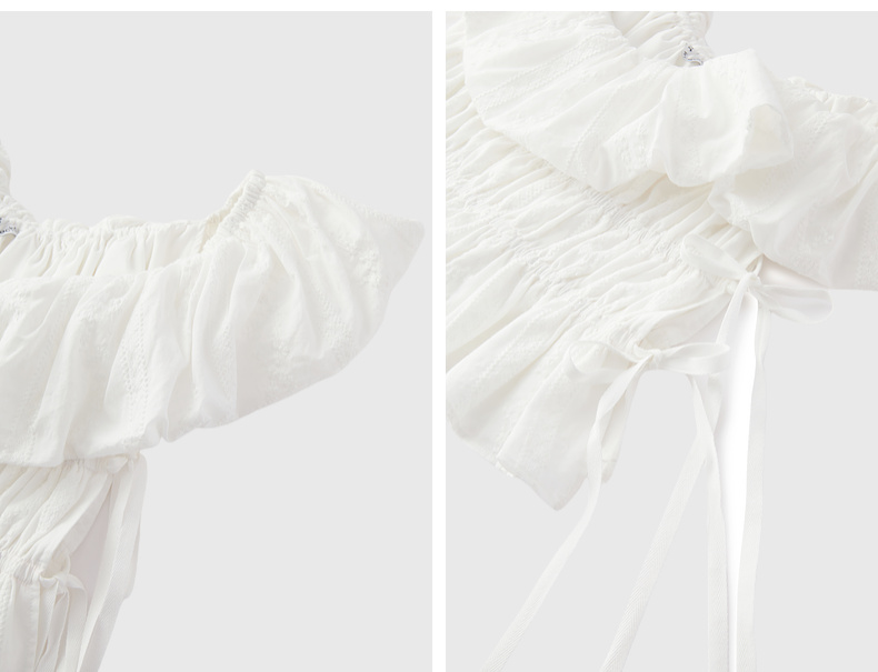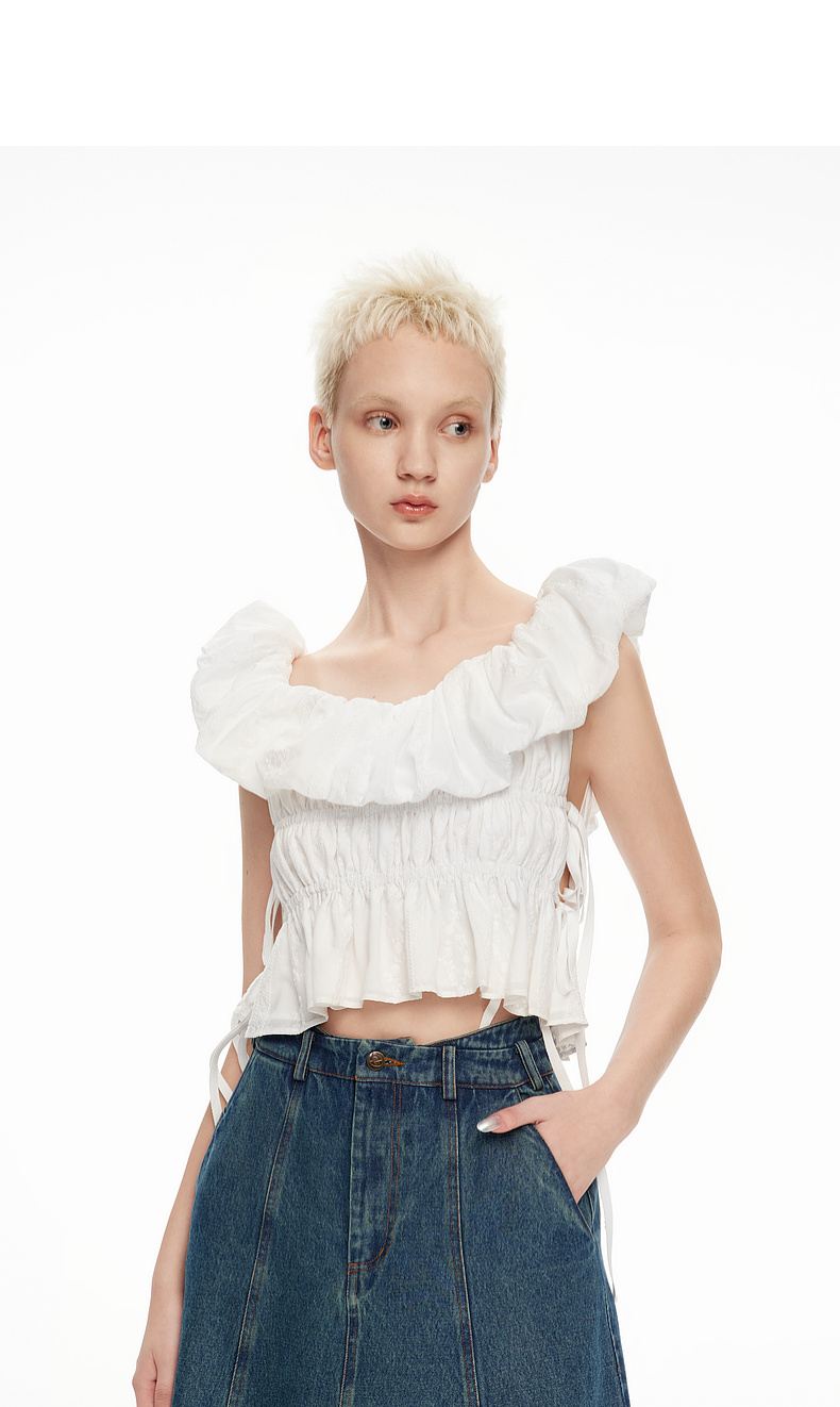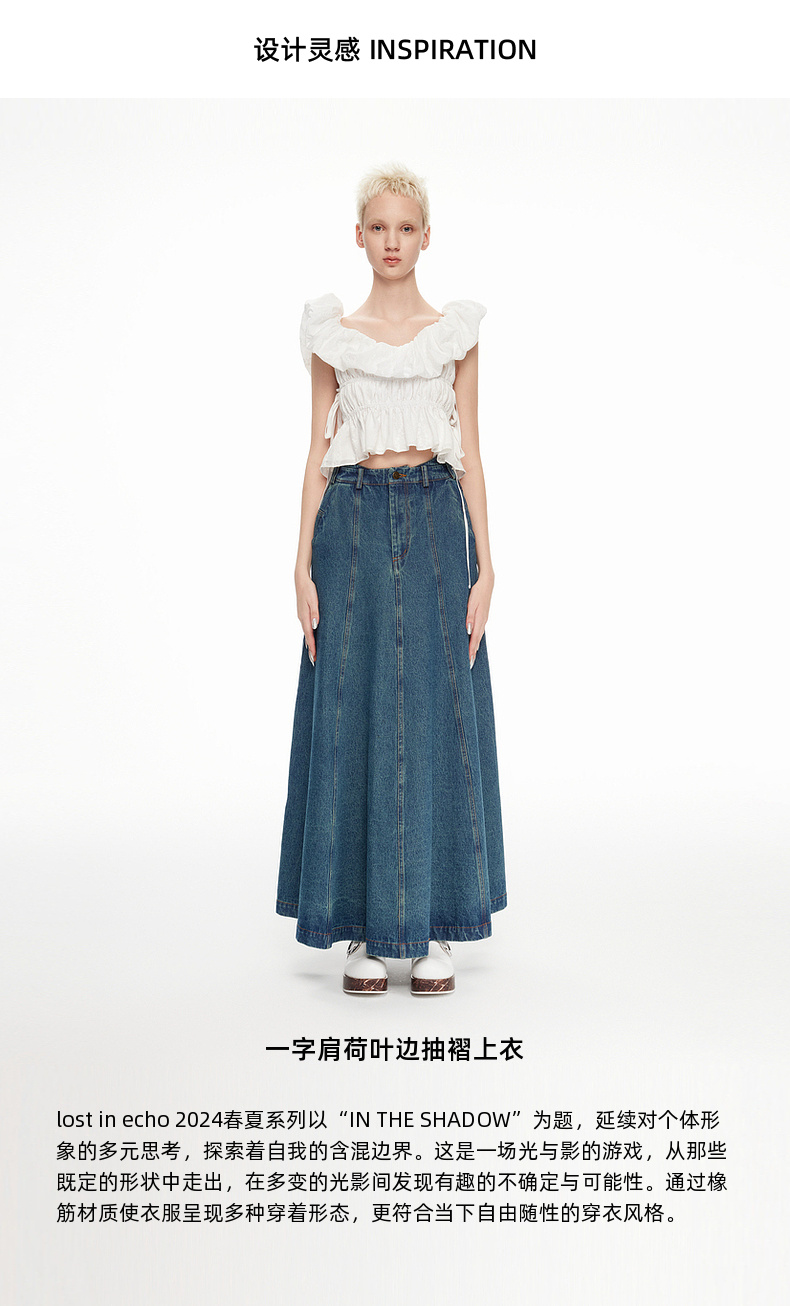 lost in echo2024春夏新品设计师款一字肩荷叶边白色上衣短袖T恤