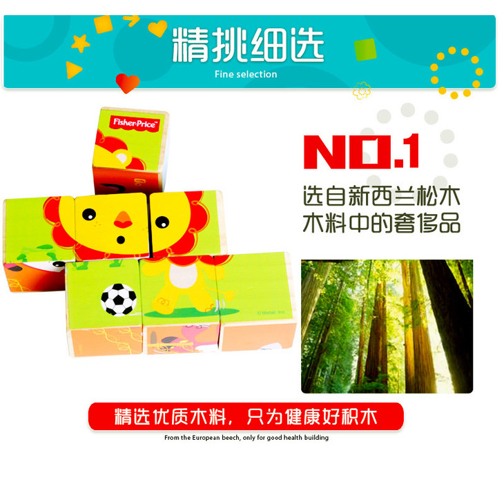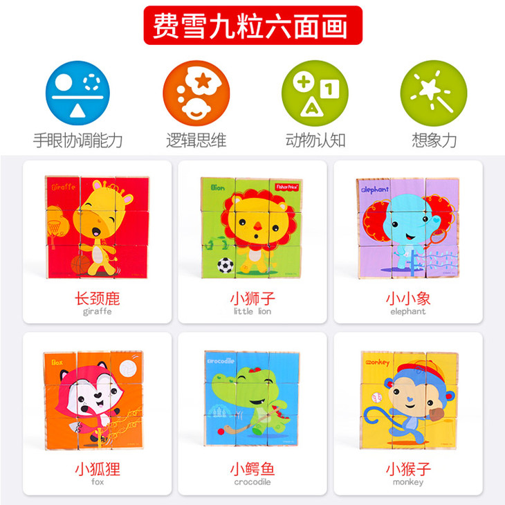 费雪Fisher-Price9粒六面画木质制积木拼装玩具大颗粒拼图幼儿童益智玩具早教礼物 FP1018 九粒六面画新款