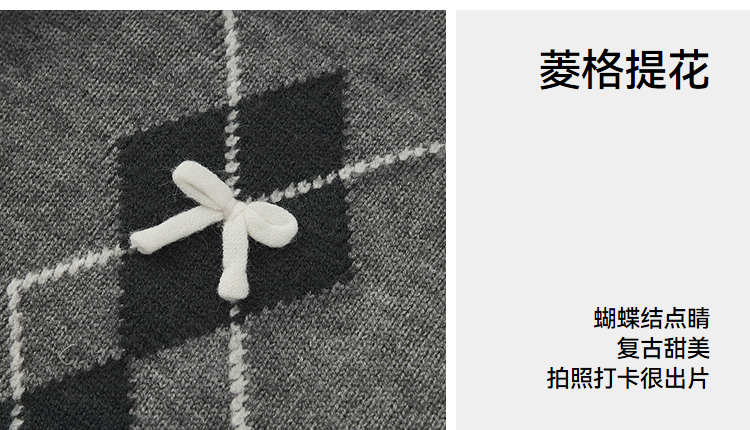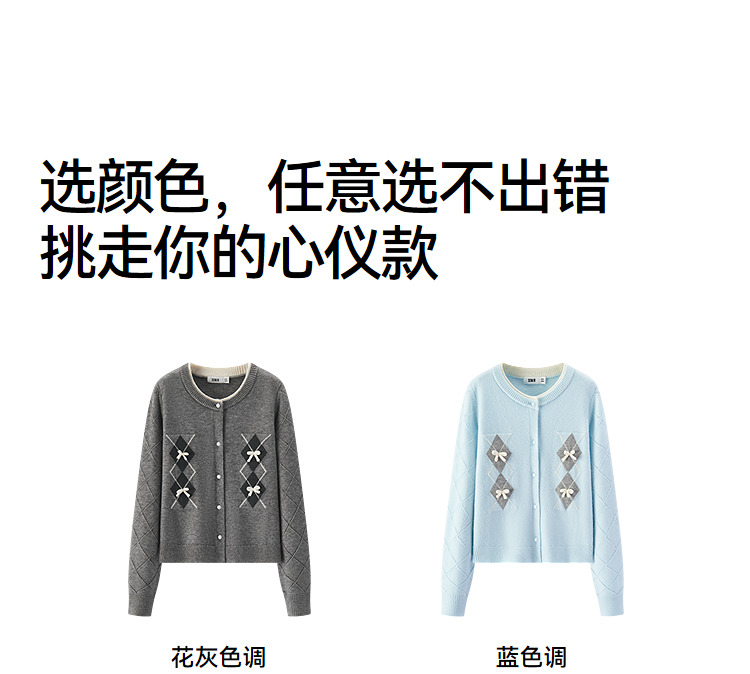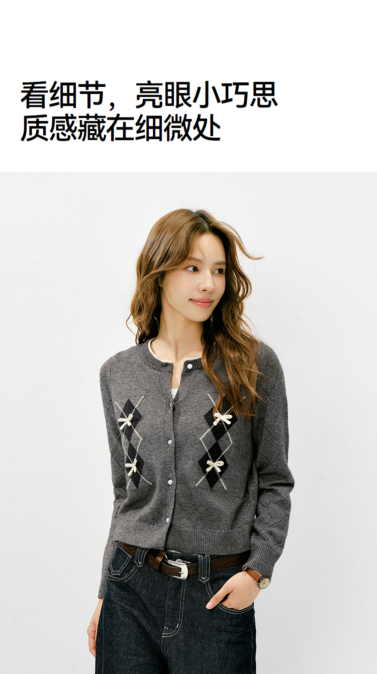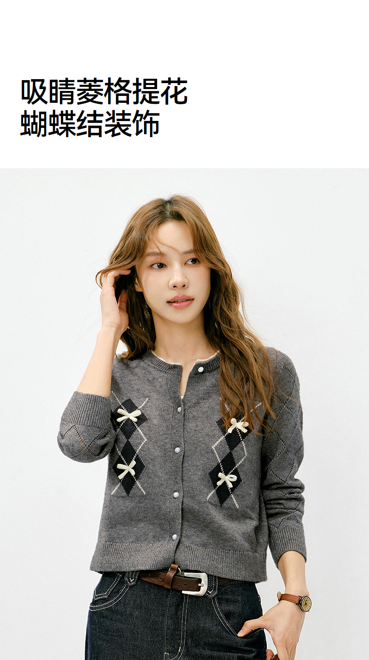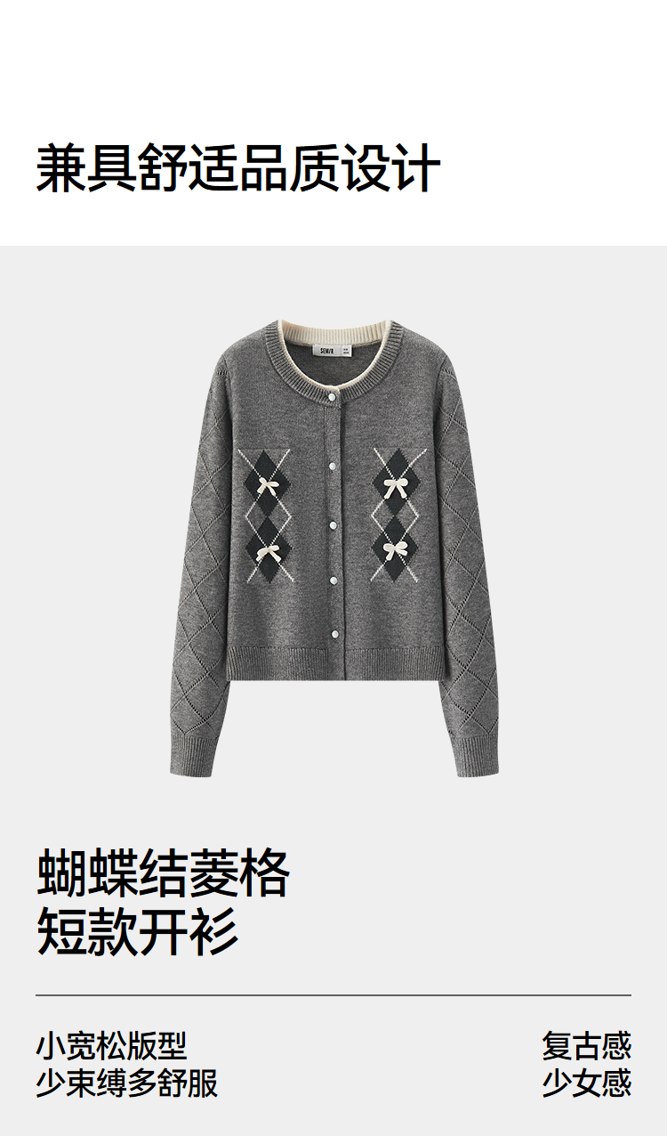 森马针织开衫女冬季短款蝴蝶结菱格假两件2025新款甜美少女感毛衫