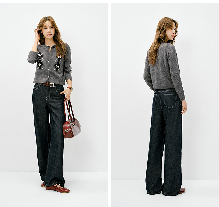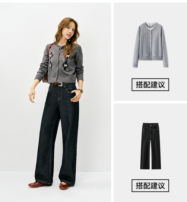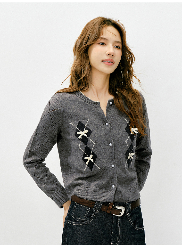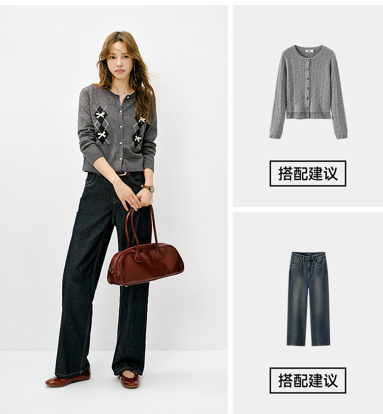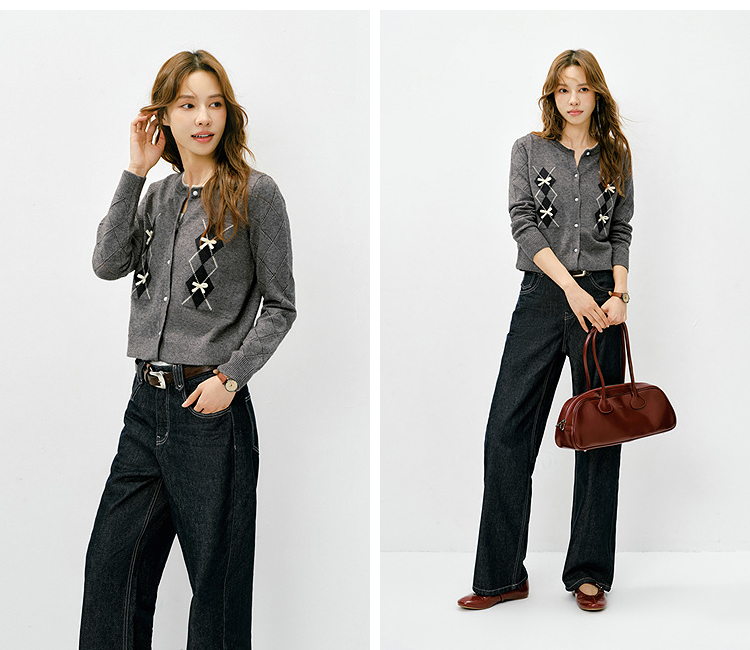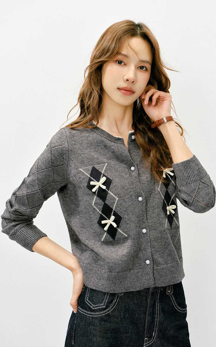 森马针织开衫女冬季短款蝴蝶结菱格假两件2025新款甜美少女感毛衫