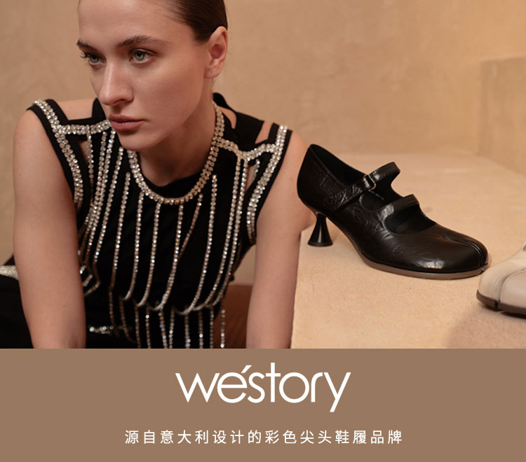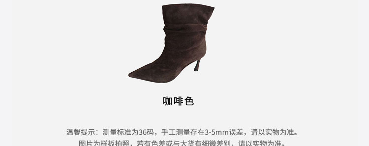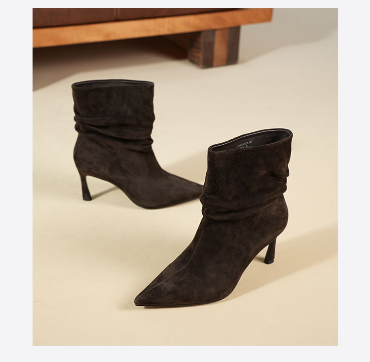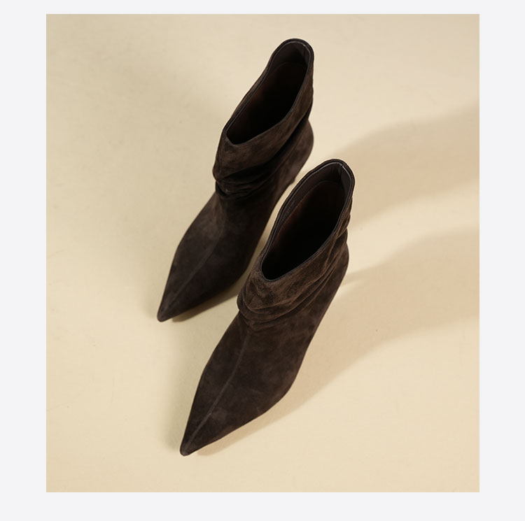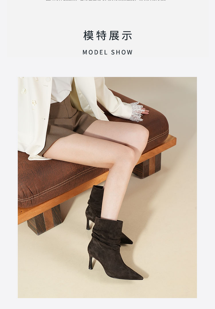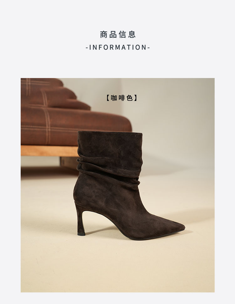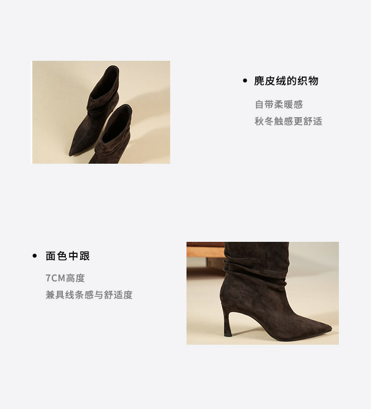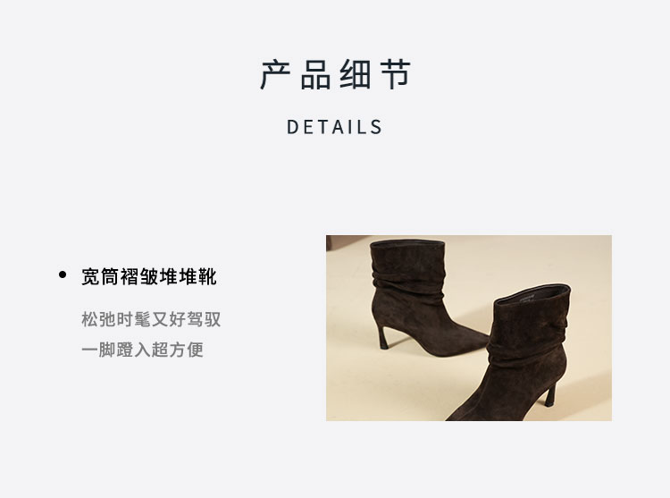 Westory2025年冬季羊京宽筒褶皱堆堆靴尖头高跟一脚蹬中长靴W25DS85361