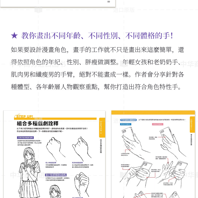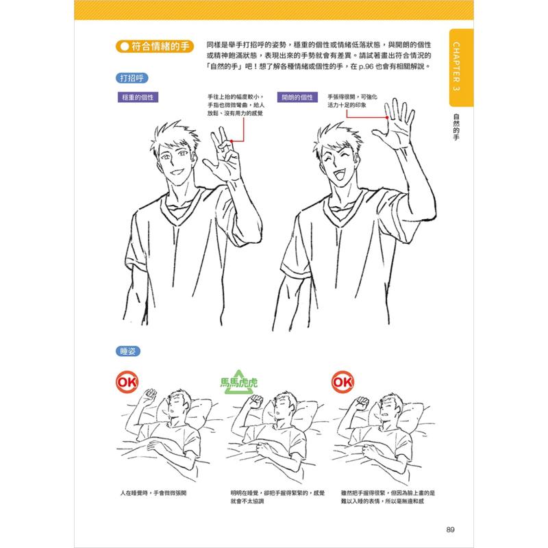 如果要設計漫畫角色,畫手的工作就不只是畫出來這麼簡單,還得依照角色的年紀、性別、胖瘦做調整。年輕女孩和老奶奶的手、肌肉男和纖瘦男的手臂,不能畫成一樣。作者會分享針對各種體型、各年齡層人物的觀察重點,幫你打造出符合角色特性的手。