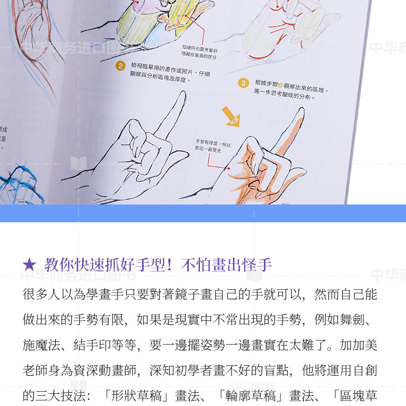 很多人以為學畫手只要對著鏡子畫自己的手就可以,然而自己能做出來的手勢有限,如果是現實中不常出現的手勢,例如舞劍、施魔法、結手印等等,要一邊擺姿勢一邊畫實在太難了。加加美老師身為資深動畫師,深知初學者畫不好的盲點,他將運用自創的三大技法:「形狀草稿」畫法、「區塊草稿」畫法,教你快速抓好手型。