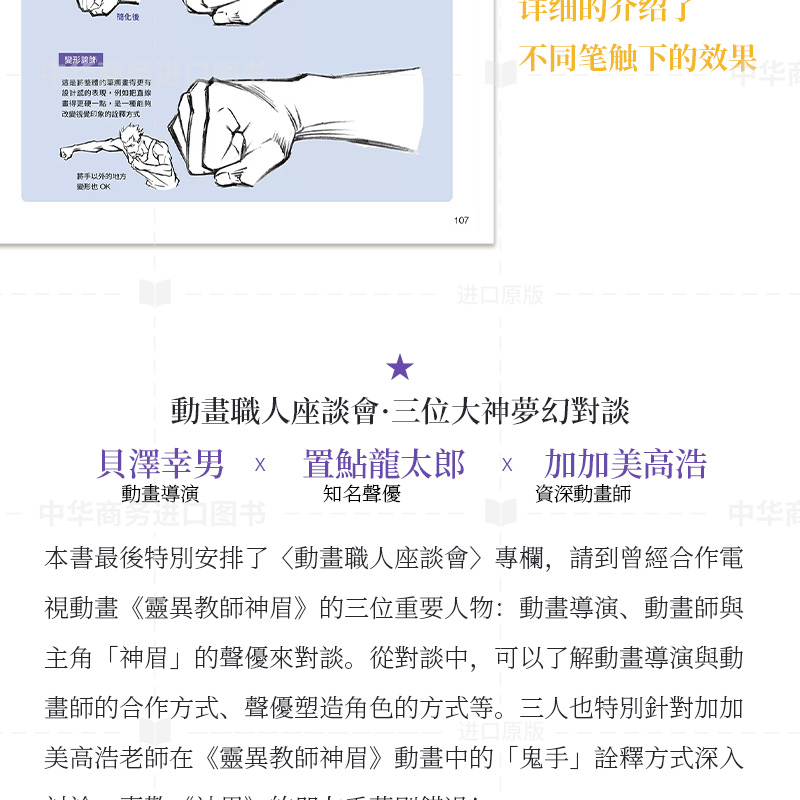 本書最後特別安排了〈動畫職人座談會〉專欄,請到曾經合作電視動畫《靈異教師神眉》的三位重要人物:動畫導演、動畫師與主角「神眉」的聲優來對談。從對談中,可以了解動畫導演與動畫師的合作方式、聲優塑造角色的方式等。三人也特別針對加加美高浩老師在《靈異教師神眉》動畫中的「鬼手」詮釋方式深入討論。喜歡《神眉》的朋友千萬別錯過!