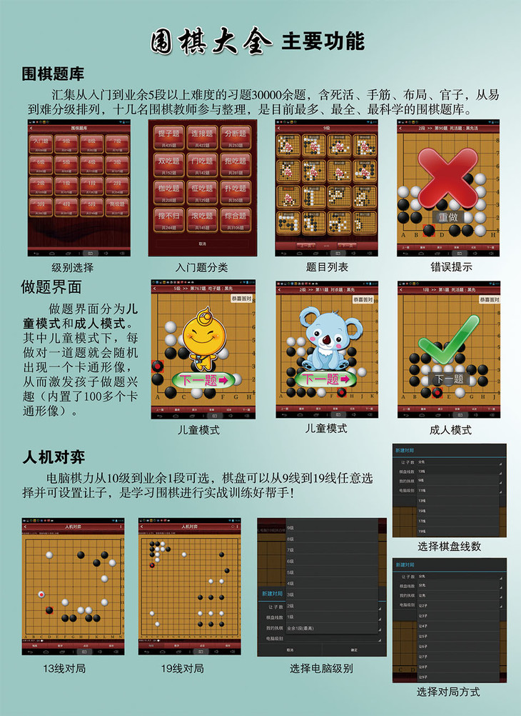 2,人机对弈:电脑棋力从10级到业余1段可选,是学习围棋进行实战训练的好帮手;