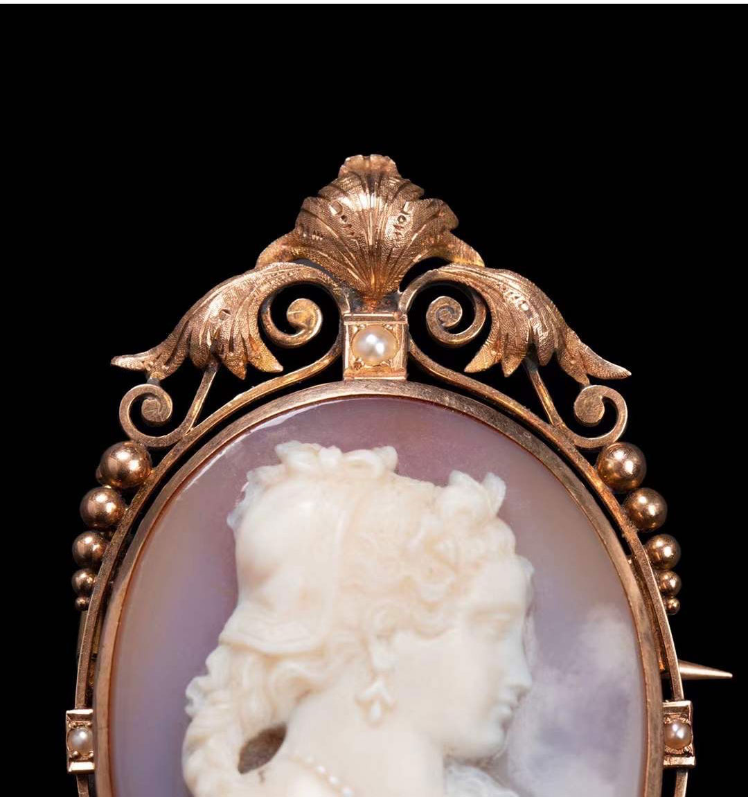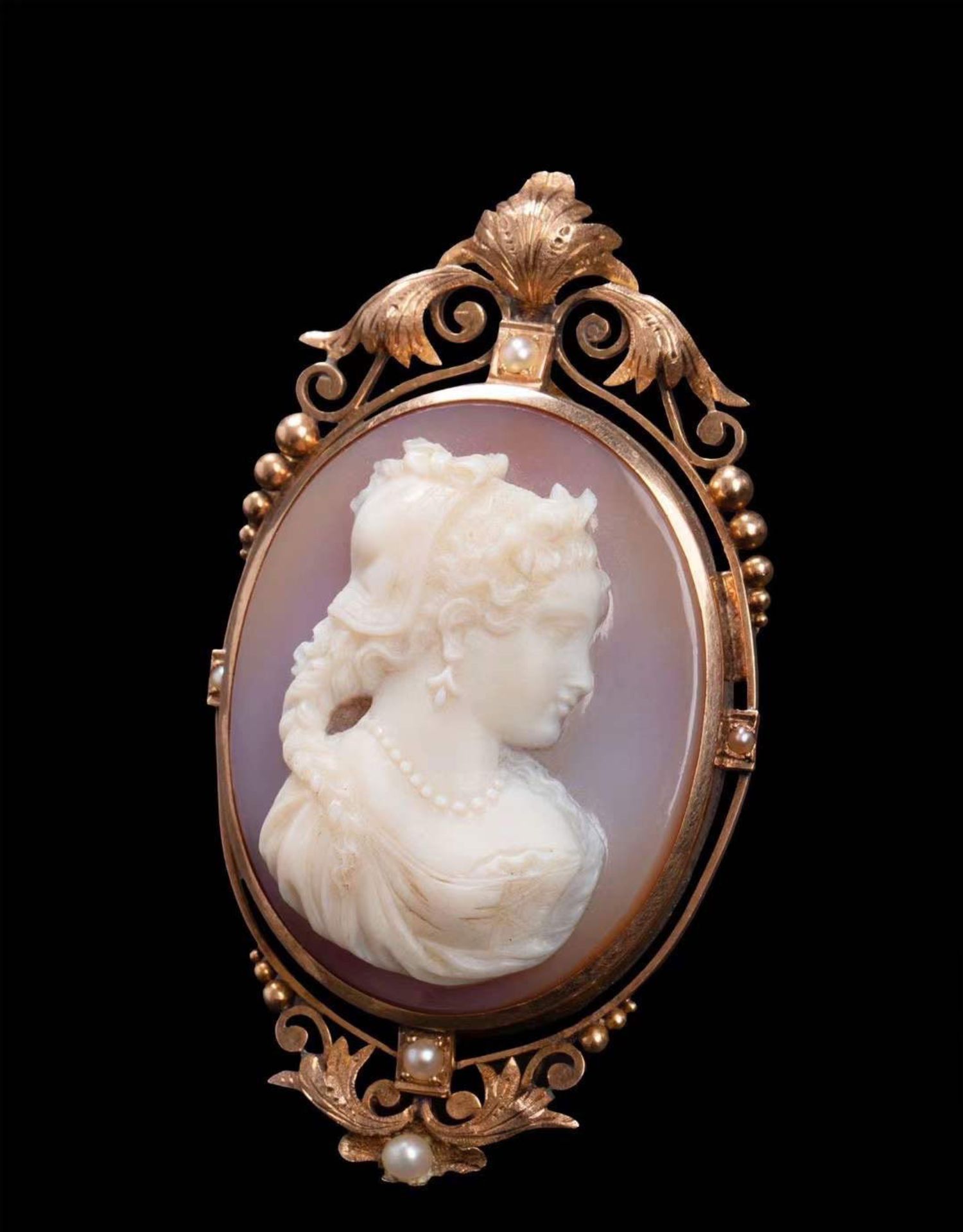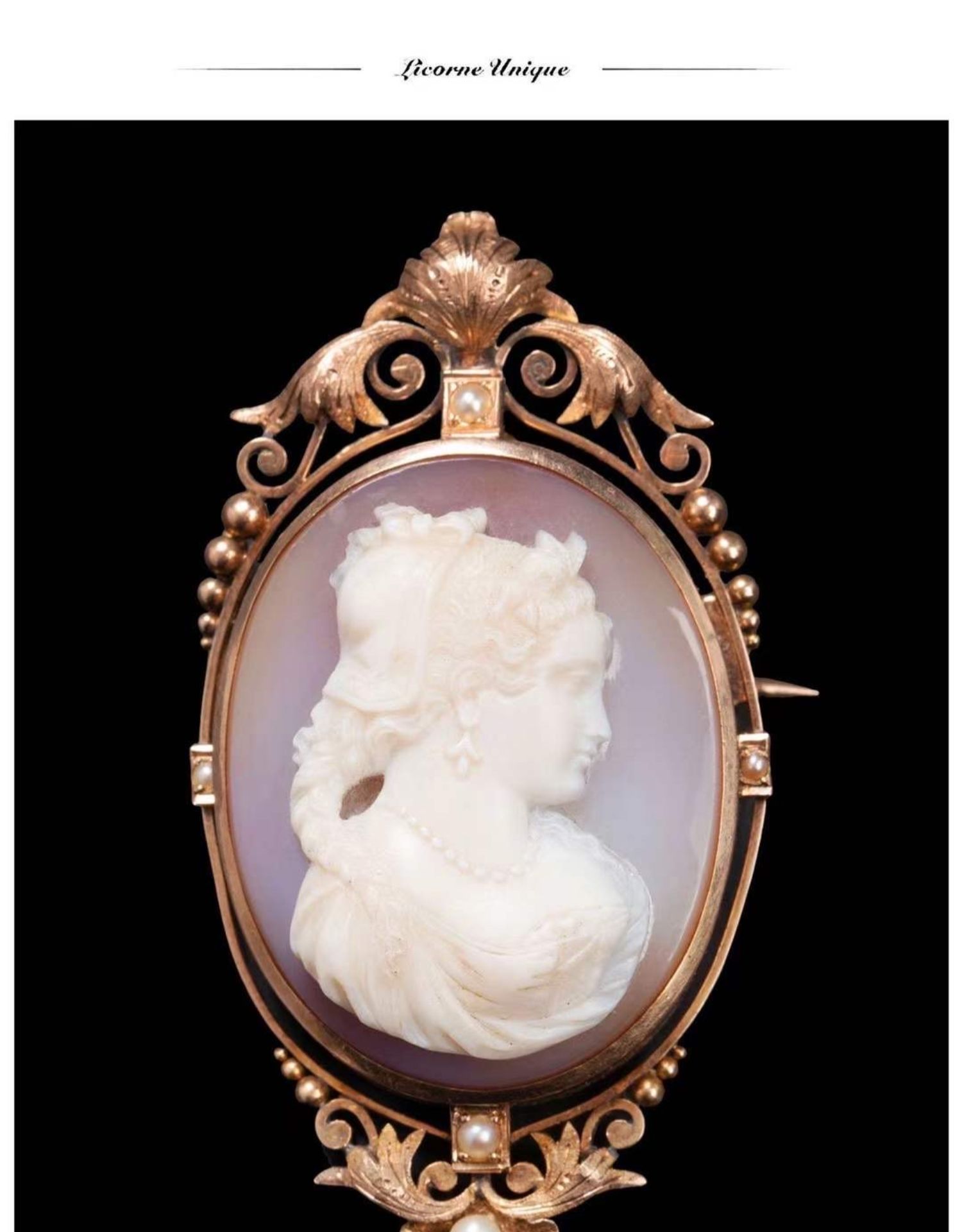 独角鹿西洋古董首饰18K金镶珍珠女子雕像Cameo玛瑙浮雕胸针/吊坠