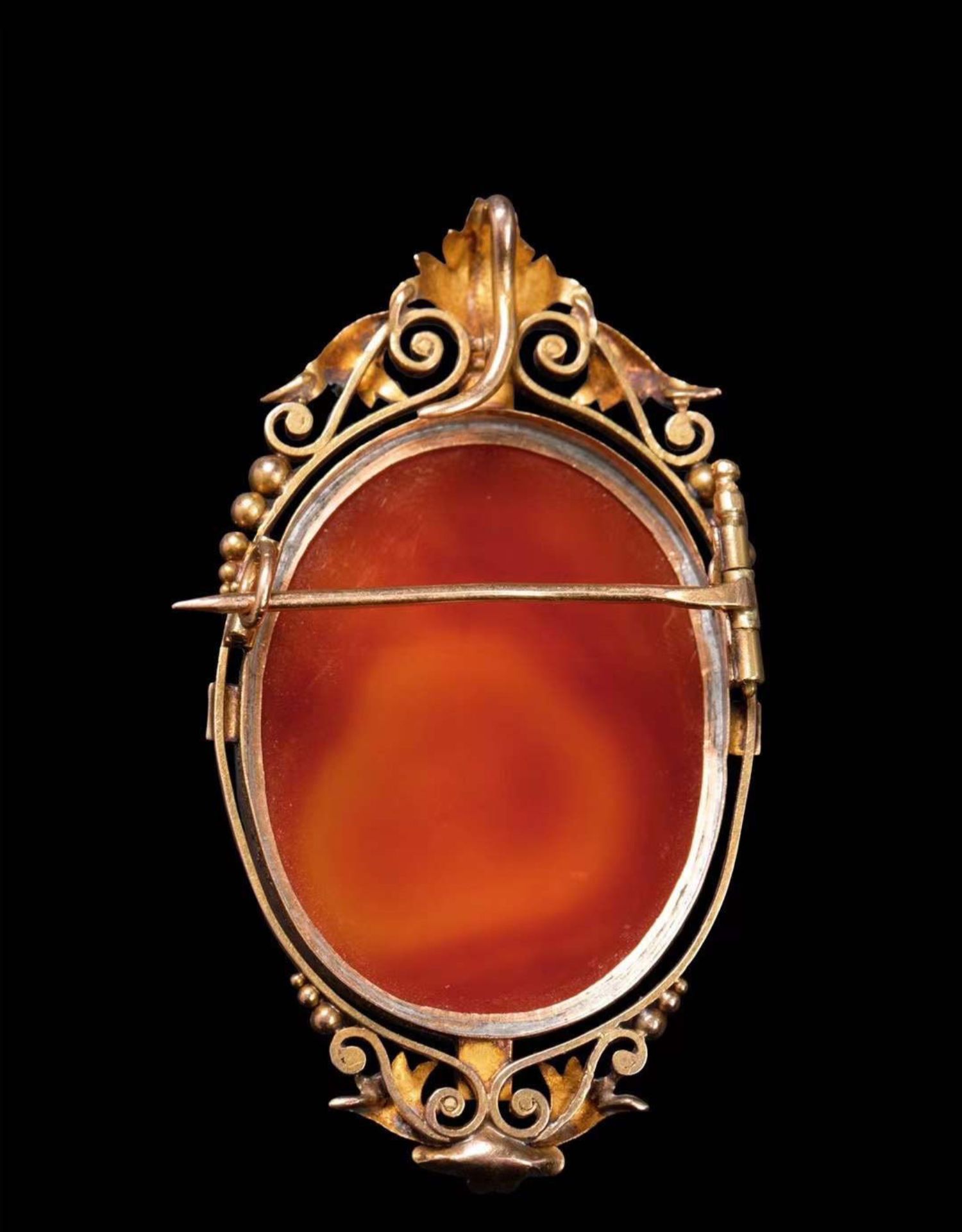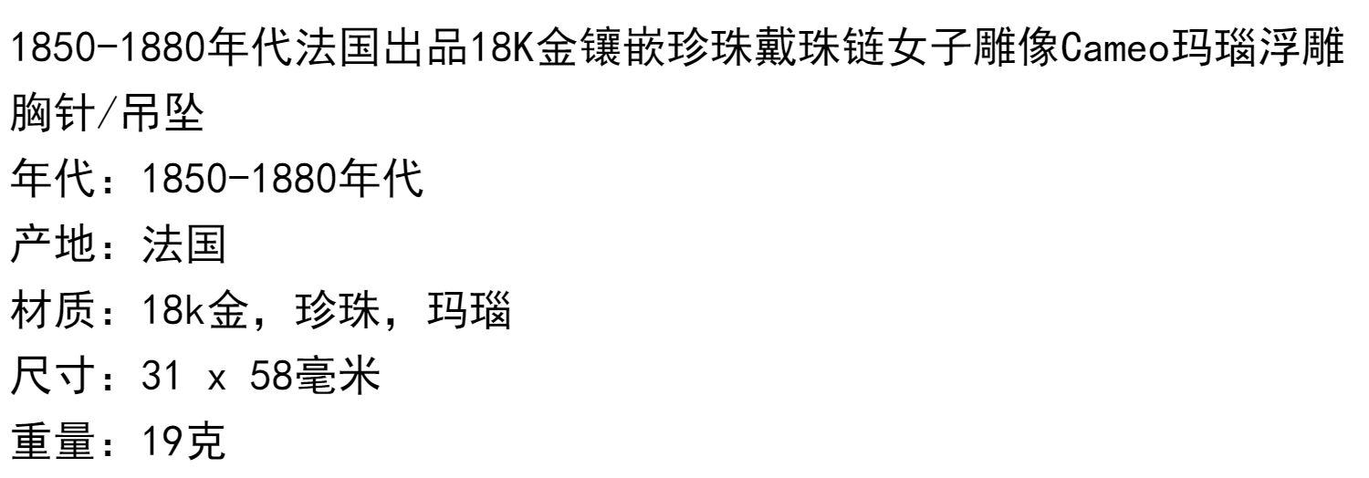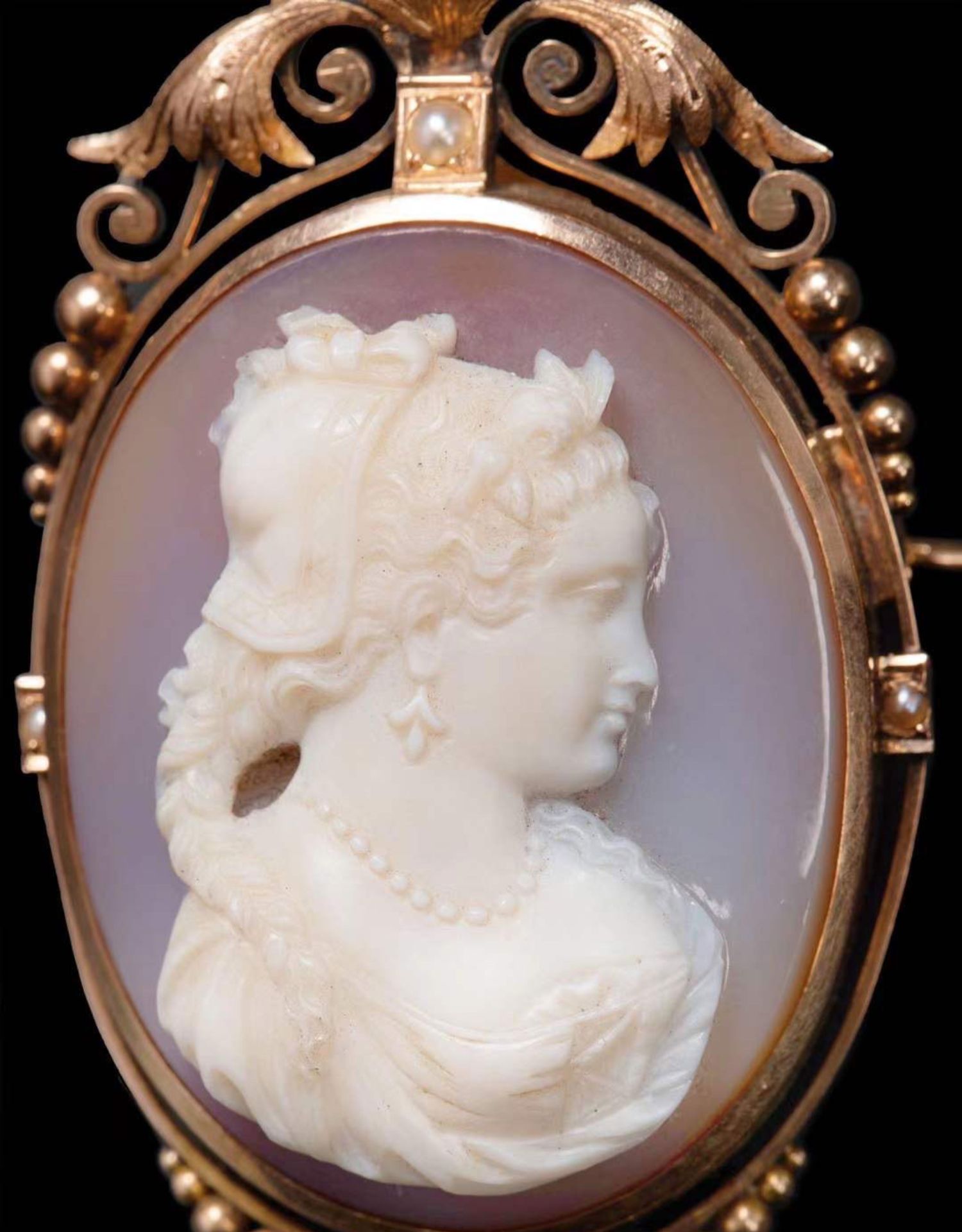 独角鹿西洋古董首饰18K金镶珍珠女子雕像Cameo玛瑙浮雕胸针/吊坠