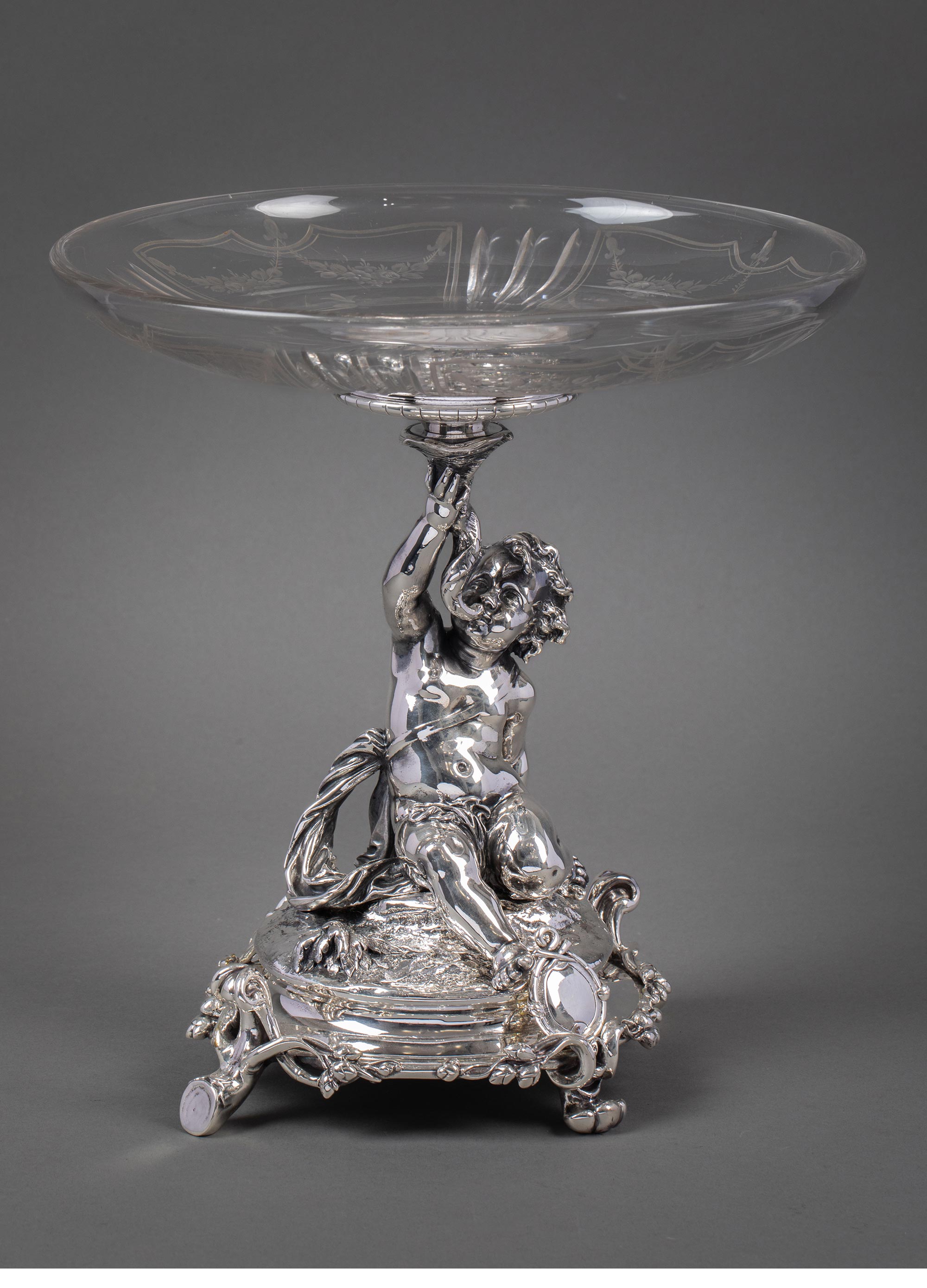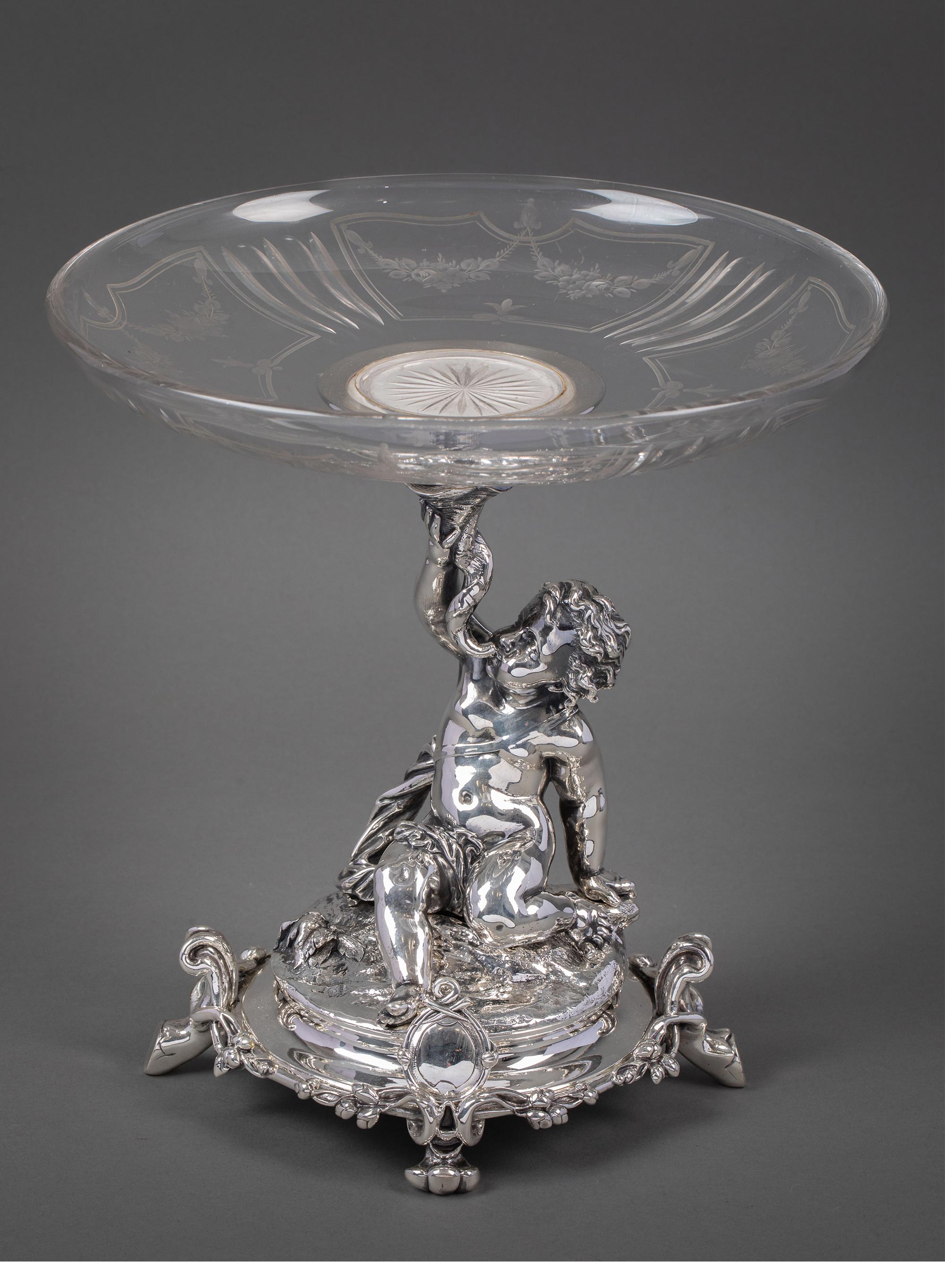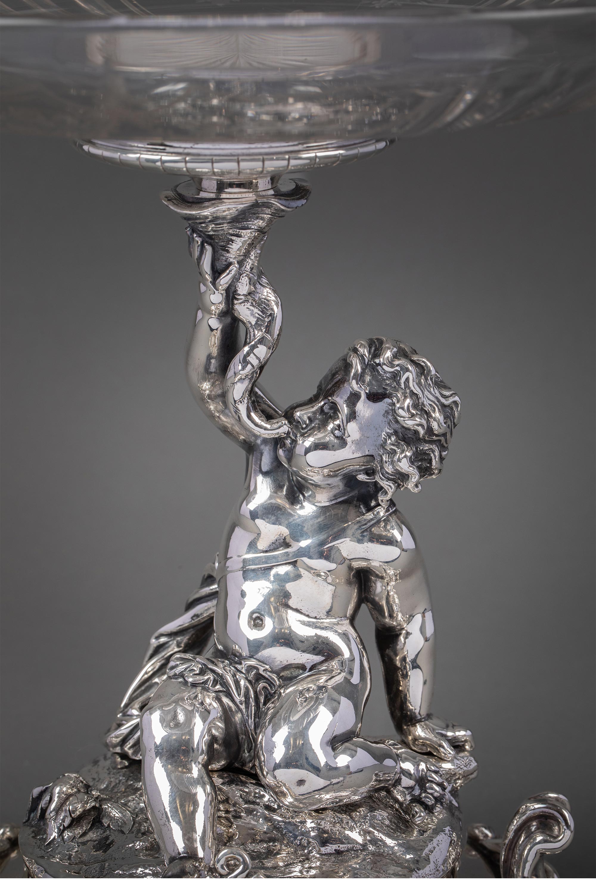 1860年代法国顶级银器工坊昆庭签名出品小海神特里同造型铜镀银嵌水晶果盘