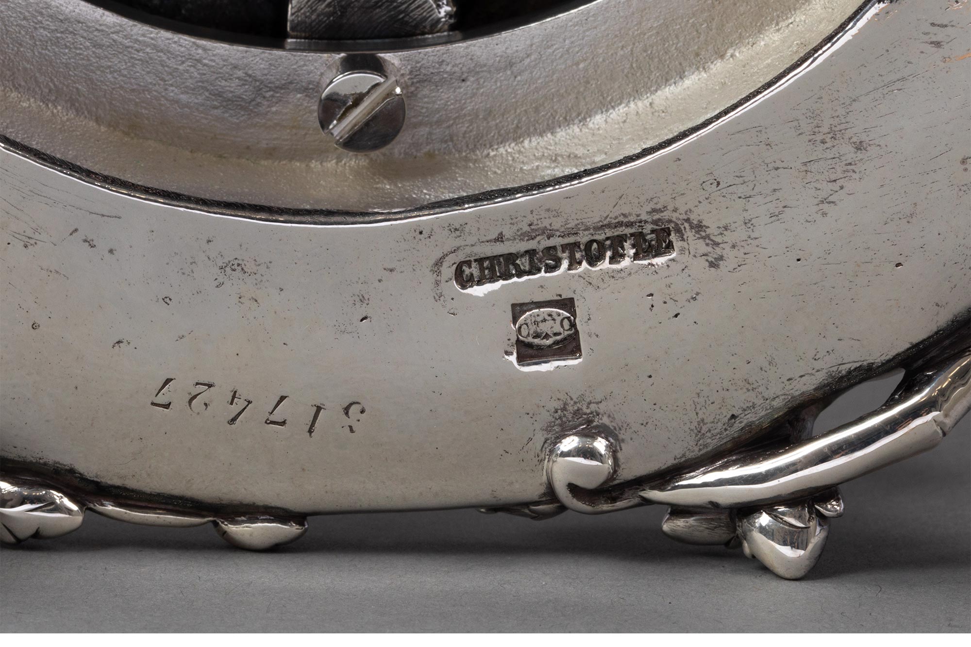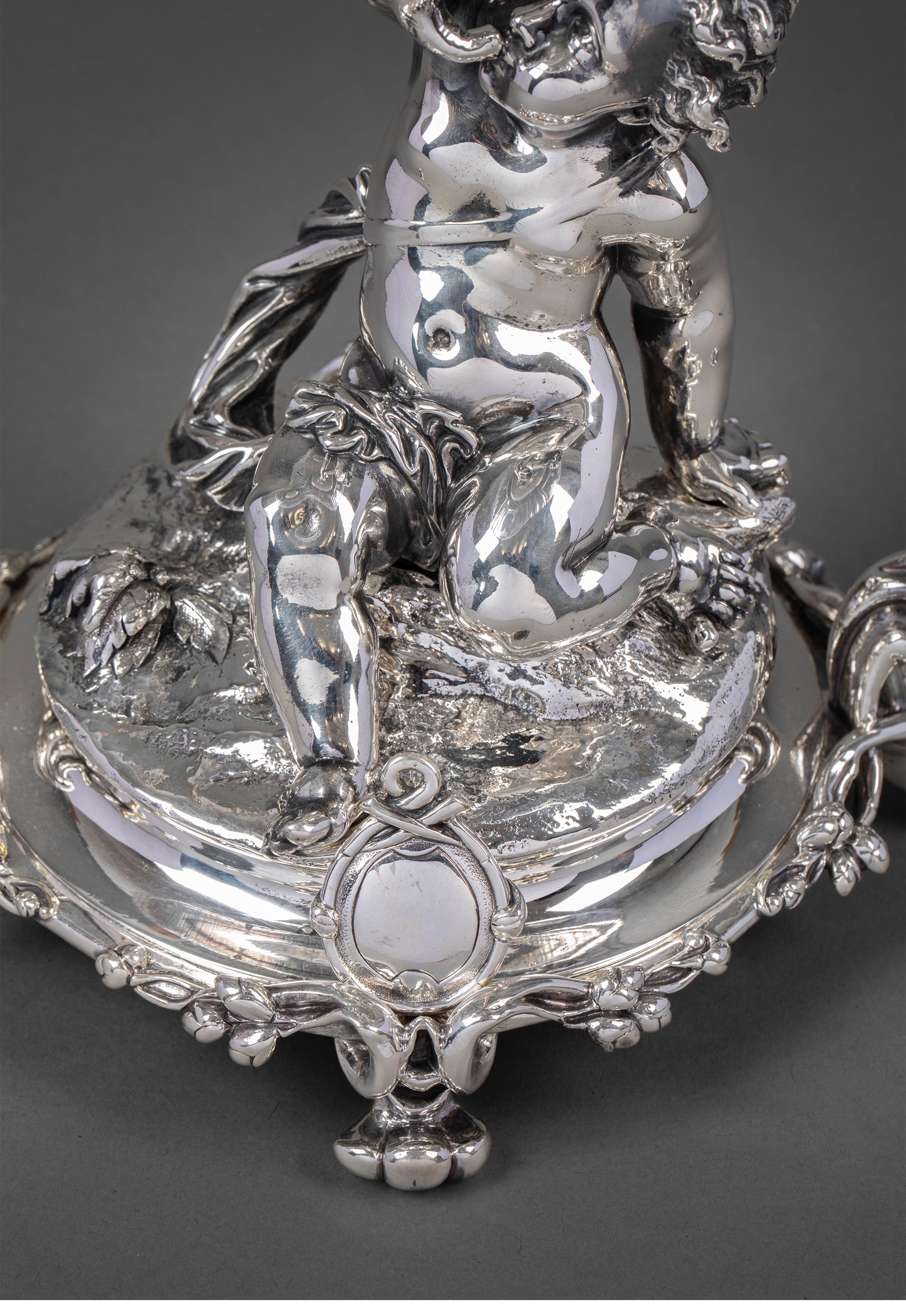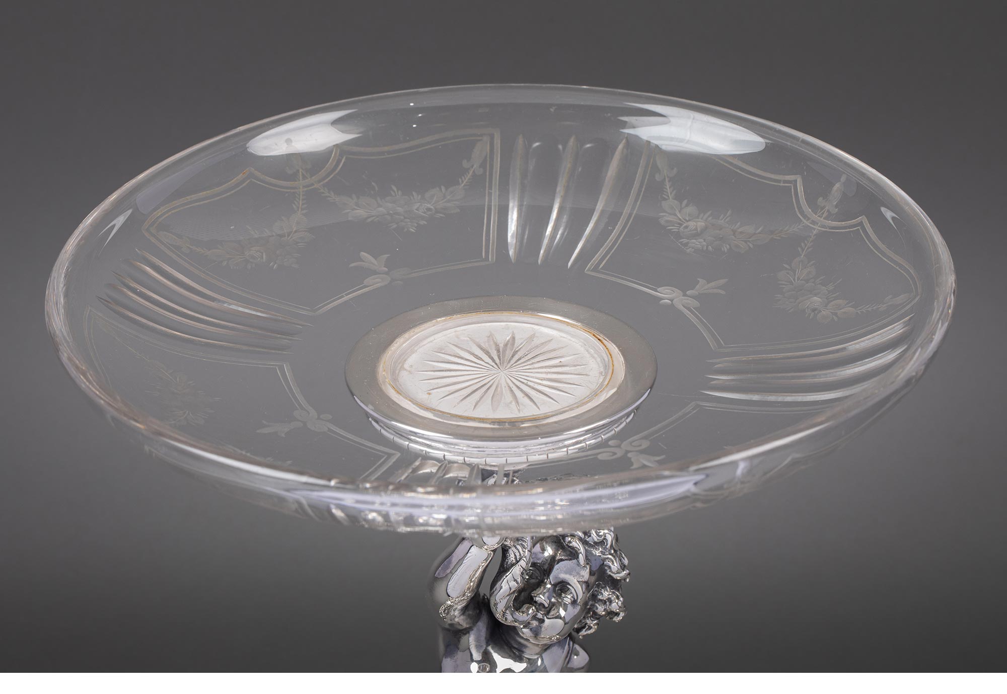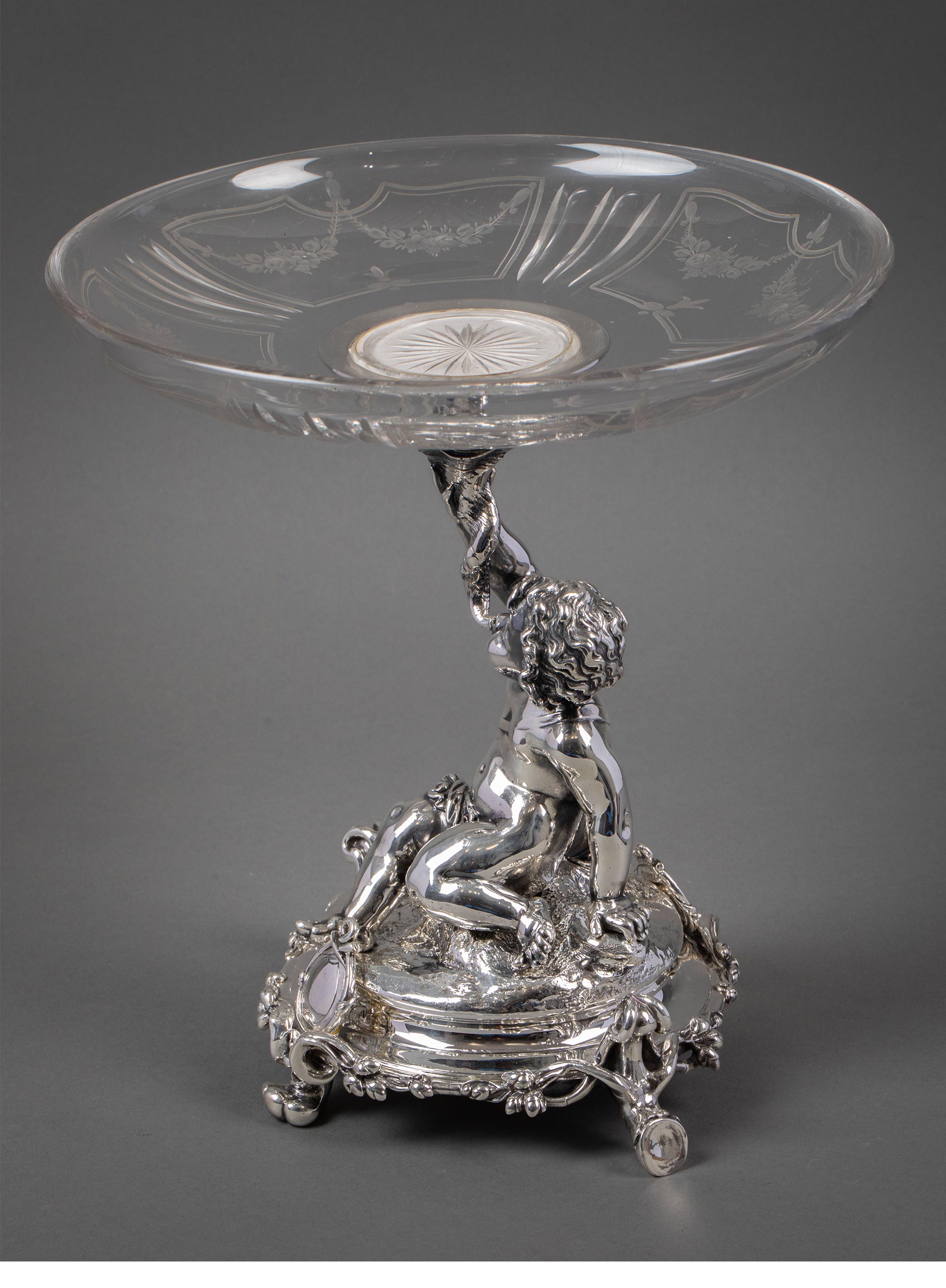 1860年代法国顶级银器工坊昆庭签名出品小海神特里同造型铜镀银嵌水晶果盘