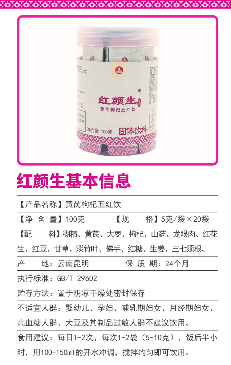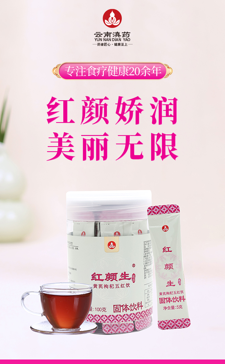 红颜生黄芪枸杞五红汤气色不佳色斑困扰头晕疲倦气短懒言大枣怀山药枸杞龙眼肉等药食两用原料草本浓缩速溶吸收好(5g*20袋/瓶)