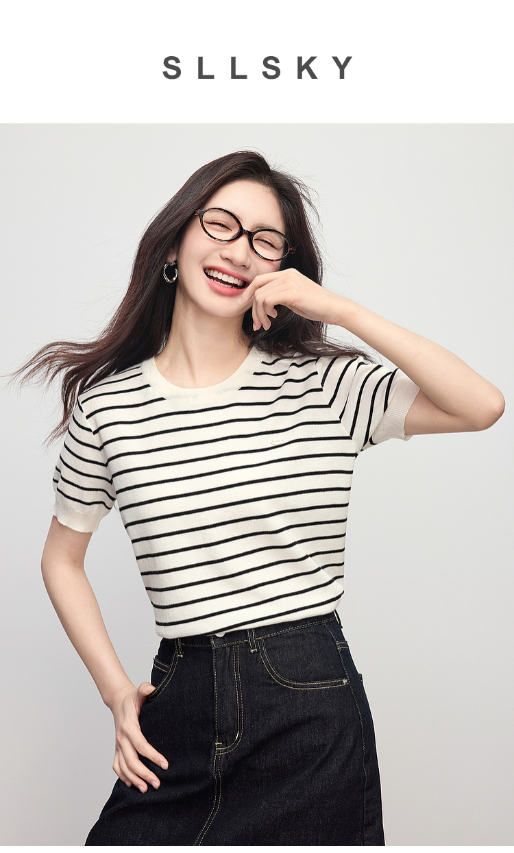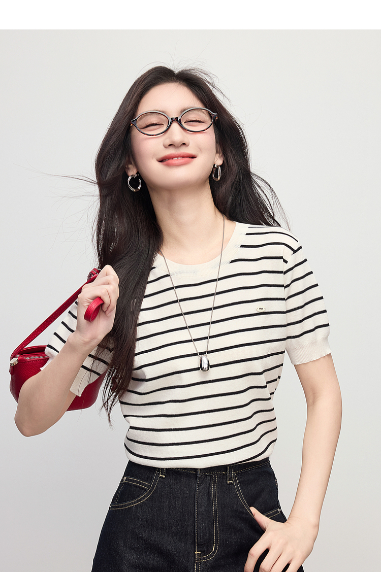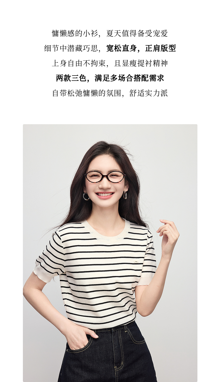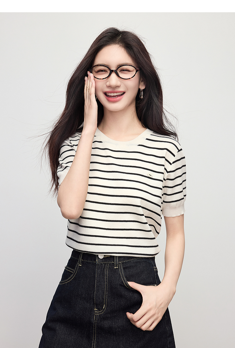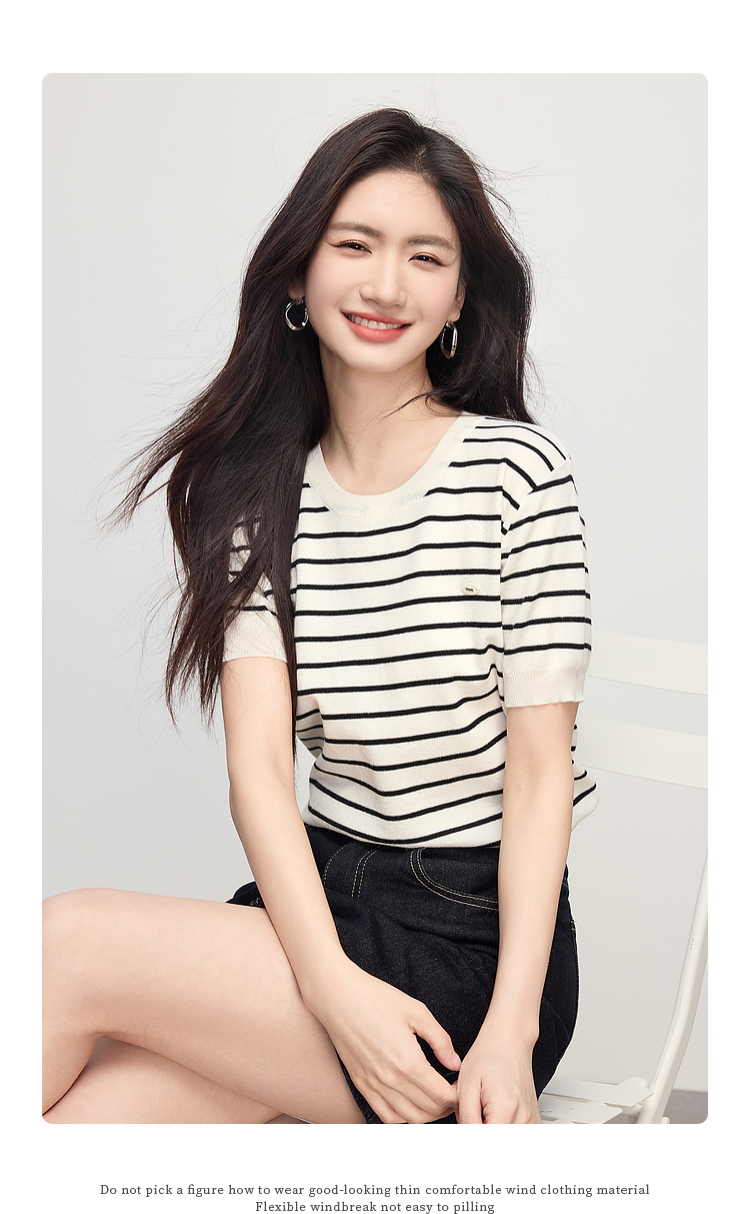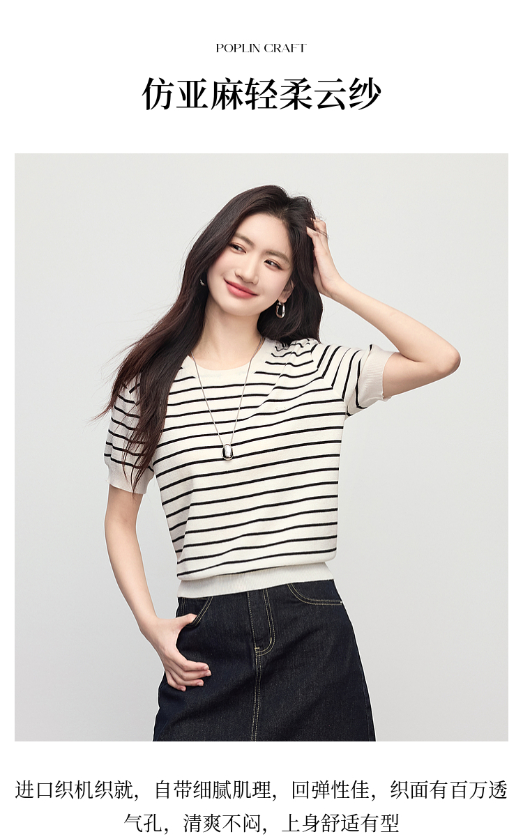 【专属特价】熙世界2025夏季新款圆领条纹针织衫女薄款仿亚麻短袖正肩T恤上衣