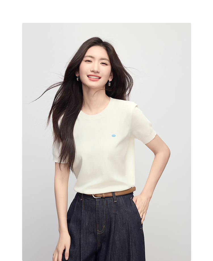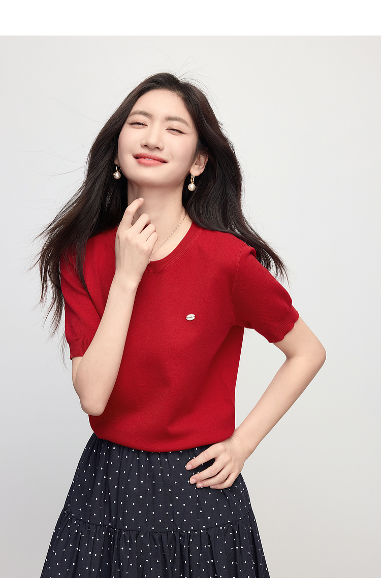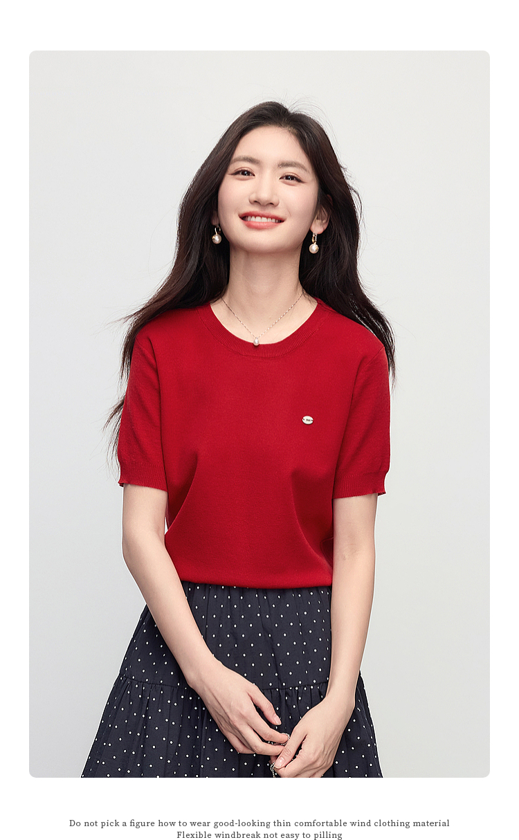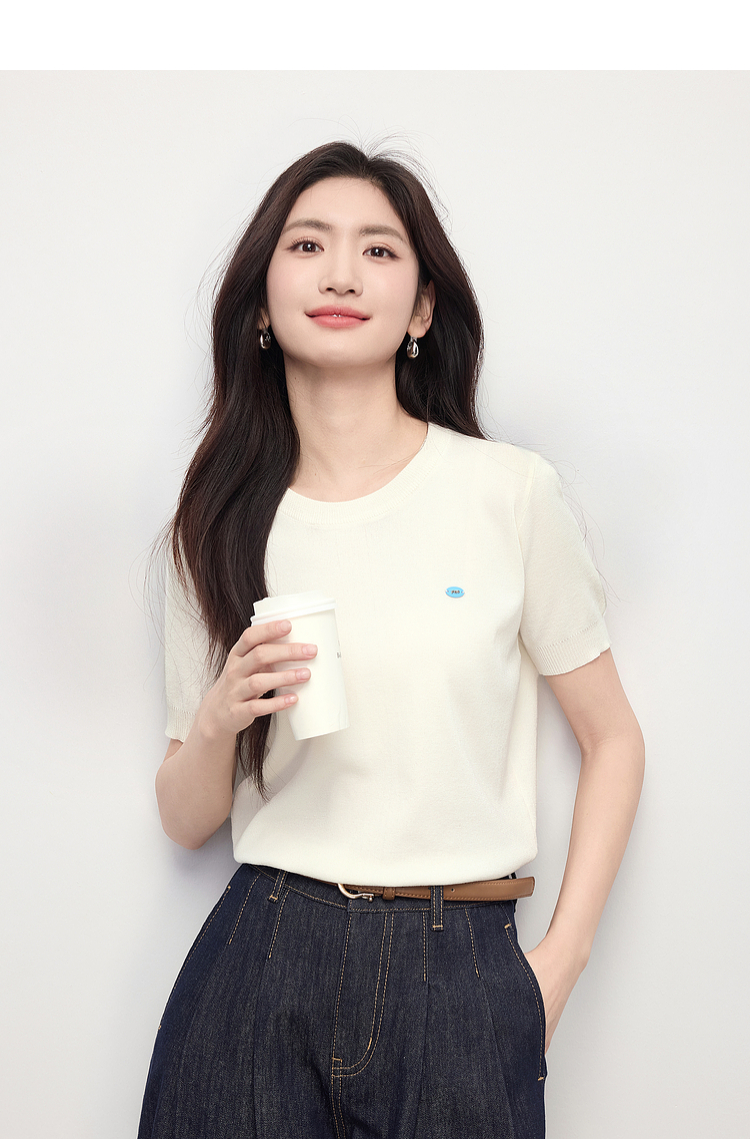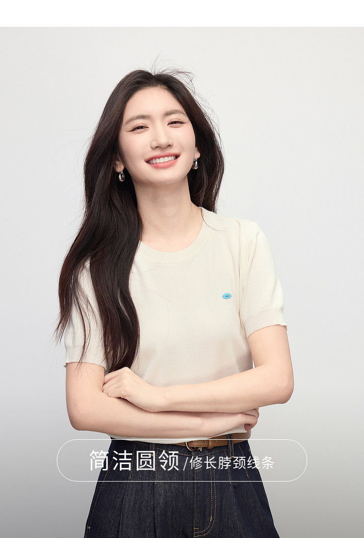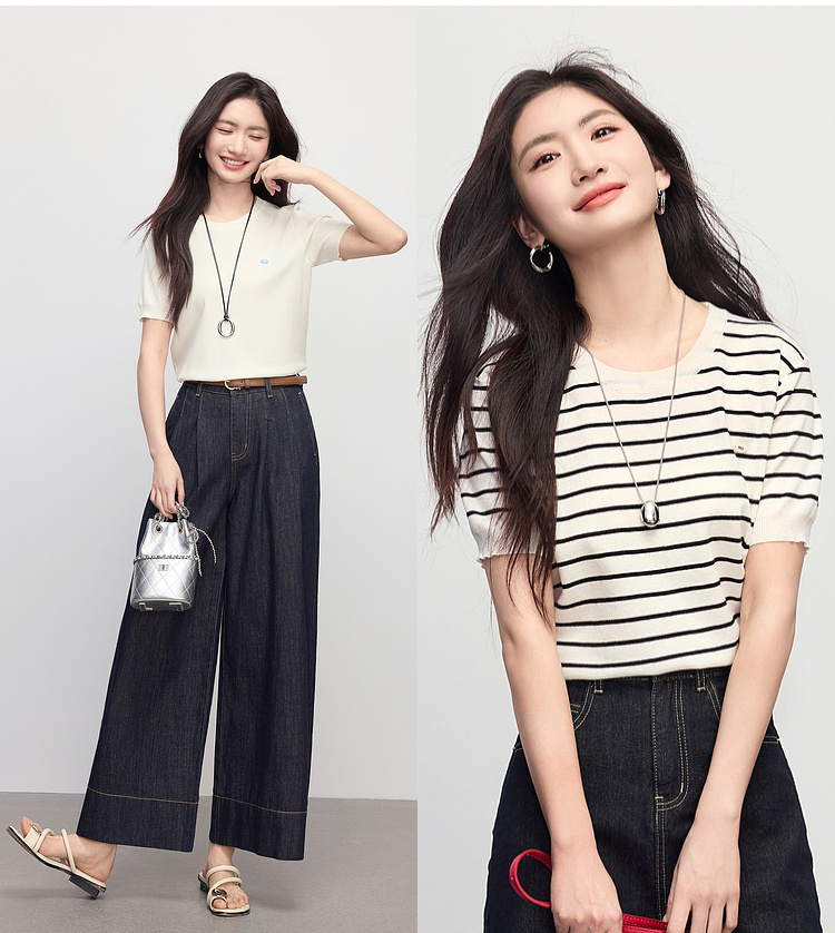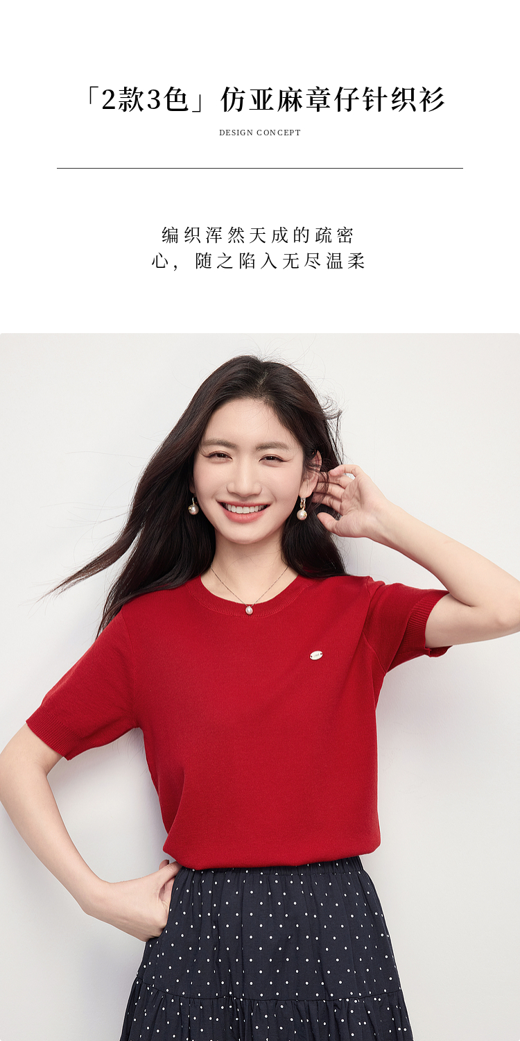 【专属特价】熙世界2025夏季新款圆领条纹针织衫女薄款仿亚麻短袖正肩T恤上衣