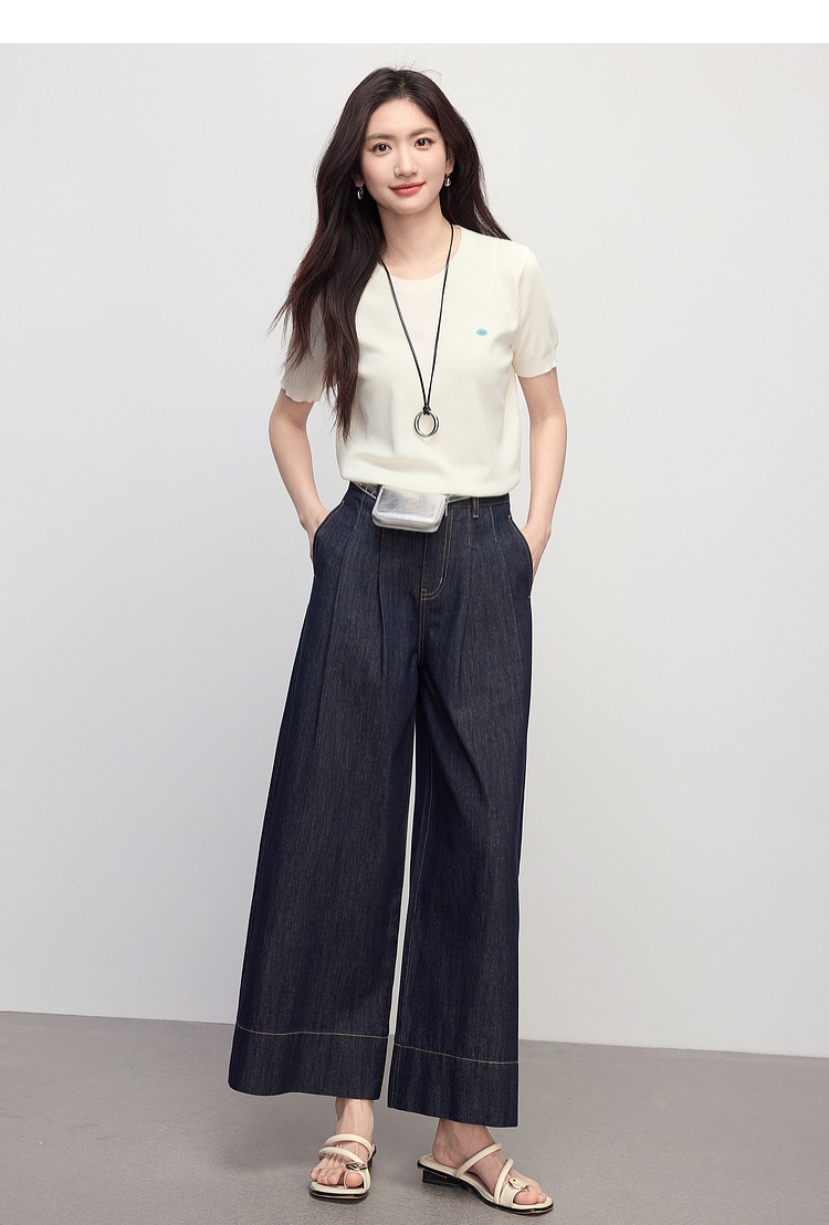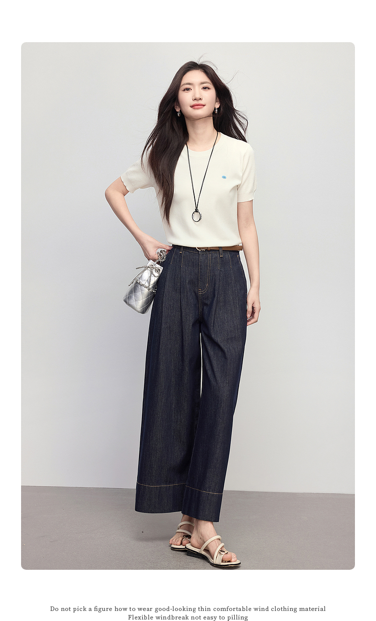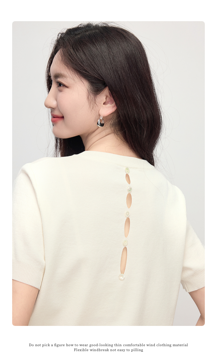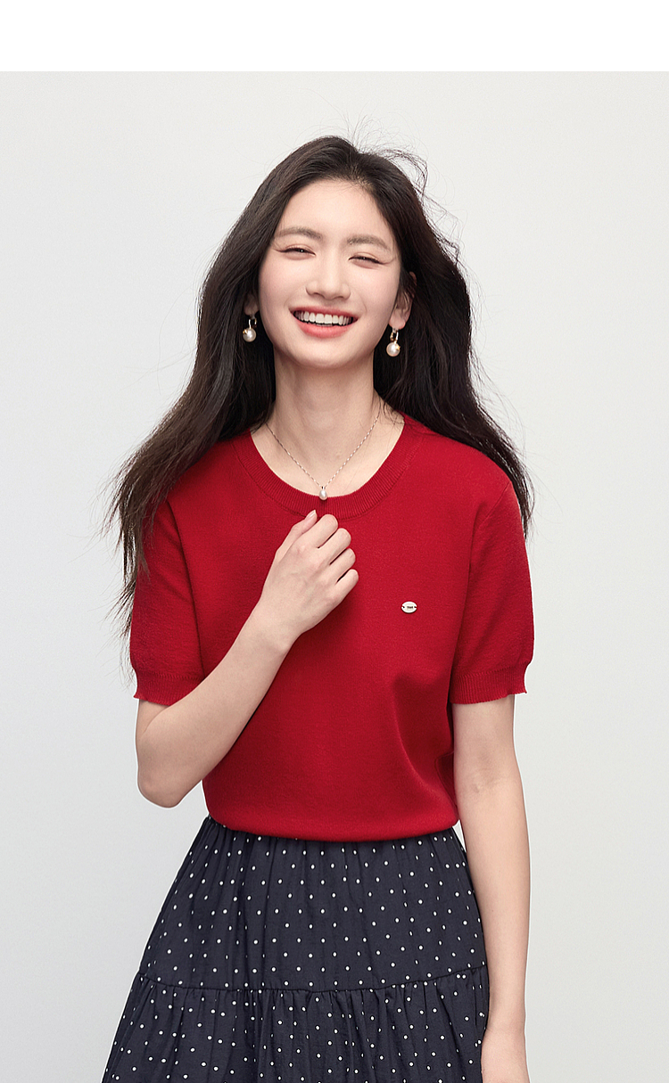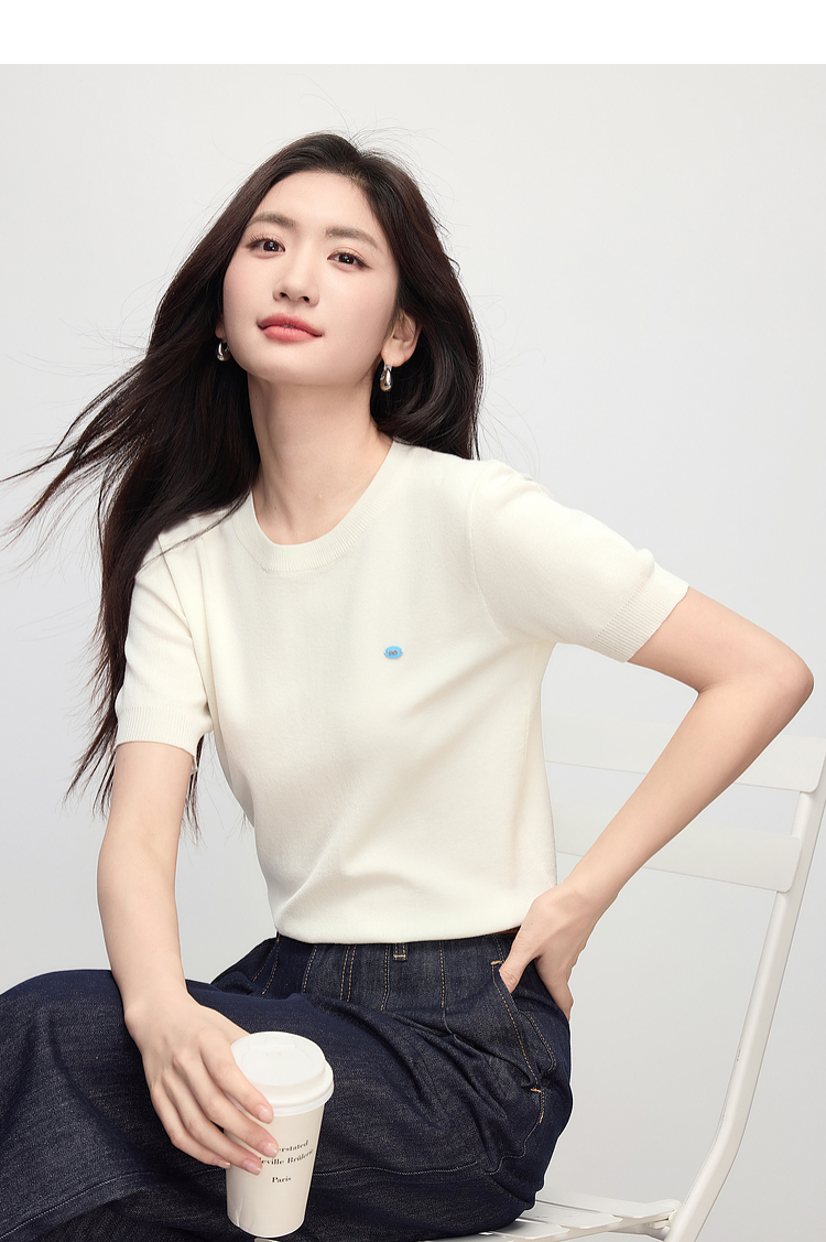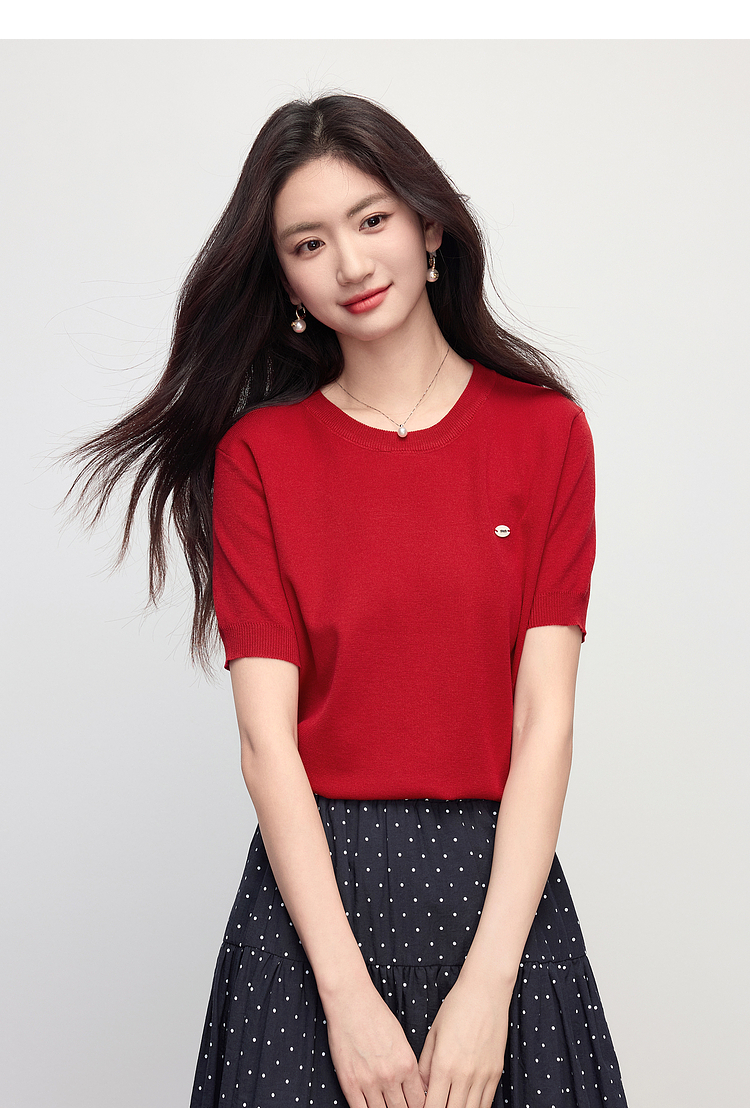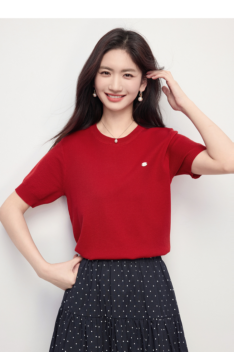 【专属特价】熙世界2025夏季新款圆领条纹针织衫女薄款仿亚麻短袖正肩T恤上衣