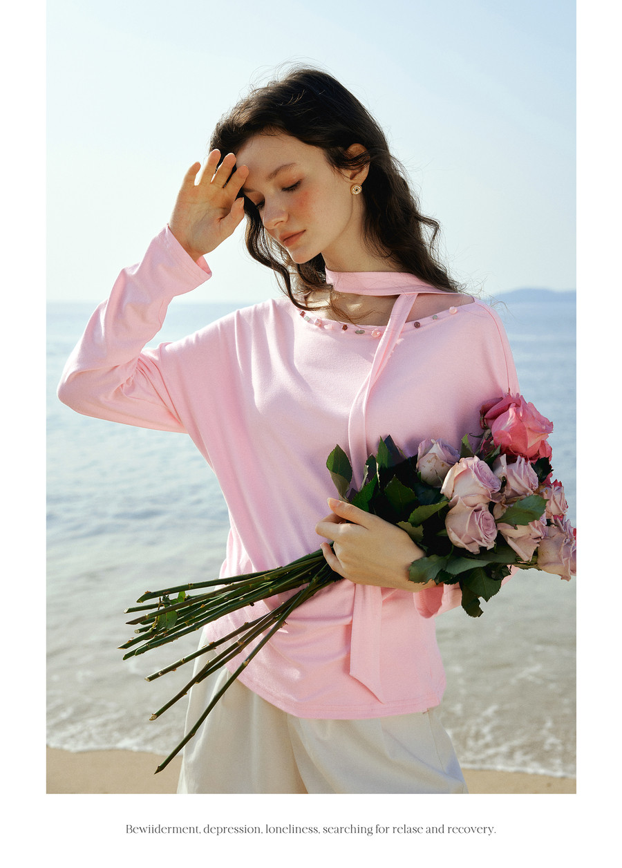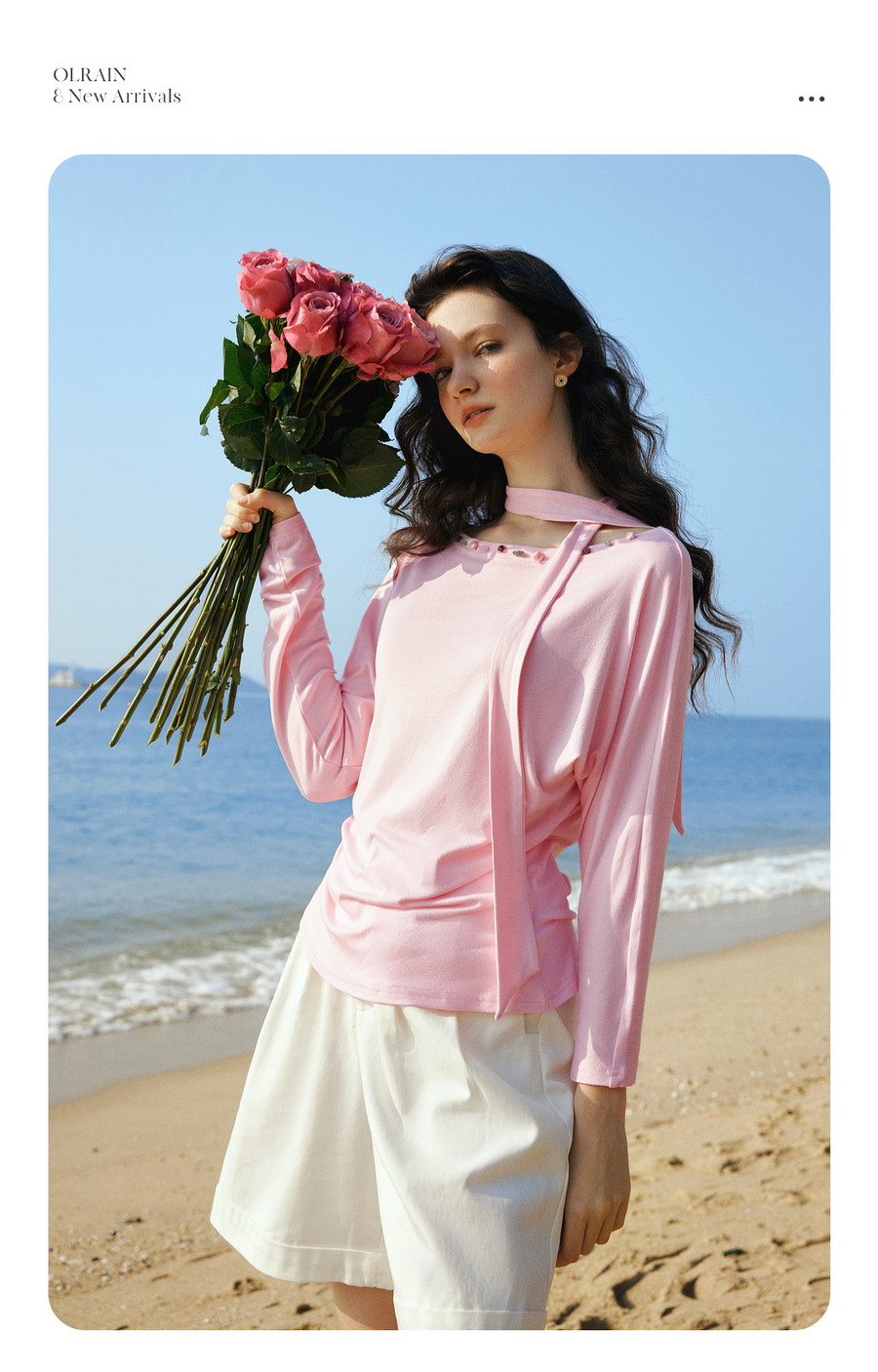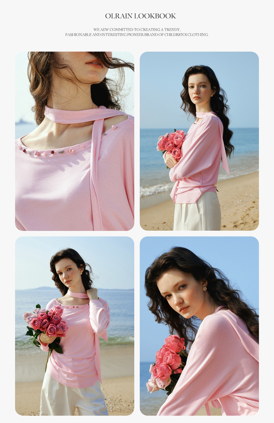 欧芮儿2026春新款温柔粉飘带挂脖长袖T恤女高级感气质一字领上衣
