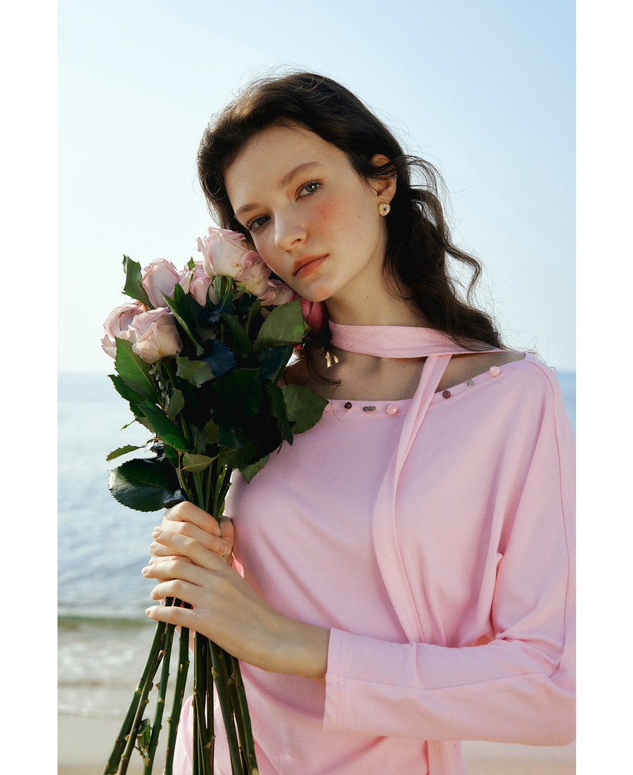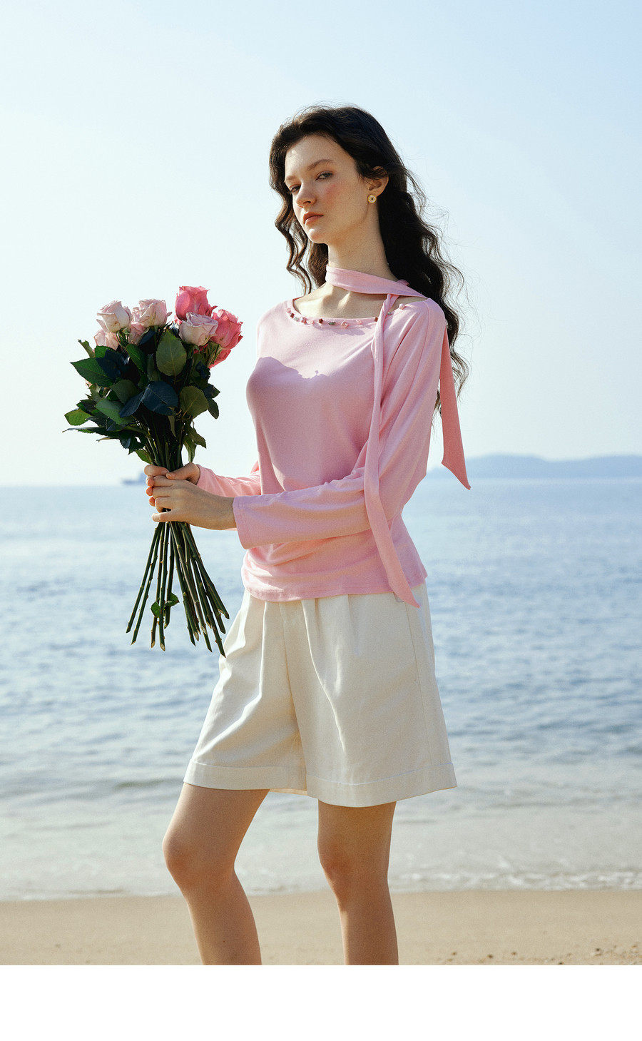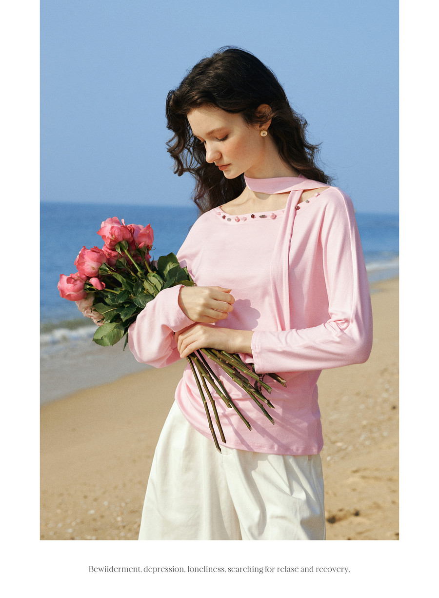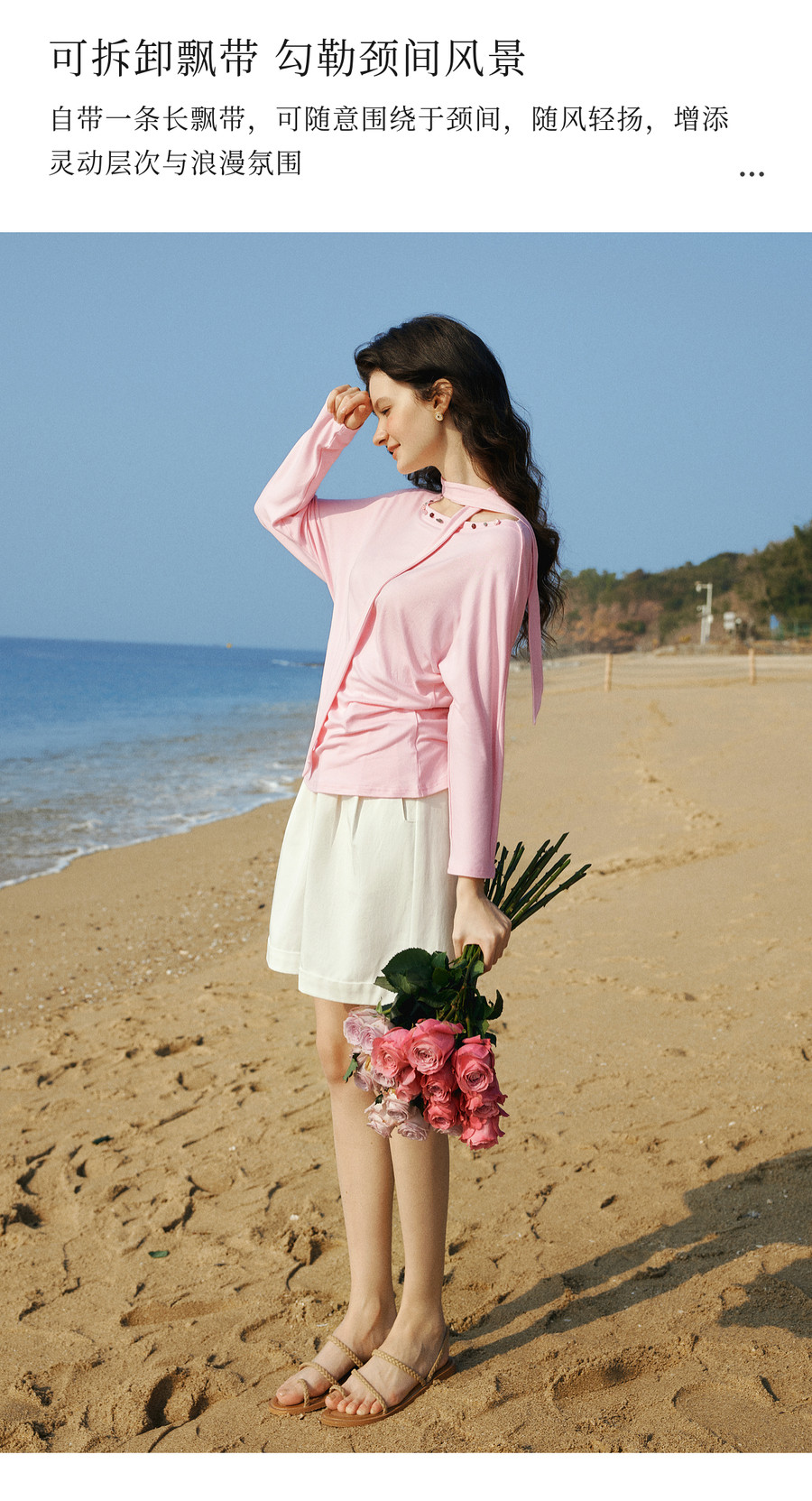 欧芮儿2026春新款温柔粉飘带挂脖长袖T恤女高级感气质一字领上衣