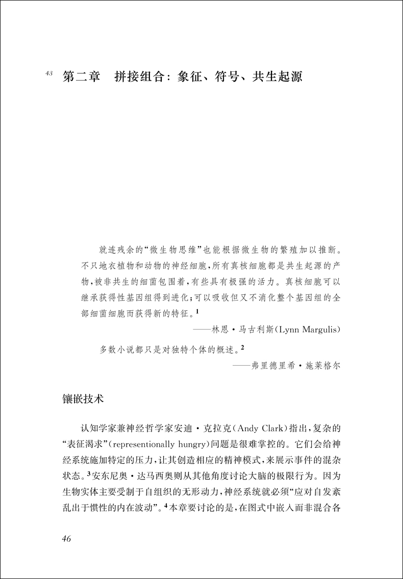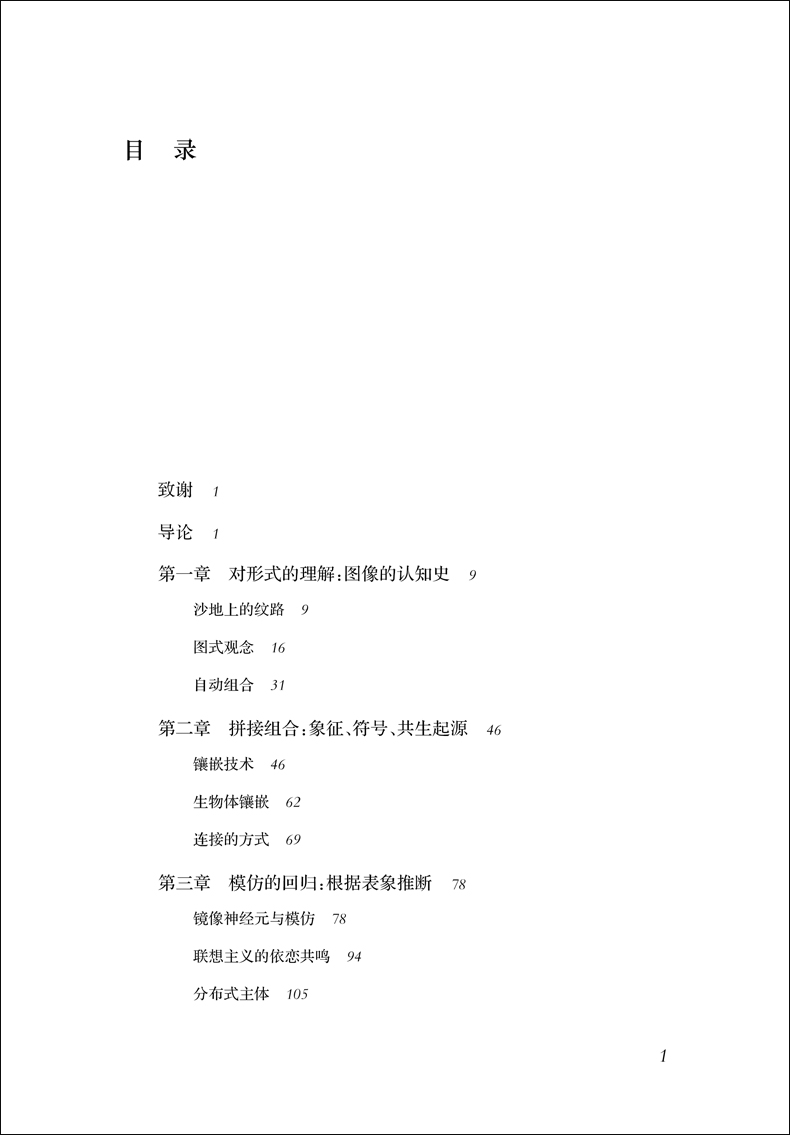 全书分为六个章节,每章探讨一种具体的思维模式。第一章以浪漫主义者的线条和色彩为例来探讨为什么有些形式能与不同的文化环境都相吻合;第二章从共生起源与神经的同步性角度来解释象征体系;第三章根据镜像神经元与引起共情的生物原理来解释艺术中的模仿问题;第四章从意识“深度”和投射错觉入手,解释为什么旧石器时代的洞穴艺术、澳大利亚的土著艺术,乃至现代的装置艺术,都能引起观众的共鸣;第五章根据人格解体和心灵“剧场”的反成像来重新评价意识流电影;第六章根据定向注意力和自创生来探讨土木工程和生物艺术。