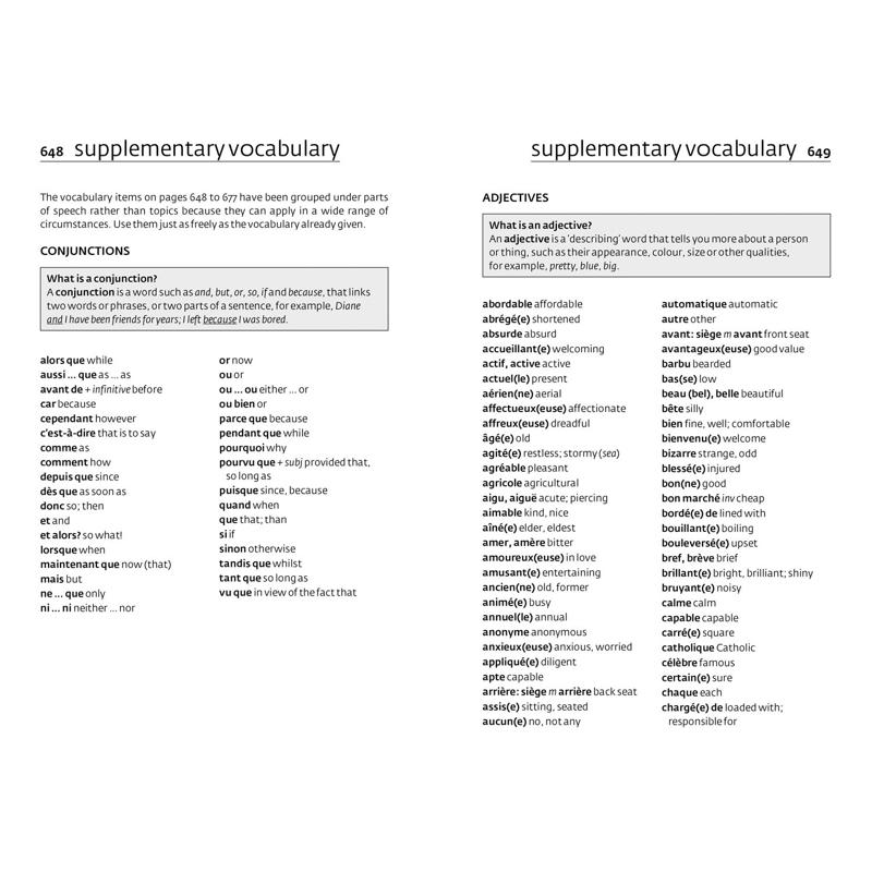 Grammar: this section provides easily accessible information in an attractively presented layout. Key grammatical points are highlighted throughout the text as a means of reinforcement. Hundreds of examples of real French illustrate clearly the grammatical points being made. In addition, a full glossary gives clear and simple explanations of grammatical terminology.