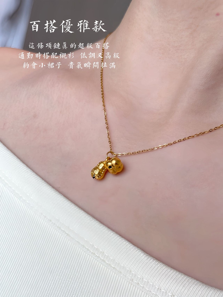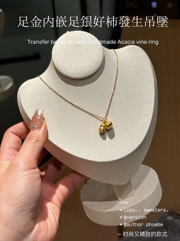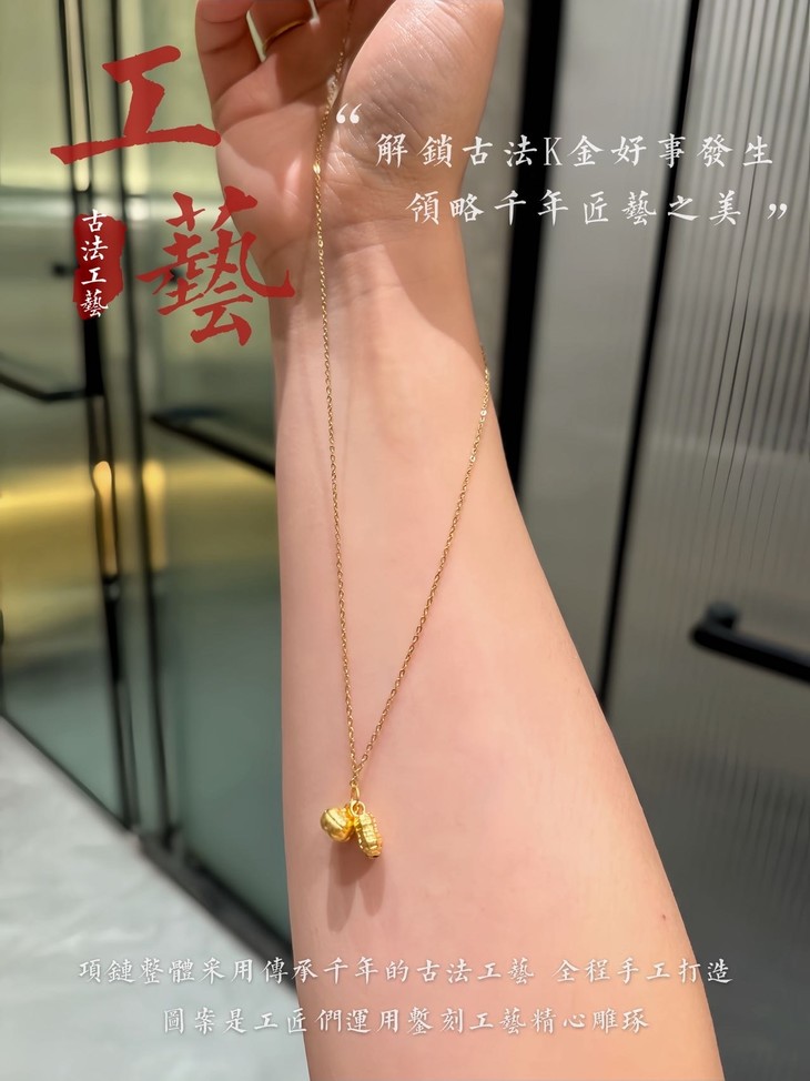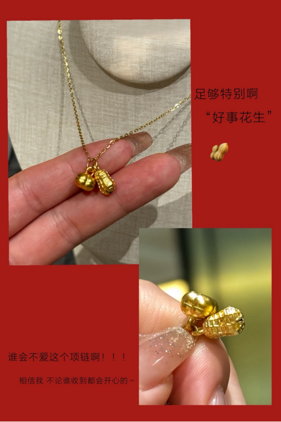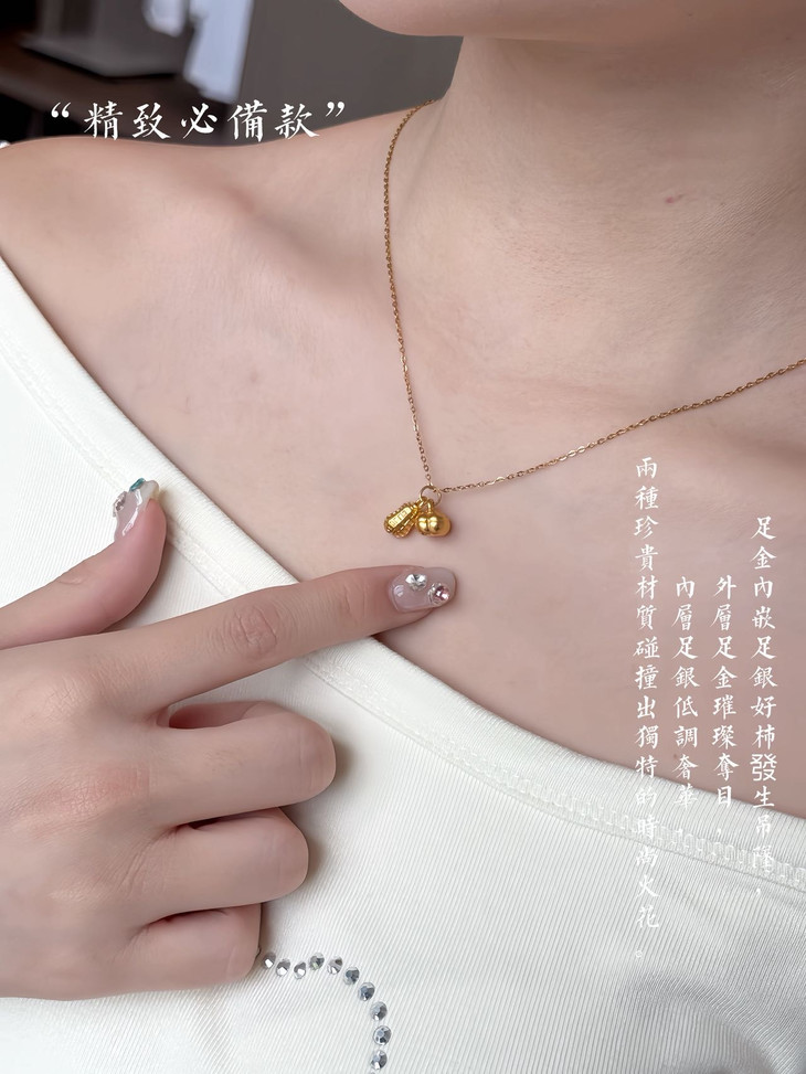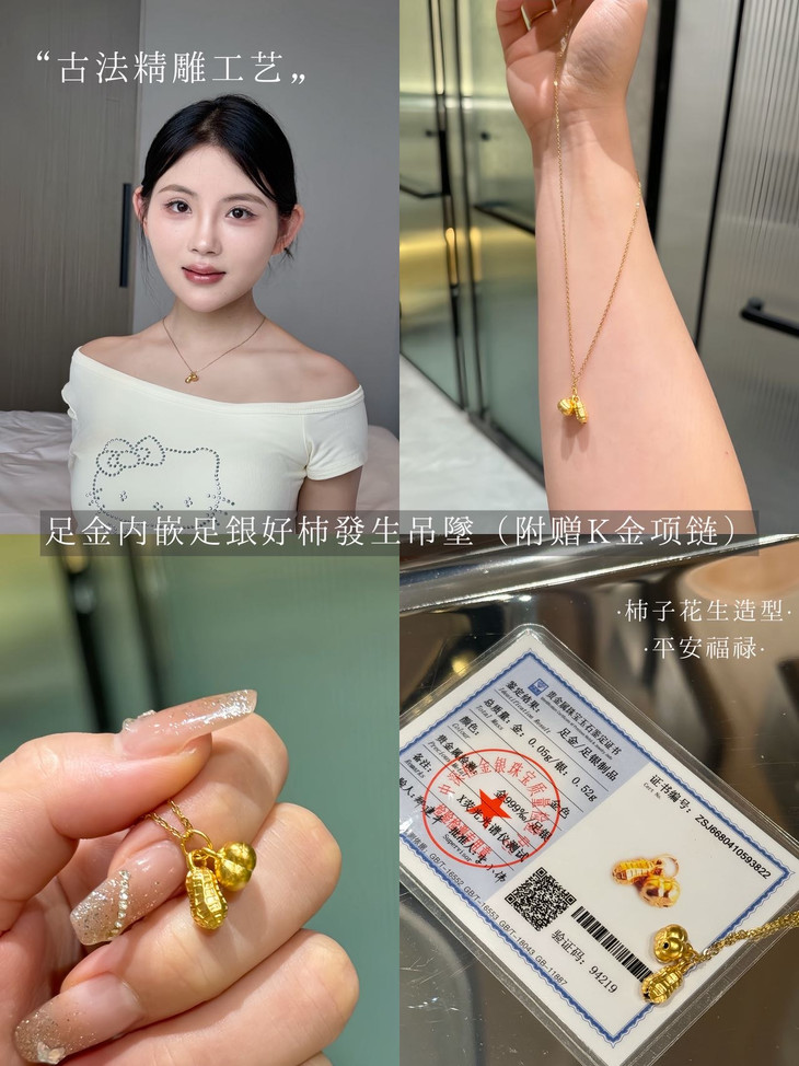 被追着问的宝藏首饰! 足金内嵌足银好柿發生吊坠,外层足金璀璨夺目, 内层足银低调奢华,两种珍贵材质碰撞出独特的时尚火花。 圆润饱满的柿子搭配俏皮花生,寓意“好事发生”,把美好祈愿随身携带。 还贴心附赠K金项链,质感超绝,不管什么场合戴,都能轻松吸睛。