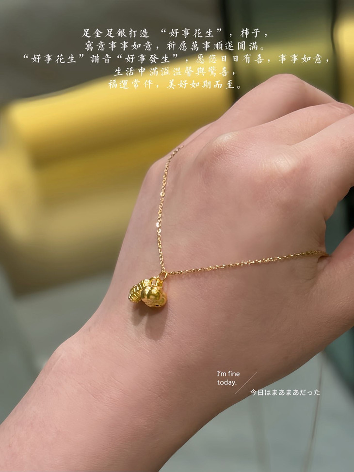 送礼不知道送什么? 看看这款足金内嵌足银好柿發生吊坠! 饱满柿子搭配俏皮花生,寓意“好事发生”,把满满的祝福送给亲友。 还贴心附赠K金项链,简约大方,不易变形,实用又有排面。