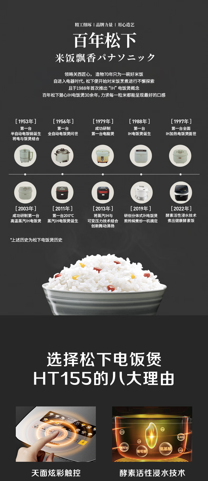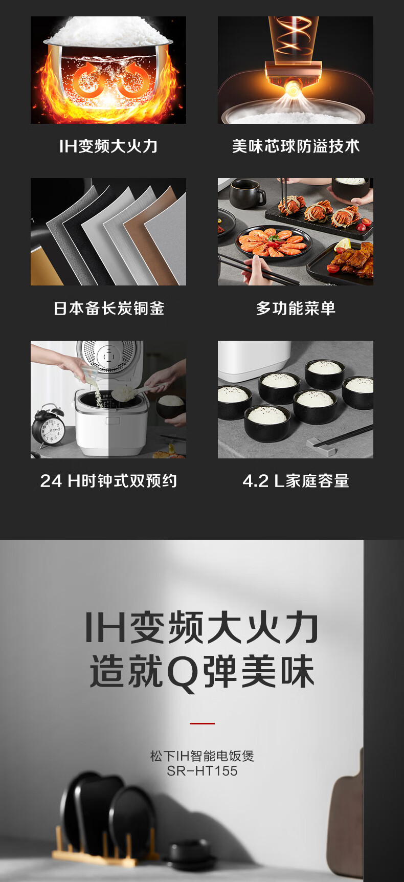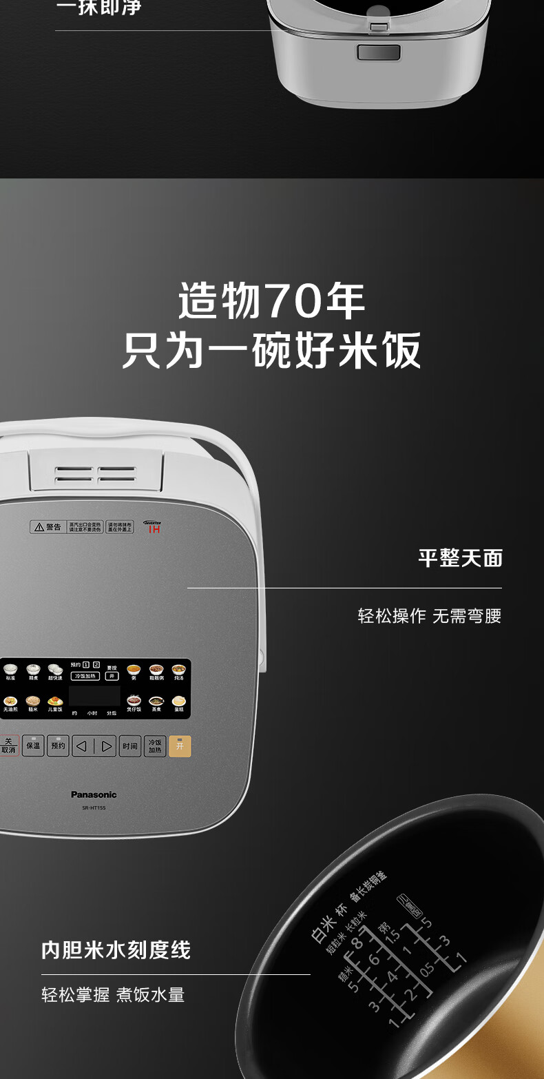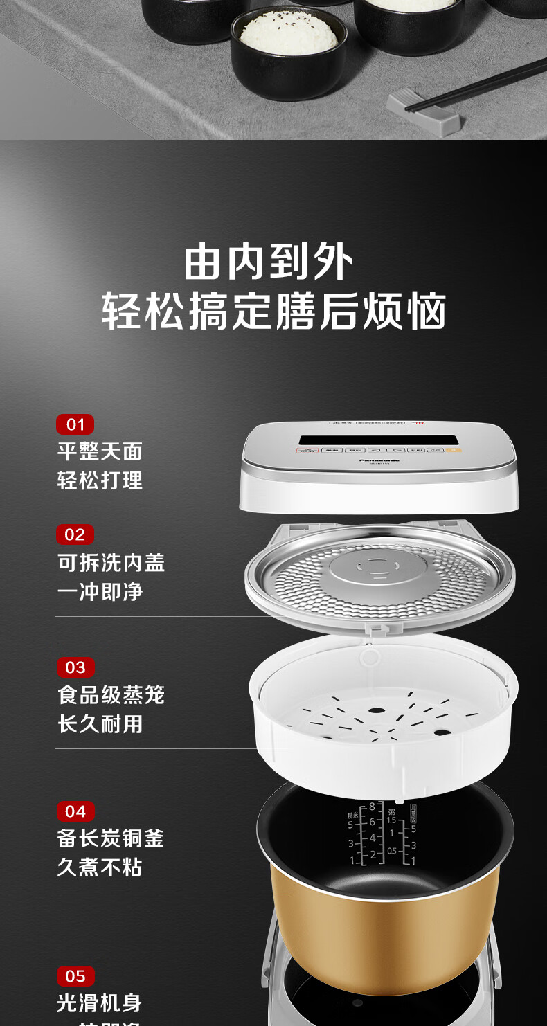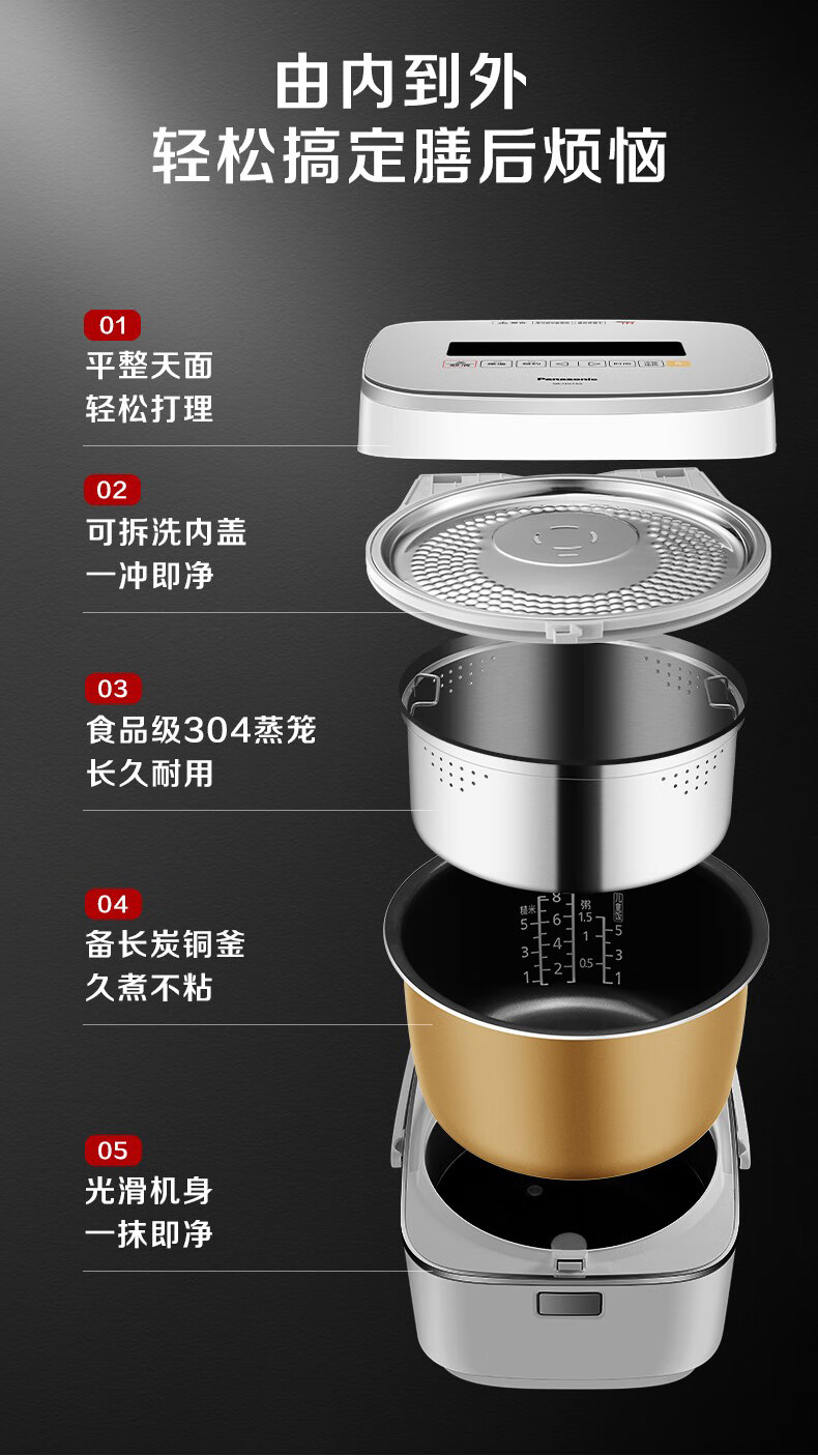 松下(Panasonic)低糖电饭煲家用4-5人IH加热电饭锅智能煮饭锅备长炭铜釜可拆洗4.2升容量 低糖款SR-HTL155(原香柴火饭SR-HT155)