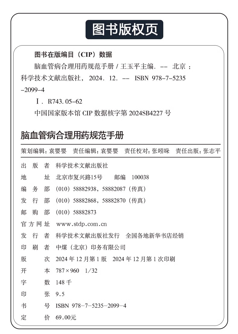 脑血管病合理用药规范手册 王玉平主编 缺血性脑血管病的药物治疗 少见脑血管病 药源性疾病 9787523520994科学技术文献出版社