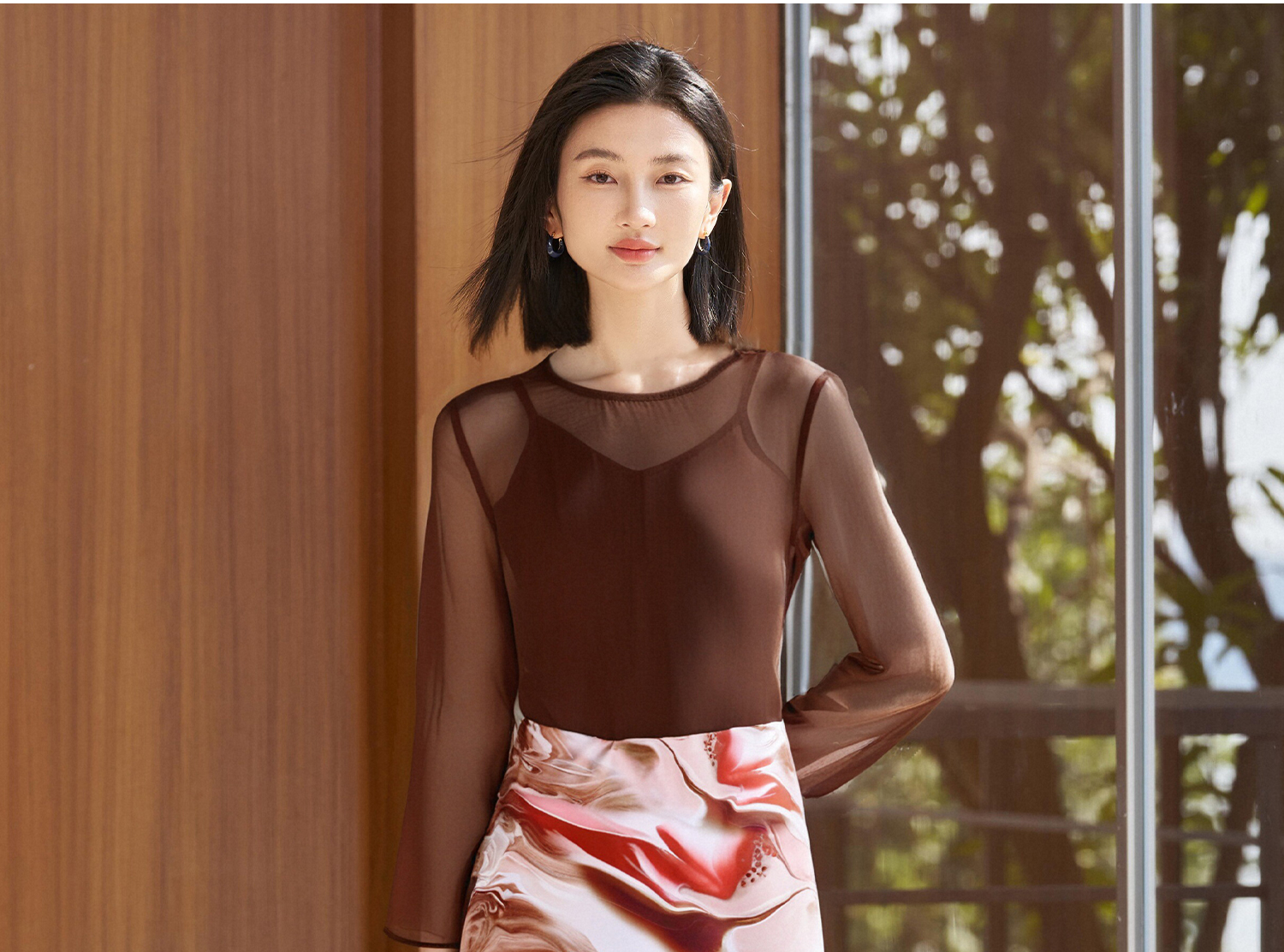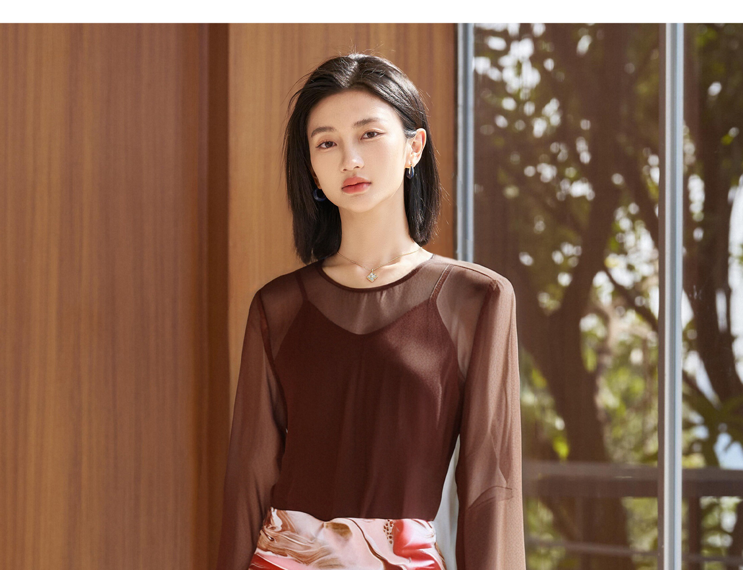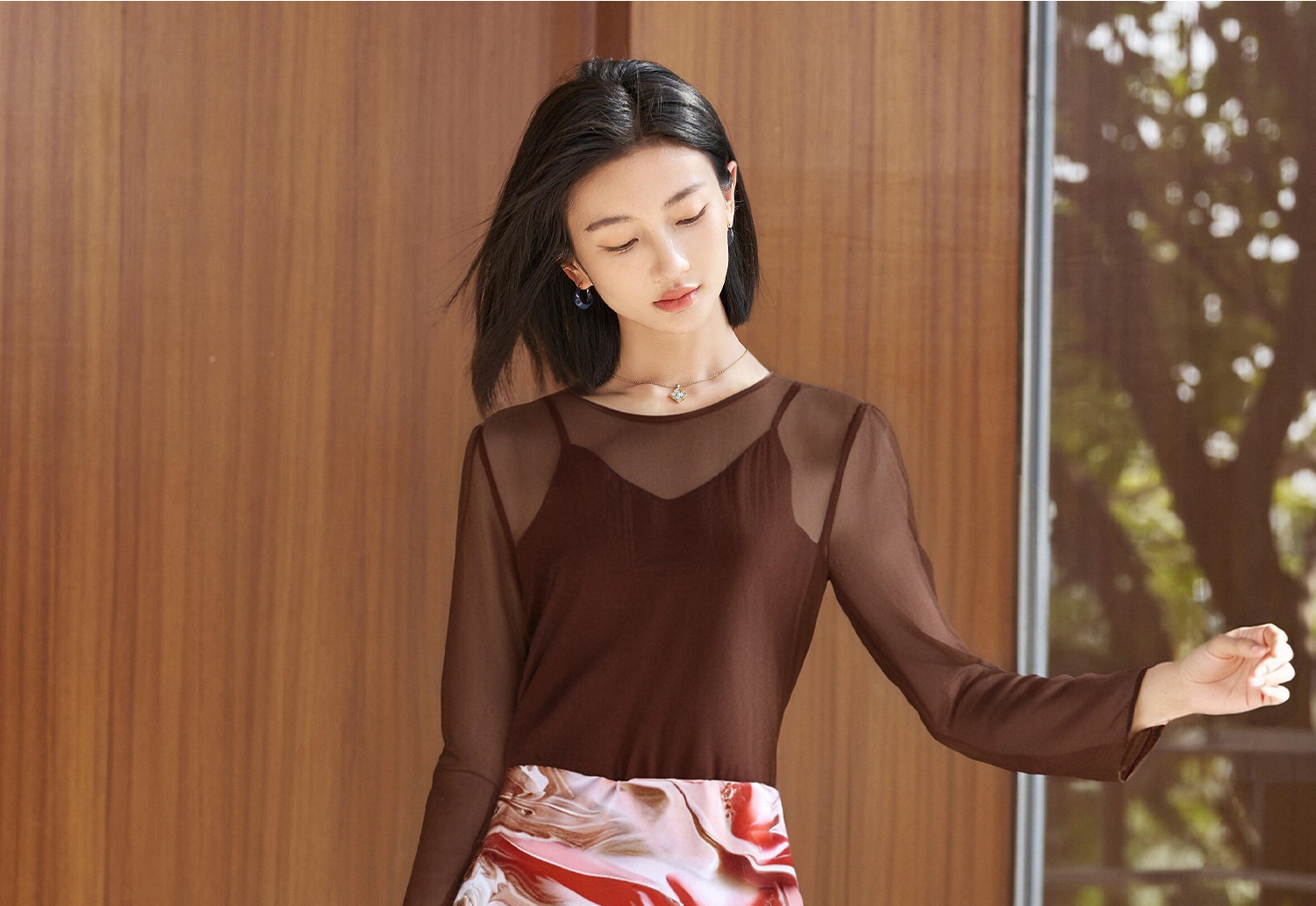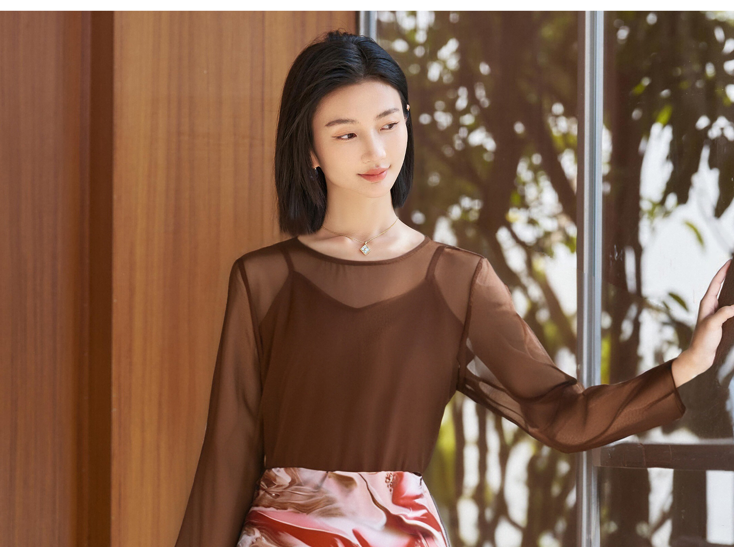 咖色罩衫+印花半身裙套装女3891