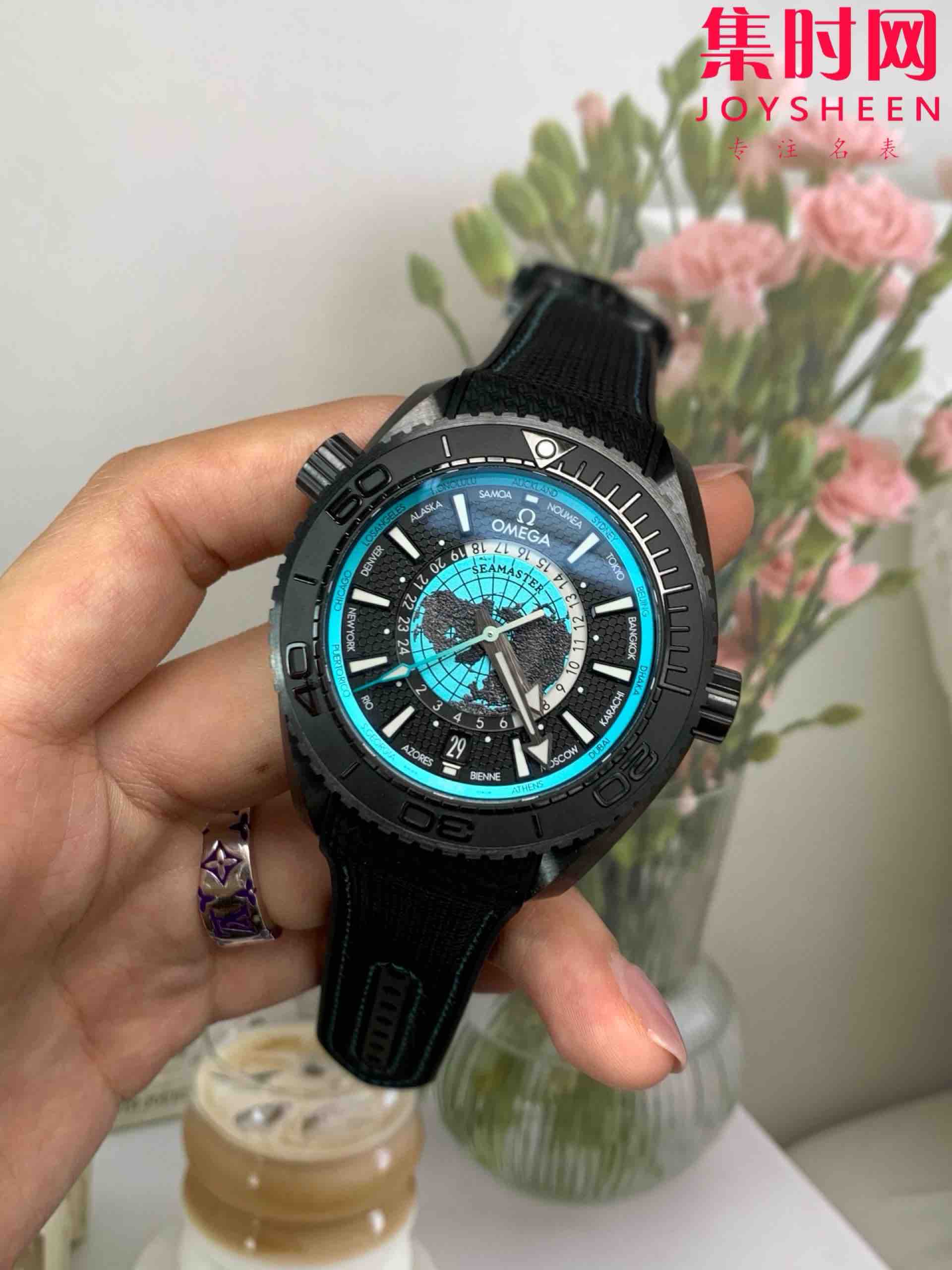 欧米茄呈献全新海马系列海洋宇宙世界时腕表。自环球旅行中汲取灵感,全新腕表沿袭了著名的"深海之黑"腕表的经典设计风格,黑色二氧化陶瓷打造的45.5毫米表壳,防水高达600米。