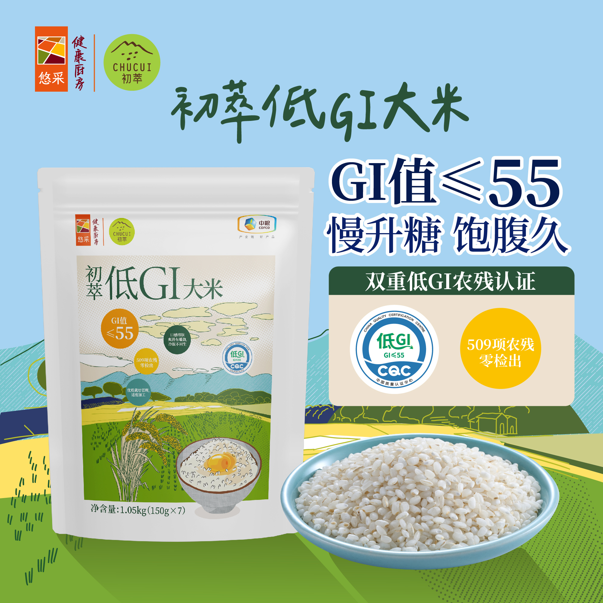 【送2包中粮悠采有机荞麦400g】中粮初萃低GI大米1.05kg(150g*7)-(大米效期至26年8月18日;荞麦效期至27年1月)-专享价