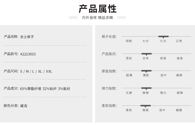 材质成分: 聚酯纤维65% 粘胶纤维(粘纤)32%氨纶3%