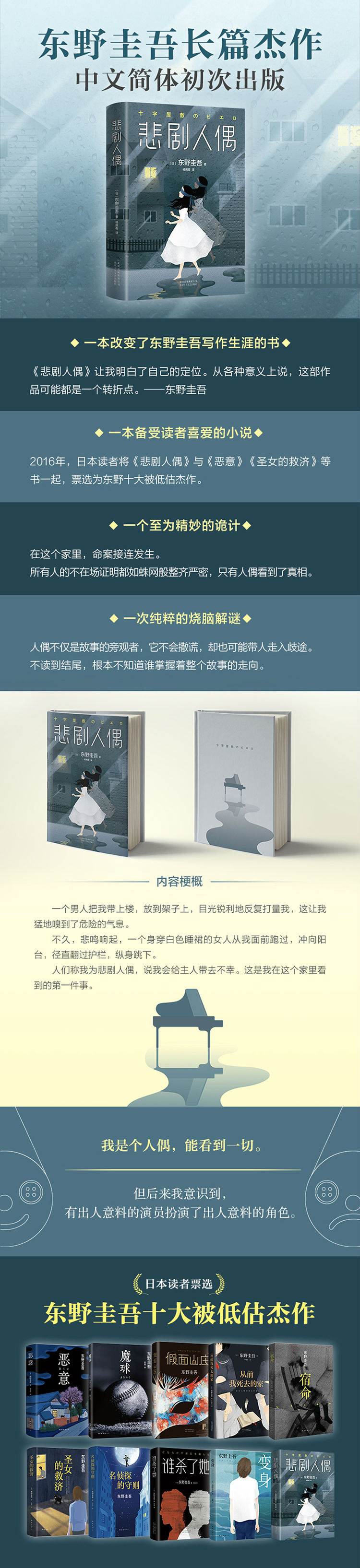 这是一次纯粹的烧脑解谜,与东野的其他作品完全不同:人偶不仅仅是故事的旁观者,它不会撒谎,却也可能带人走入歧途。不读到结尾,根本不知道谁掌握着整个故事的走向。这本书备受读者喜爱:2016年,日本读者将《悲剧人偶》票选为东野十大被低估杰作:《恶意》《圣女的救济》《魔球》《名侦探的守则》《假面山庄》《谁杀了她》《从前我死去的家》《变身》《宿命》《悲剧人偶》。