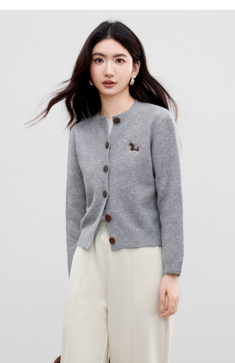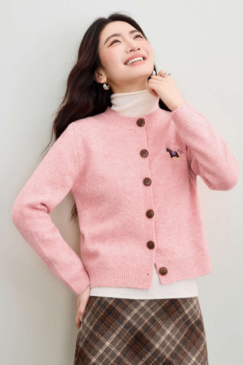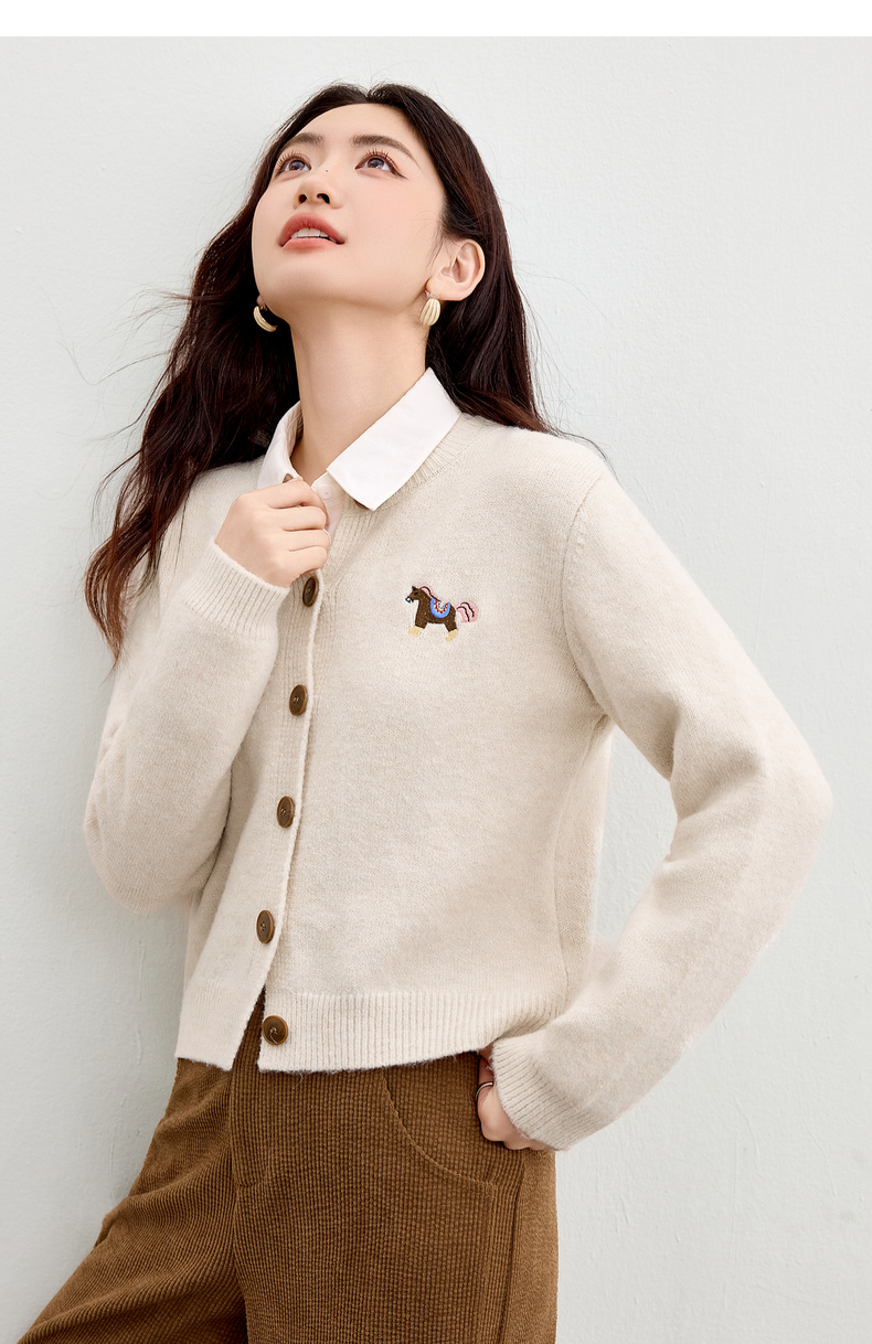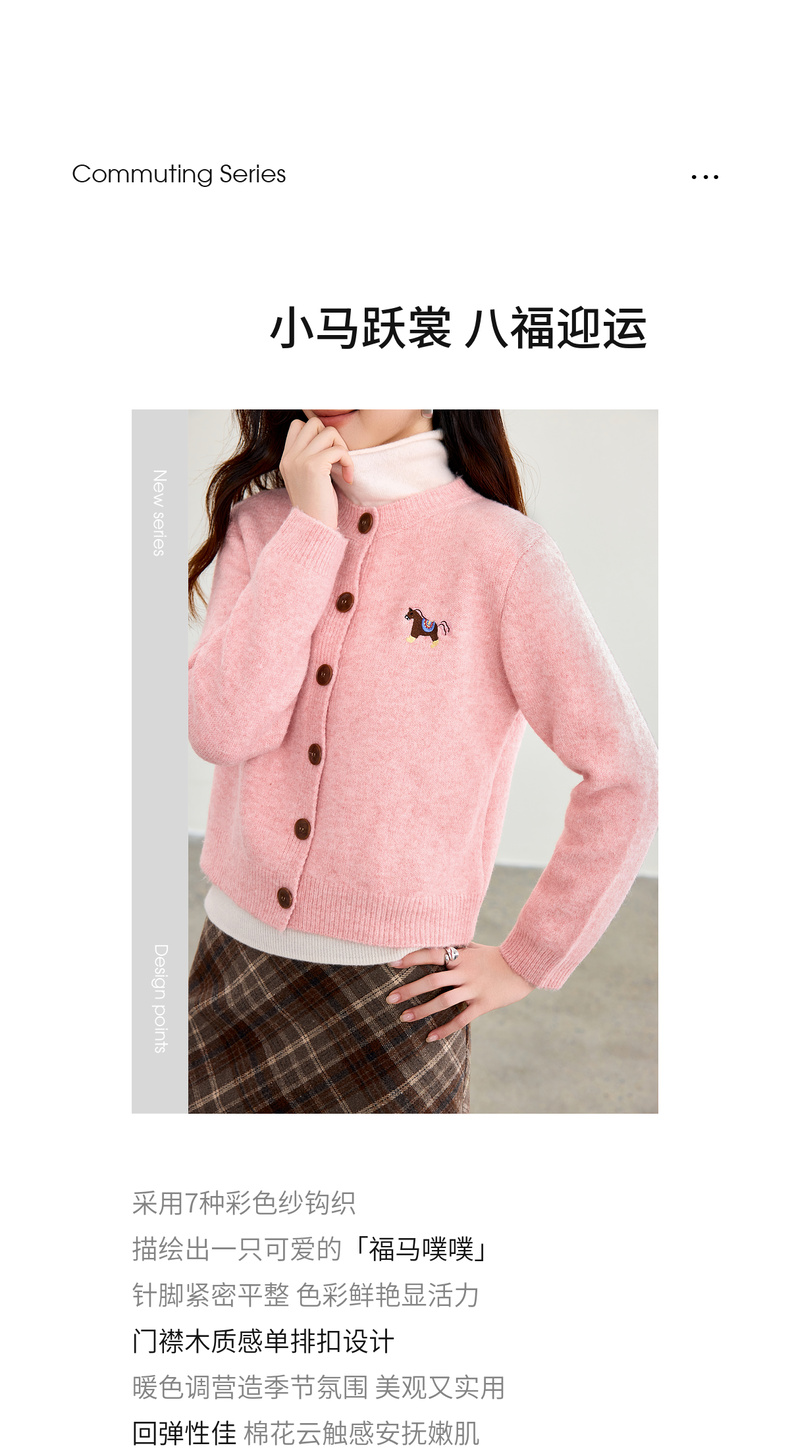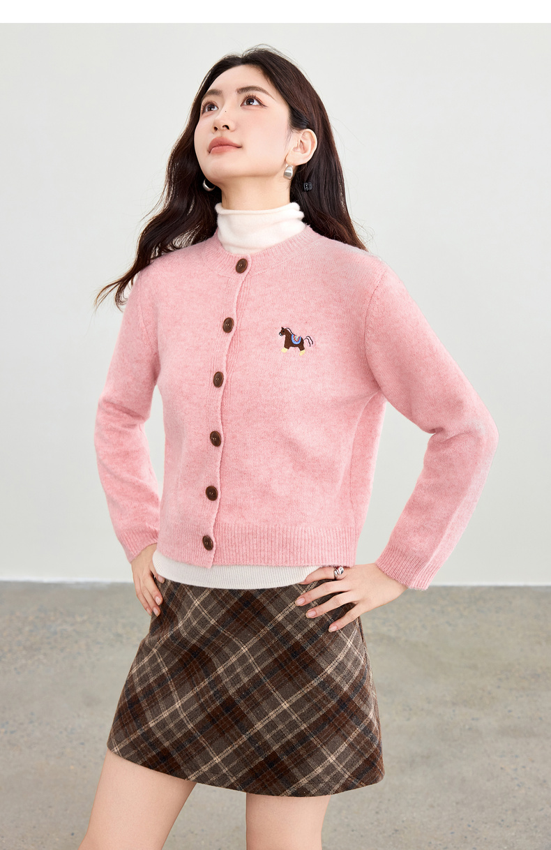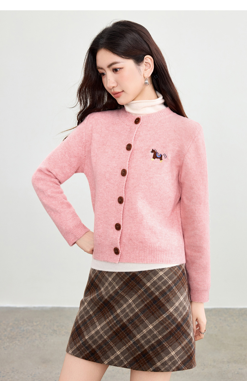 【内购】【含绵羊毛】通勤小马刺绣圆领撞色单排扣落肩长袖超弹开衫毛衣-W53EB2690
