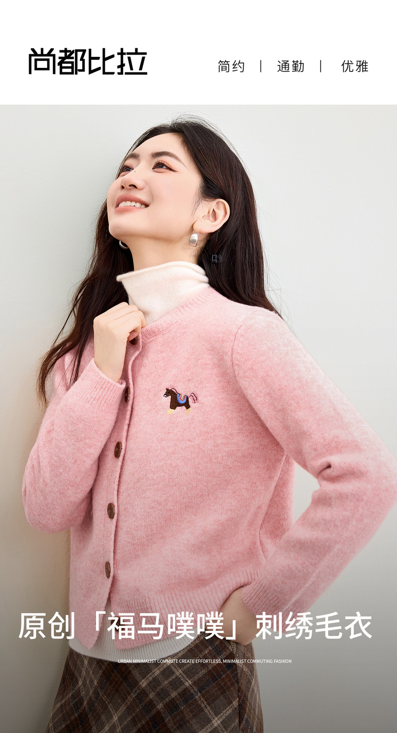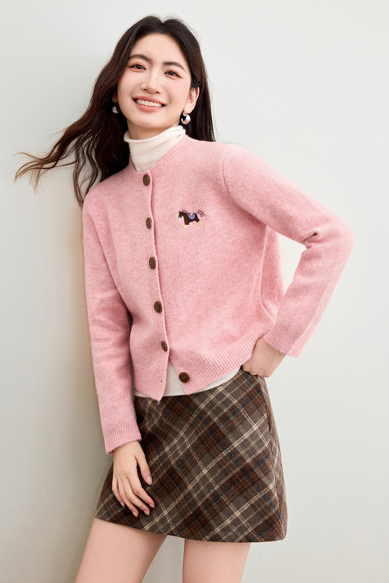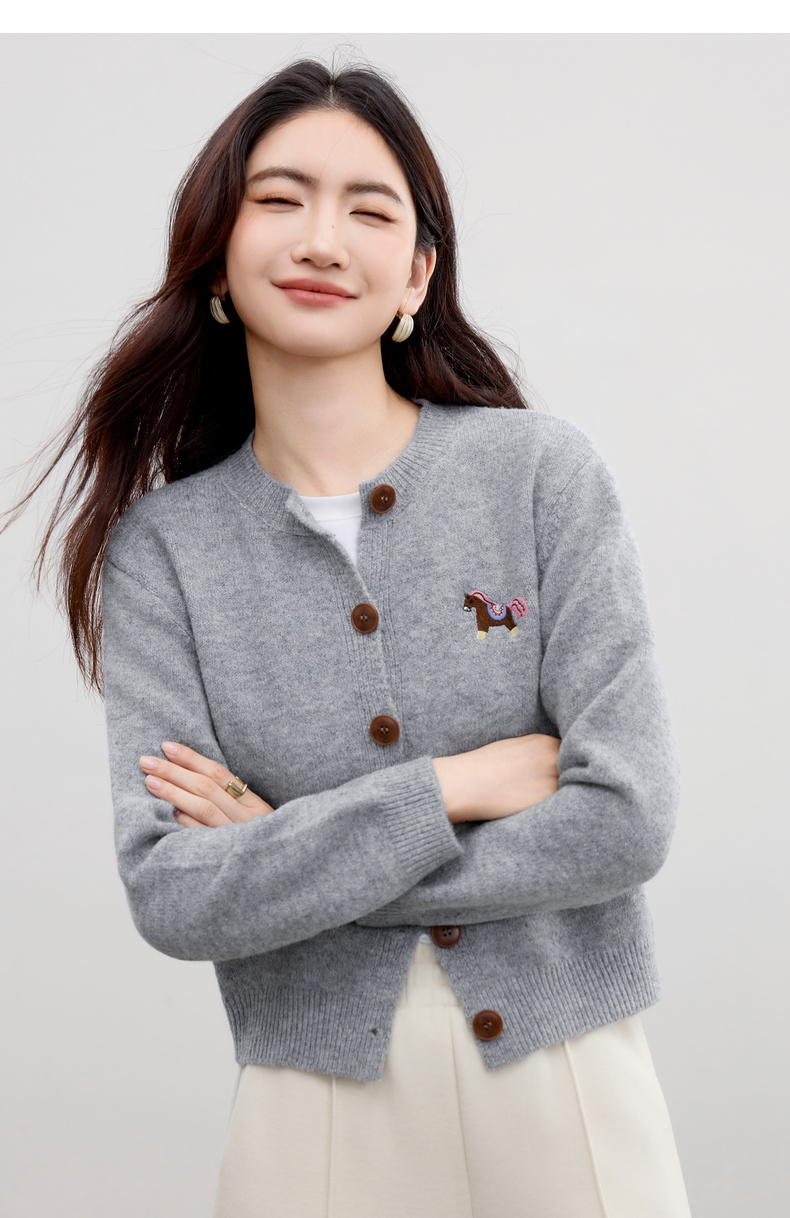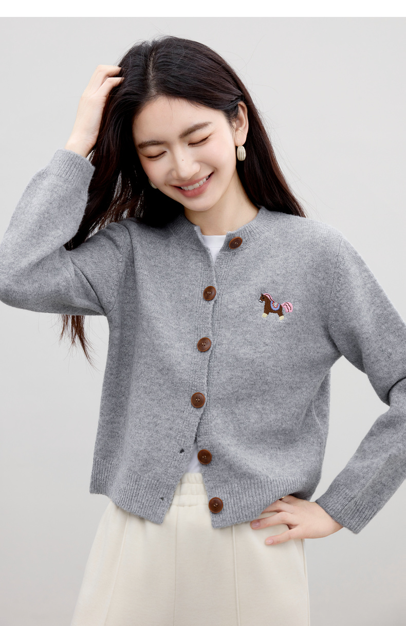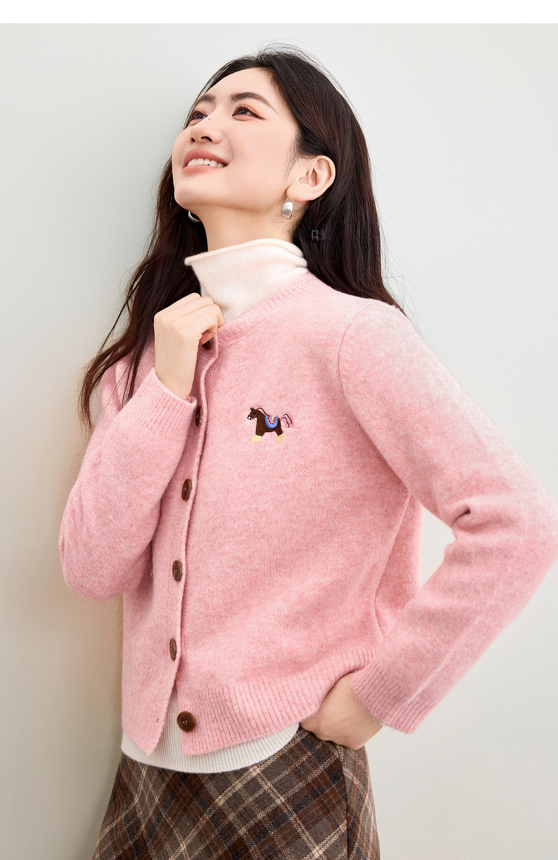 【内购】【含绵羊毛】通勤小马刺绣圆领撞色单排扣落肩长袖超弹开衫毛衣-W53EB2690