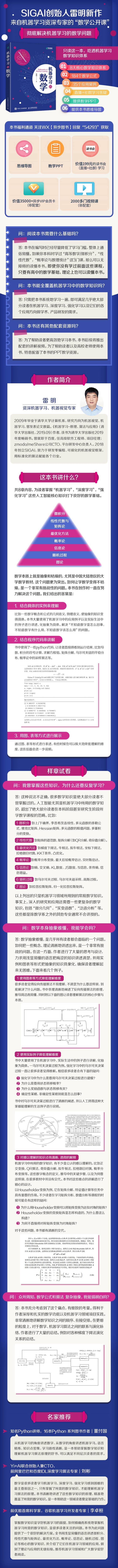 本书的目标是帮助读者全面、系统地学习机器学习所必须的数学知识。全书由8章组成,力求精准、最小地覆盖机器学习的数学知识。包括微积分,线性代数与矩阵论,**化方法,概率论,信息论,随机过程,以及图论。本书从机器学习的角度讲授这些数学知识,对它们在该领域的应用举例说明,使读者对某些抽象的数学知识和理论的实际应用有直观、具体的认识。 本书内容紧凑,结构清晰,深入浅出,讲解详细。可用作计算机、人工智能、电子工程、自动化、数学等相关专业的教材与教学参考书。对人工智能领域的工程技术人员与产品研发人员,本书也有很强的参考价值。对于广大数学与应用的数学爱好者,本书亦为适合自学的读本。