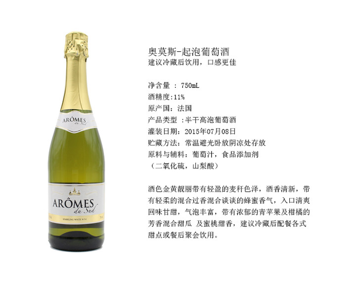【双支特惠装】奥莫斯起泡葡萄酒AROMAS SPARKLING 750ml*2