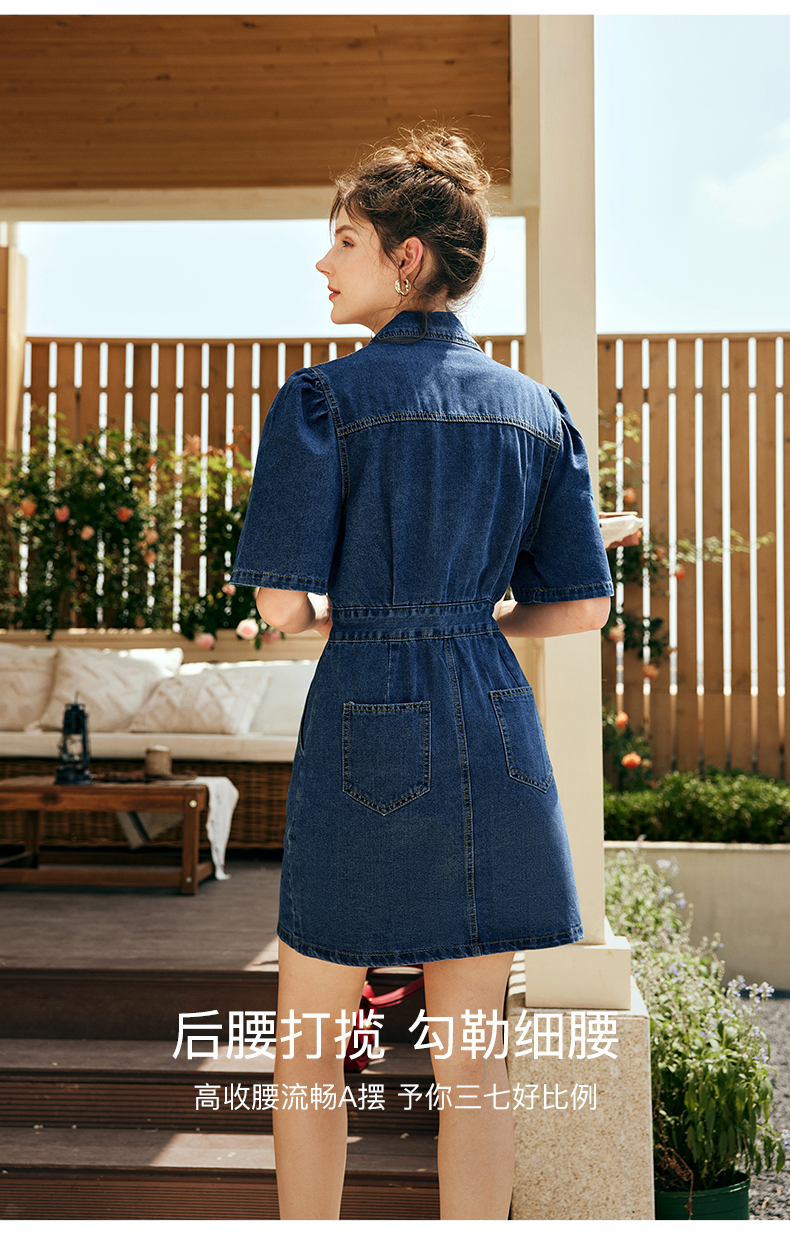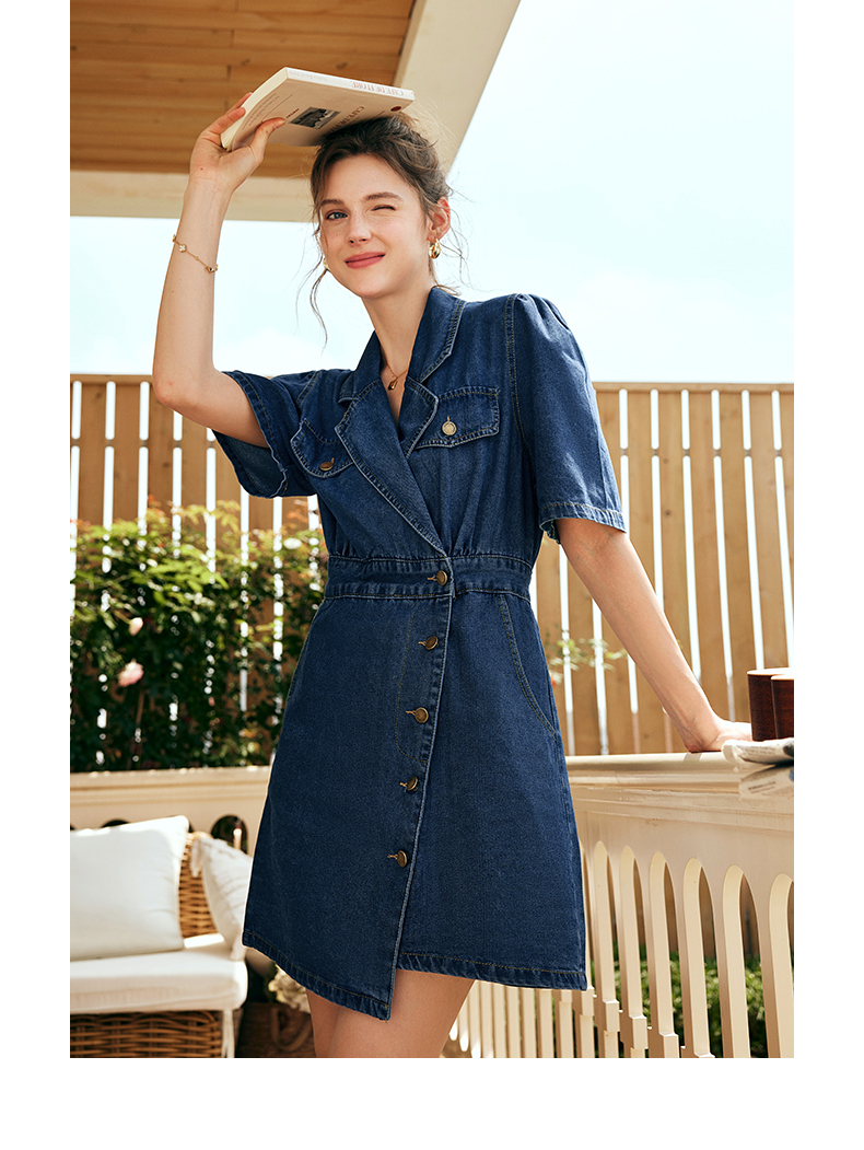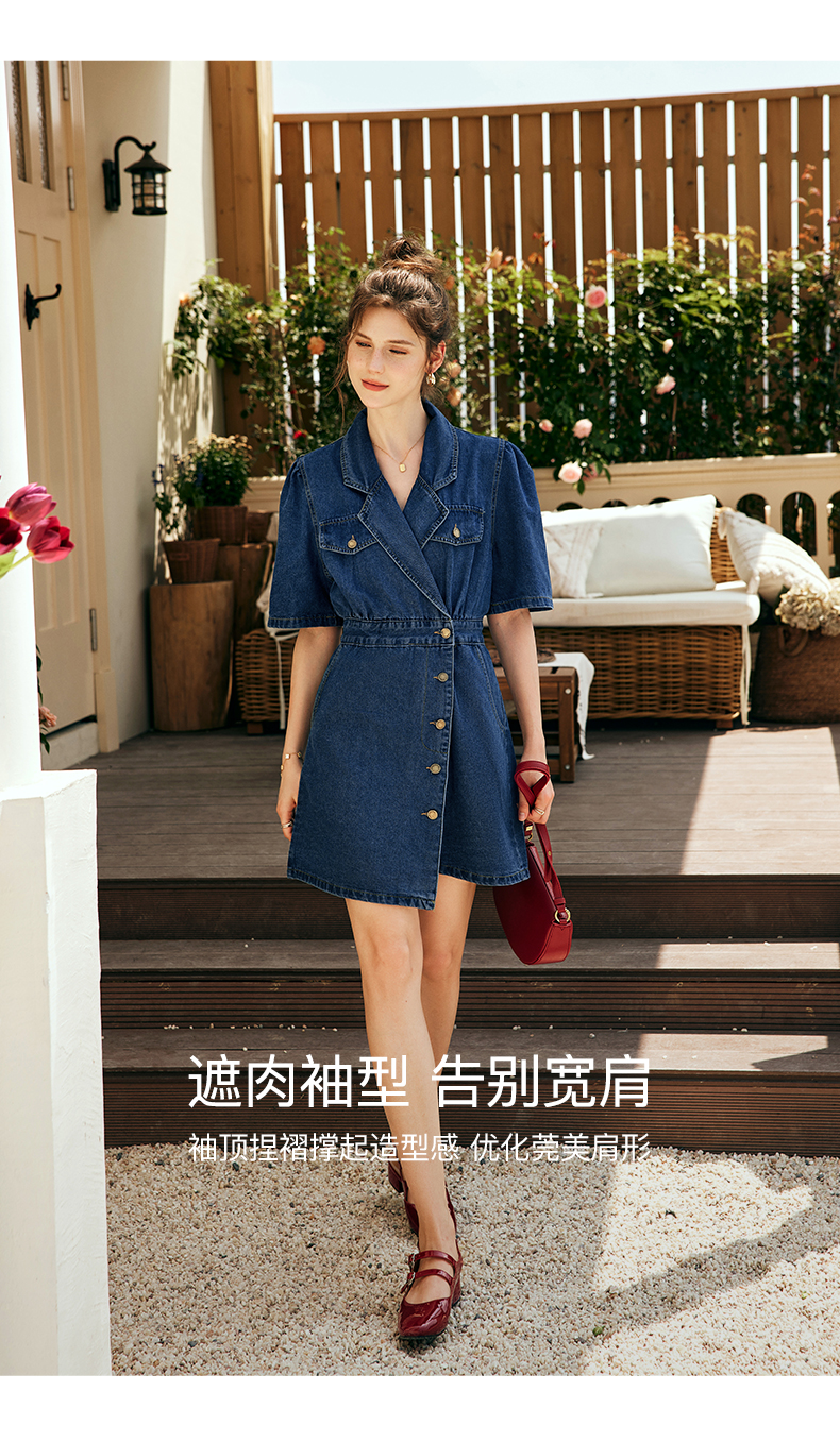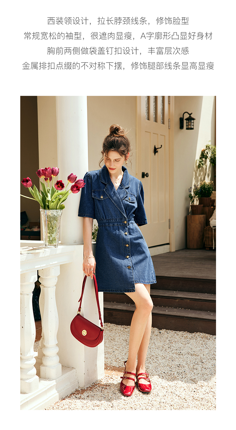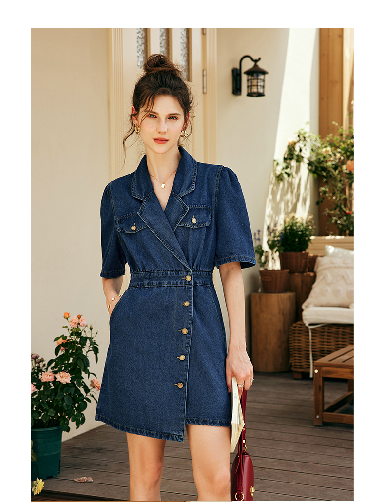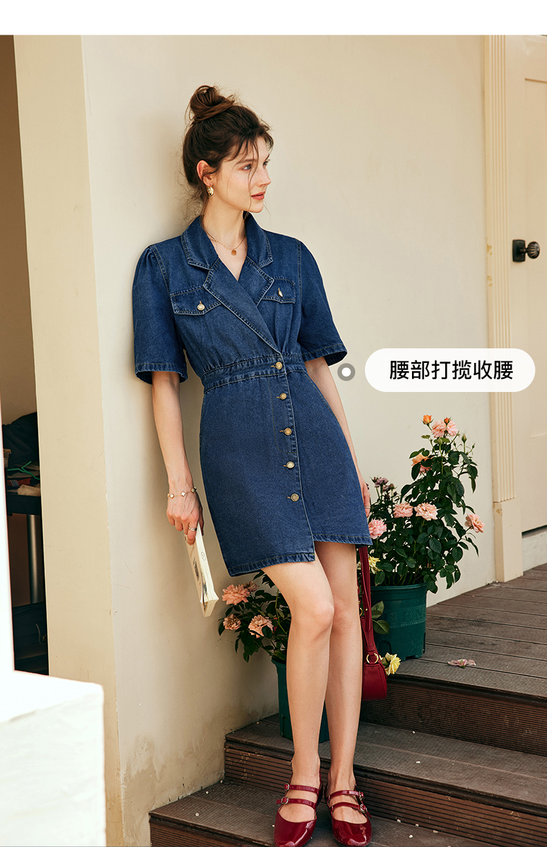 OLrain欧芮儿法式西装领牛仔连衣裙女夏季2023新款收腰不规则裙子