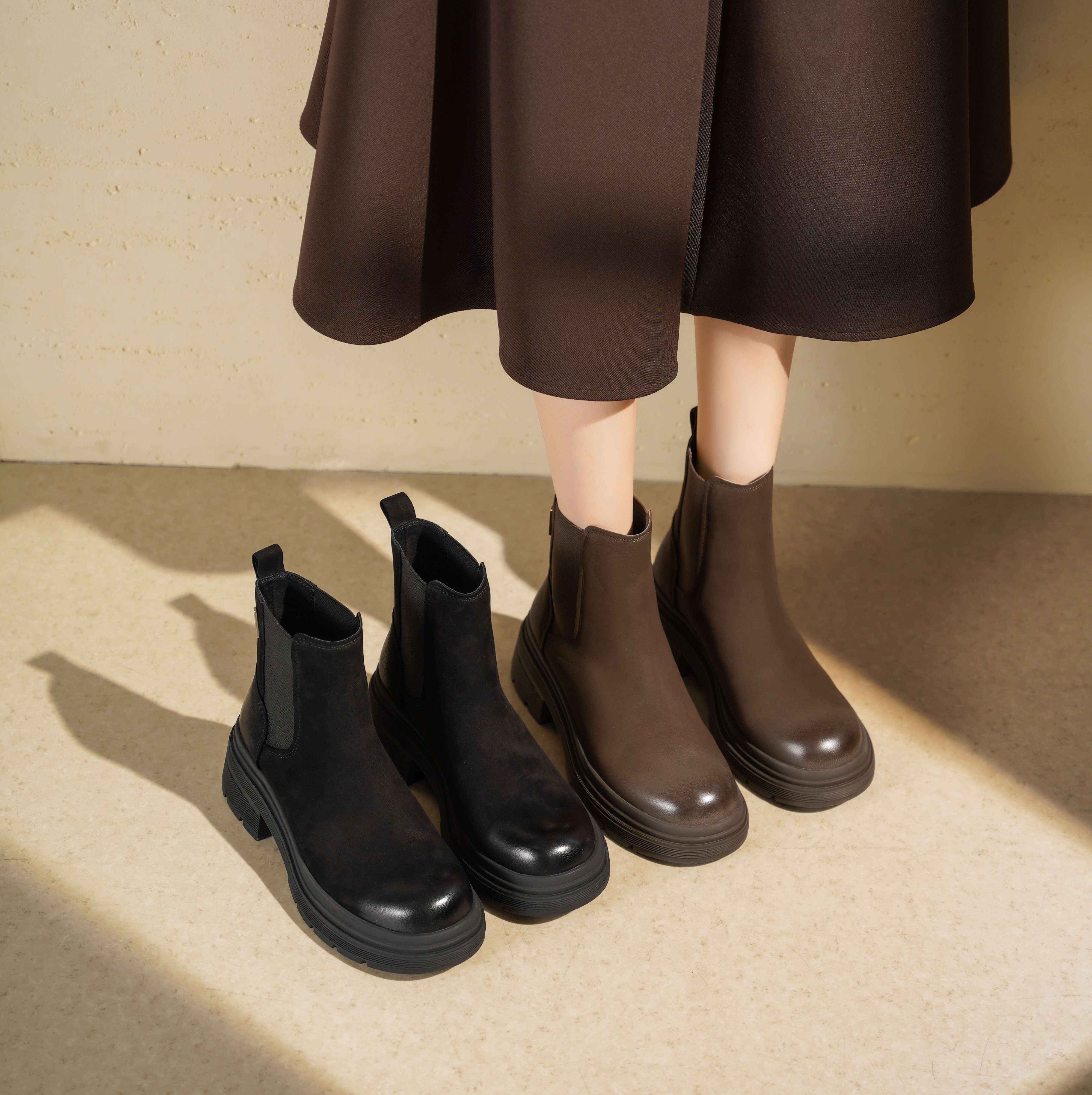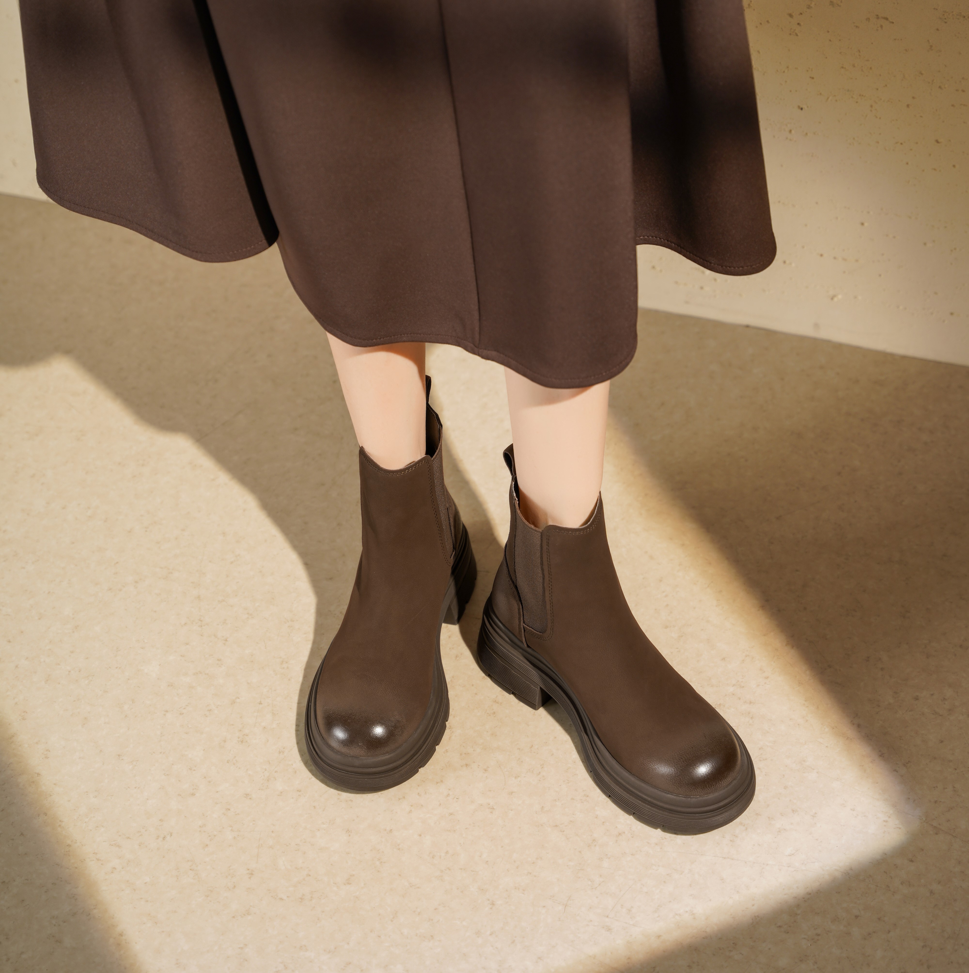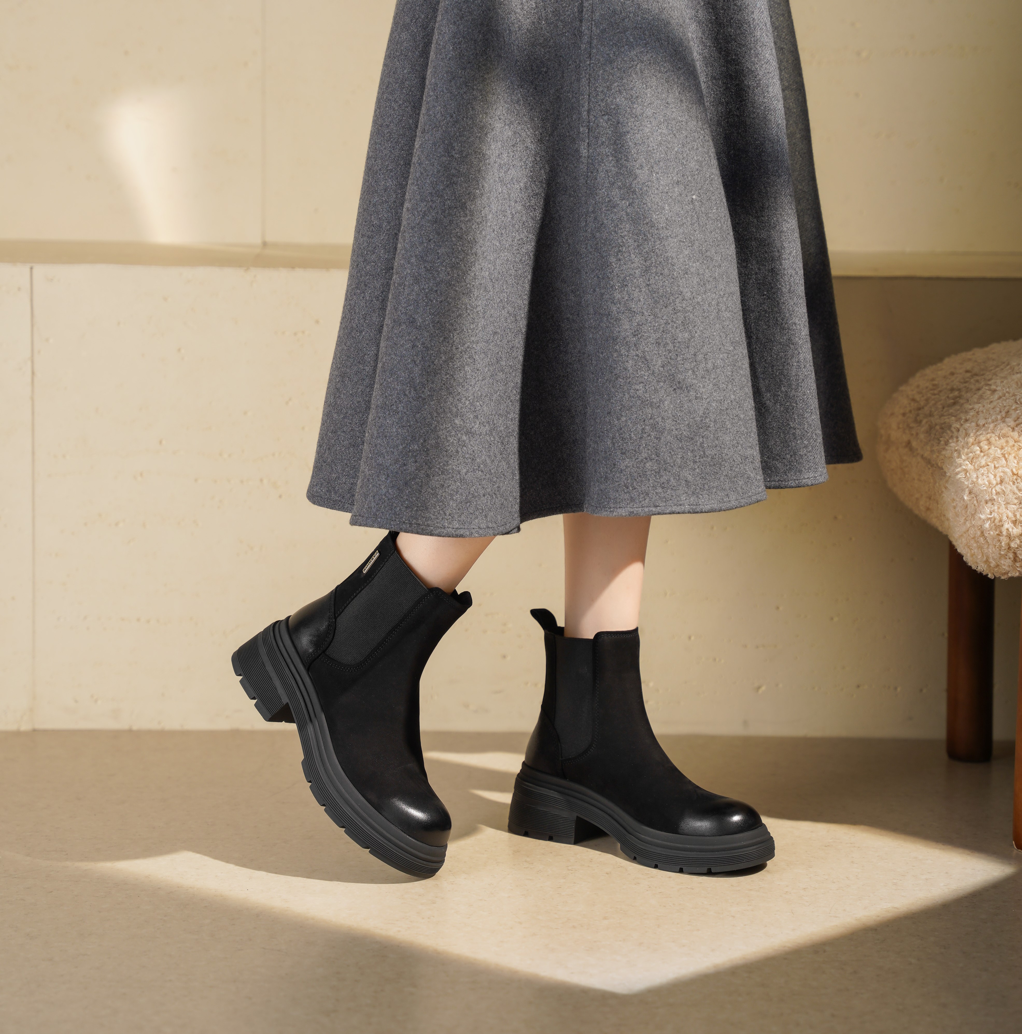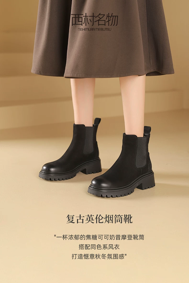 西村名物2025年冬季新款复古拼接简约百搭粗跟英伦风烟筒靴切尔西靴T25DS49121