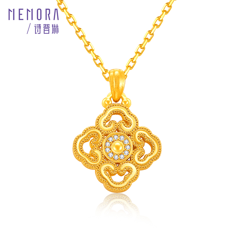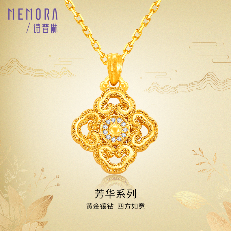 【热卖臻品】MEMORA诗普琳芳华系列黄金镶嵌钻石项链四方如意足金套链LN000801