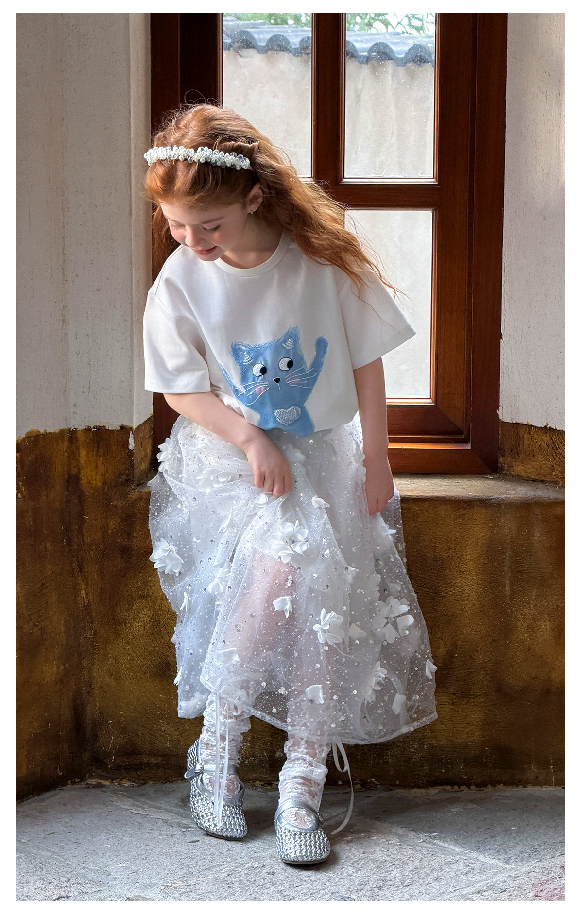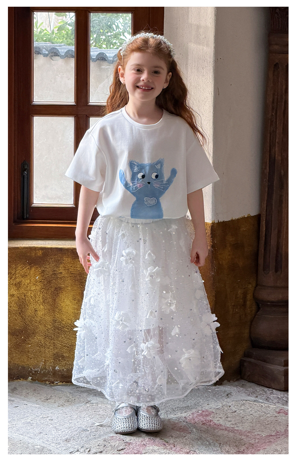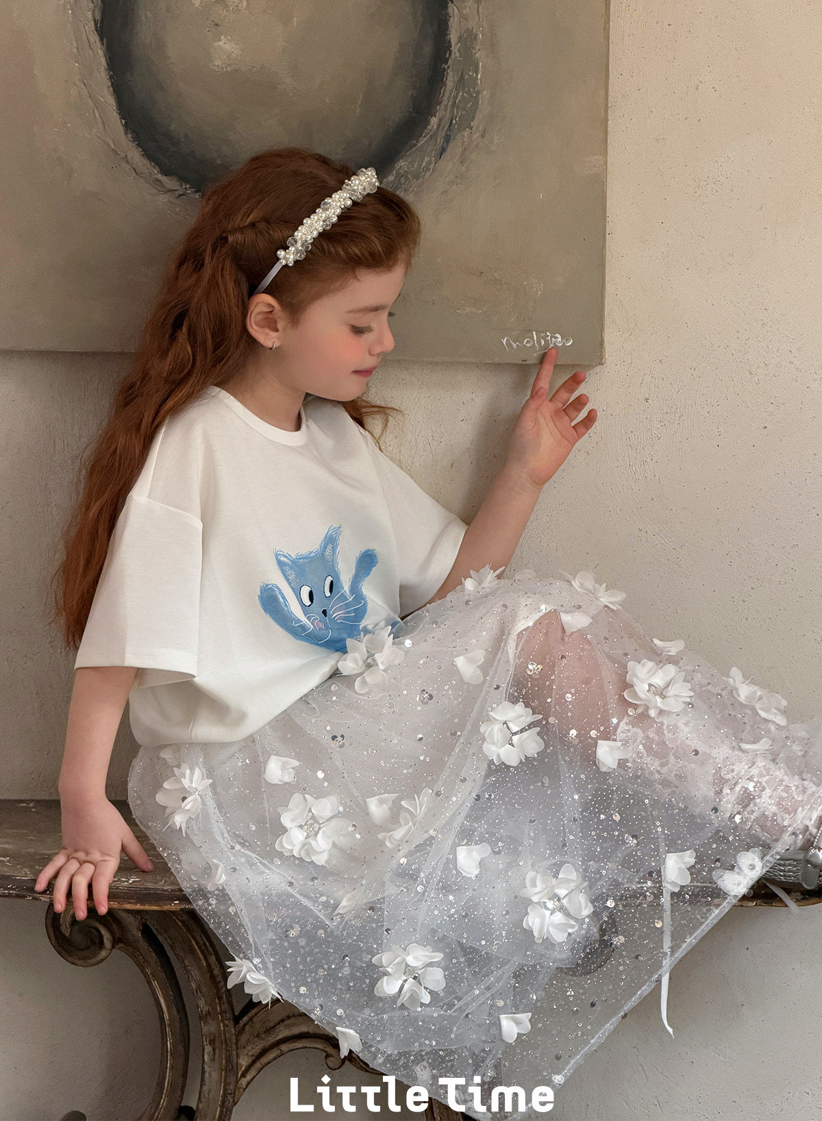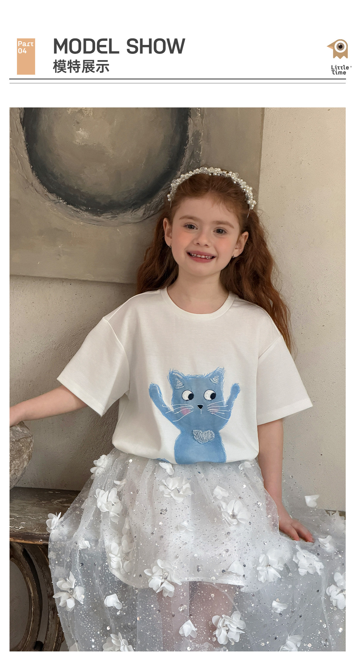 littletime法式白色蓝猫印花水晶短袖T恤女宽松显瘦卡通上衣