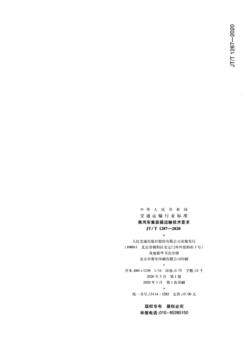 书名:乘用车集装箱运输技术要求(JT/T 1287—2020)