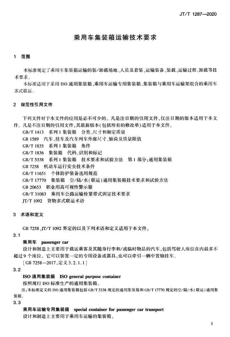 乘用车集装箱运输技术要求(JT/T 1287—2020)