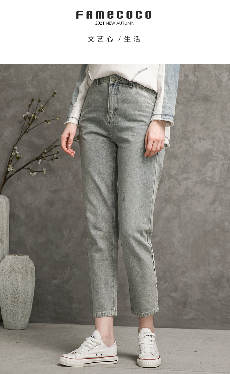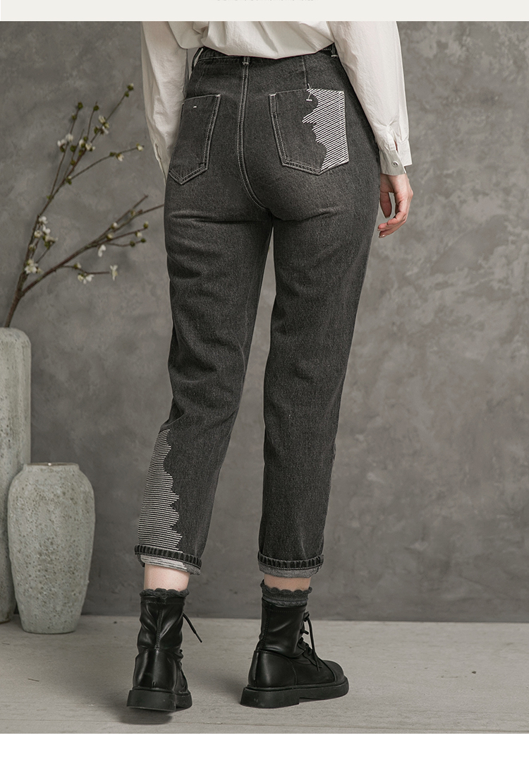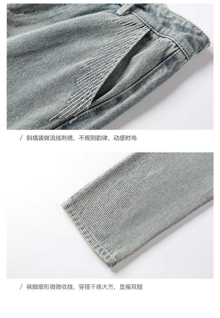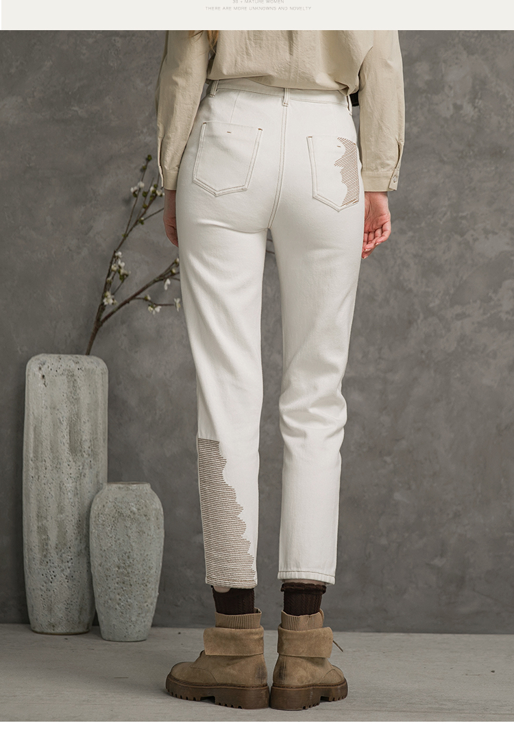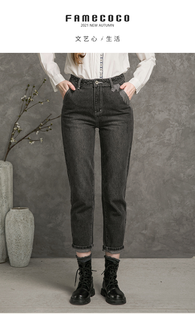 Famecoco范可儿刺绣牛仔裤女秋直筒设计感长裤F216GA009