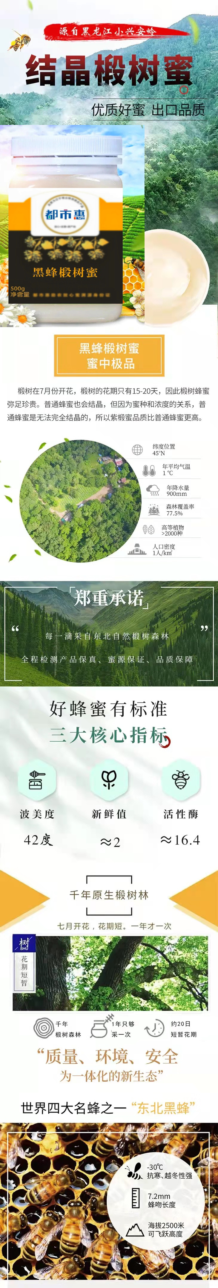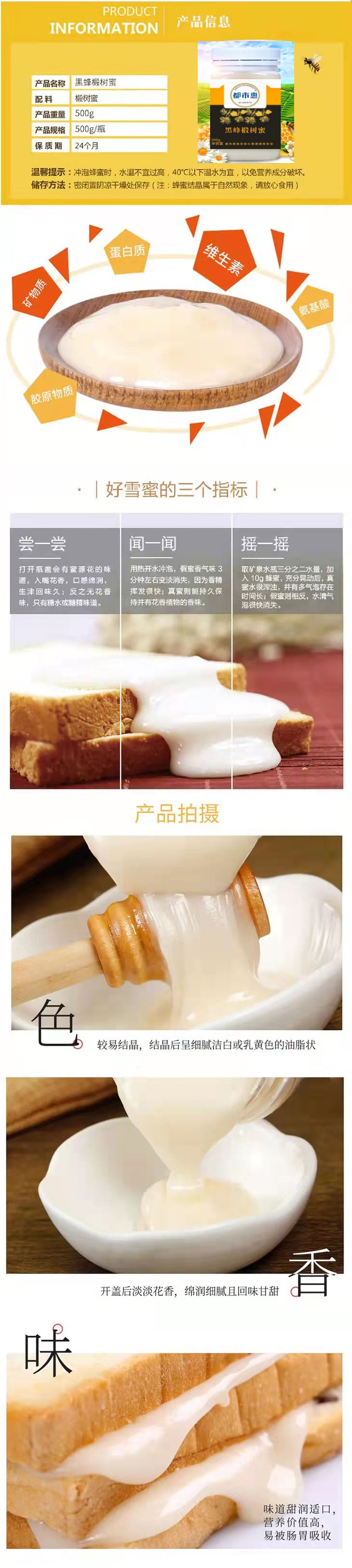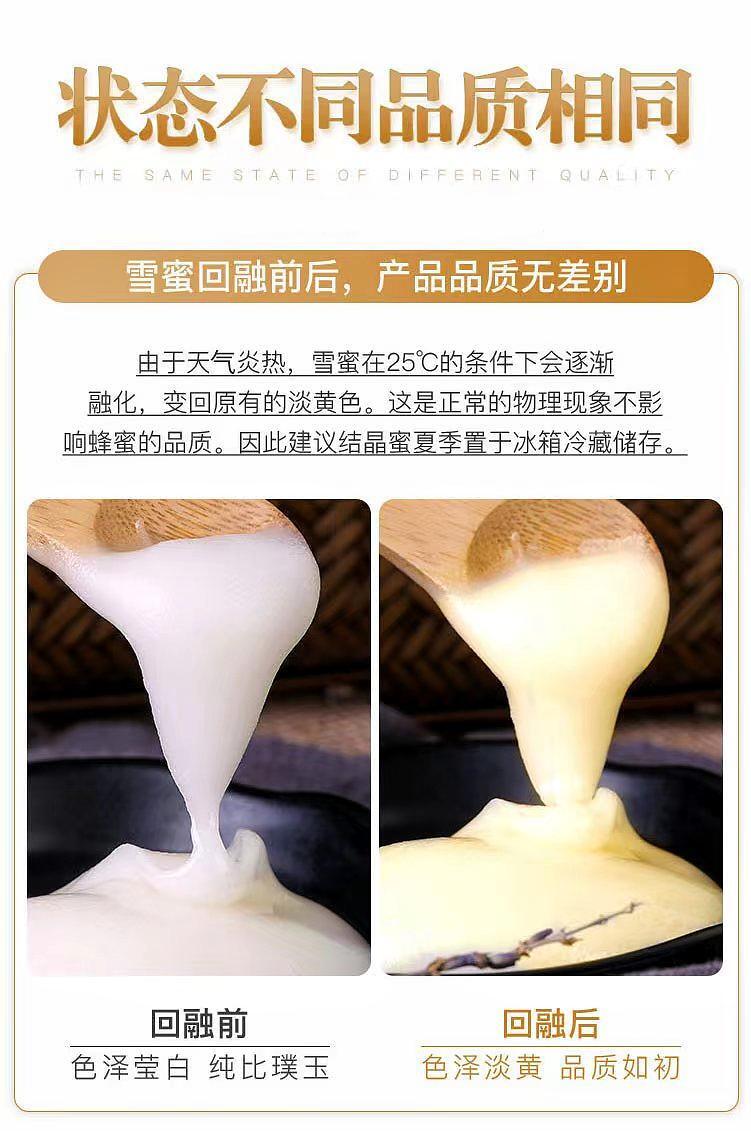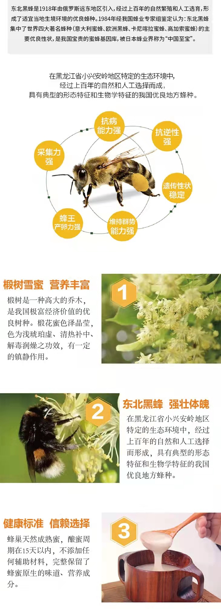 特别说明:进入12月份后,之前回容后的蜂蜜又进入膏状形态,黑蜂椴树蜜膏状颜色由白变成淡黄色,这是高纯度古椴树蜜自然的物理变化,也是品质如一、营养均衡的具体表现,观众朋友们可以放心食用。