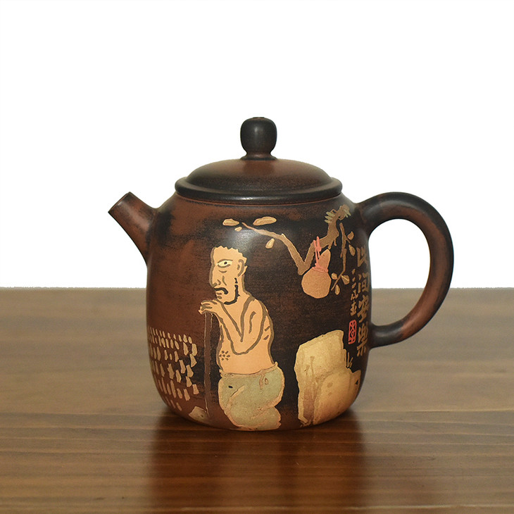 三金,本名李鑫,启正陶社社员,2010年在朝阳楼跟随半根先生学习制壶。三金制陶随性而发,平淡天真,器型古朴,装饰淡雅,常作闲人、傻鱼、呆僧图饰······生趣盎然。制陶应是玩,不作高态,能让喜欢的人观之用之心生愉悦,便是乐事。虽有不足,但制陶路漫漫,坚持下去,必有所收获。